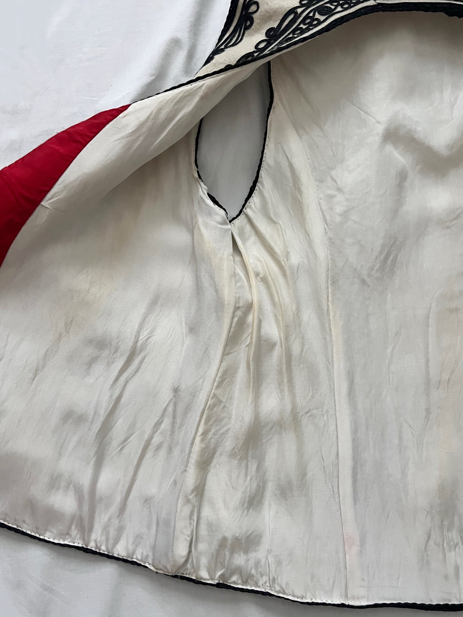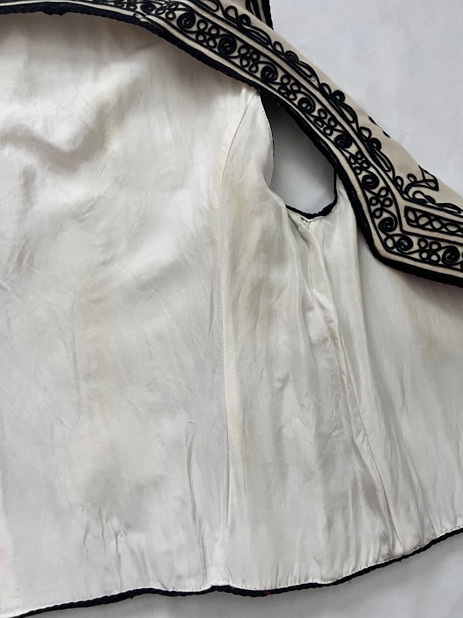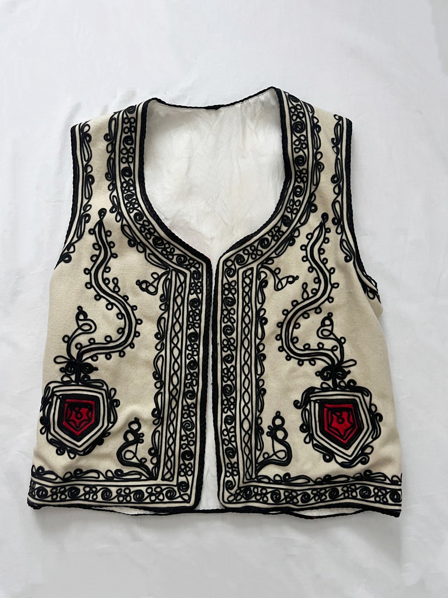 A wool felted vest in cream with intricate traditional embroidery in black and red on the front and back. The vest is lined with white fabric with red fabric on the front edges.
