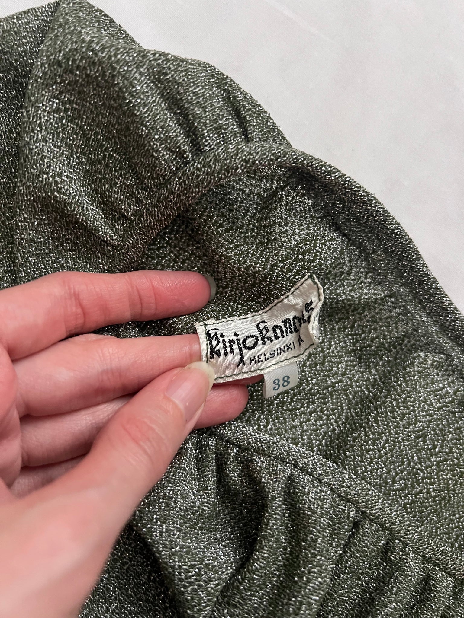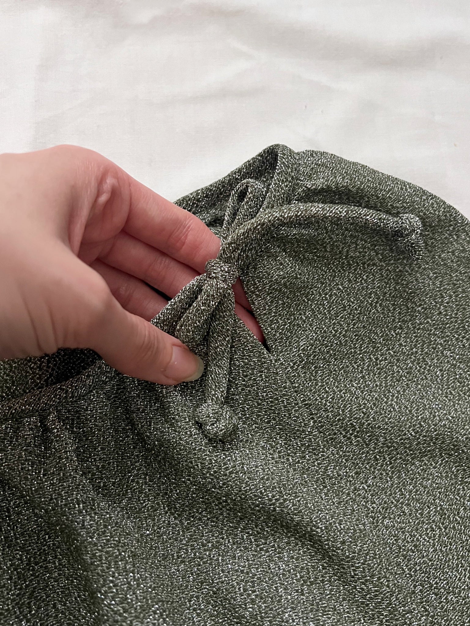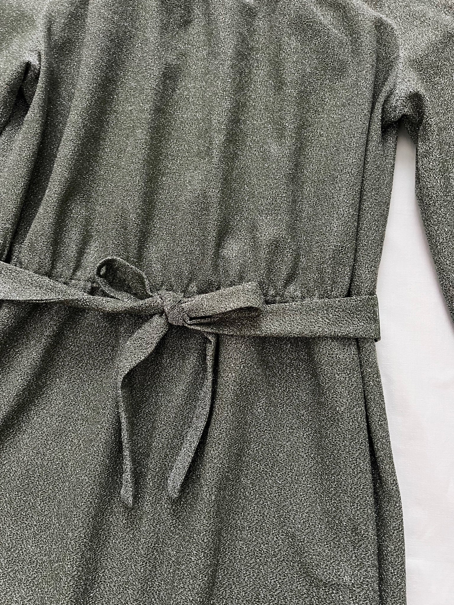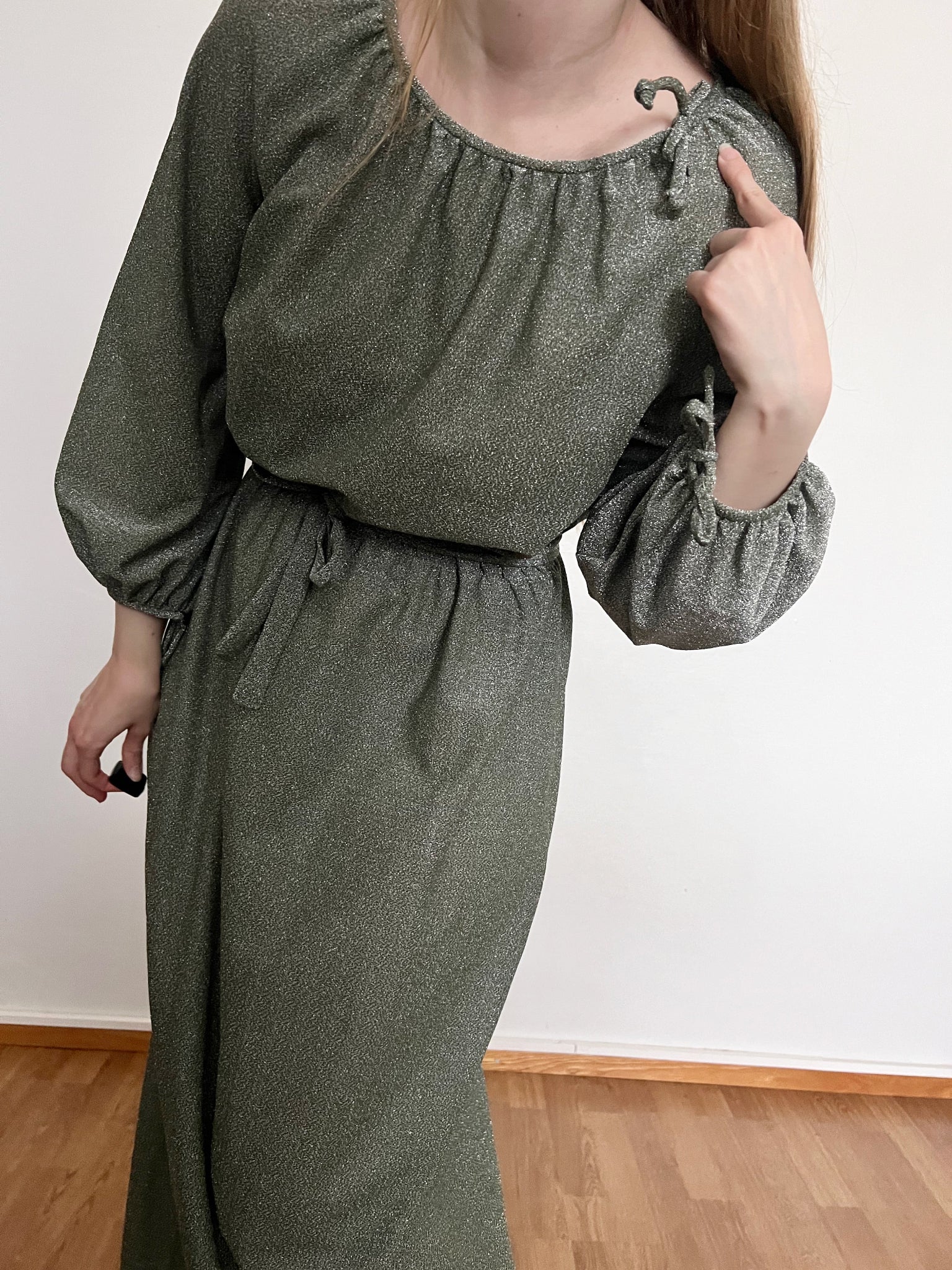 A sparkly silver maxi gown. The dress has a loose, flowing silhouette with a gathered neckline with a small cutout and bow detail, long sleeves that are cinched at the wrists. The waist is defined by a matching fabric belt that ties in the front, the belt is wider at the back.