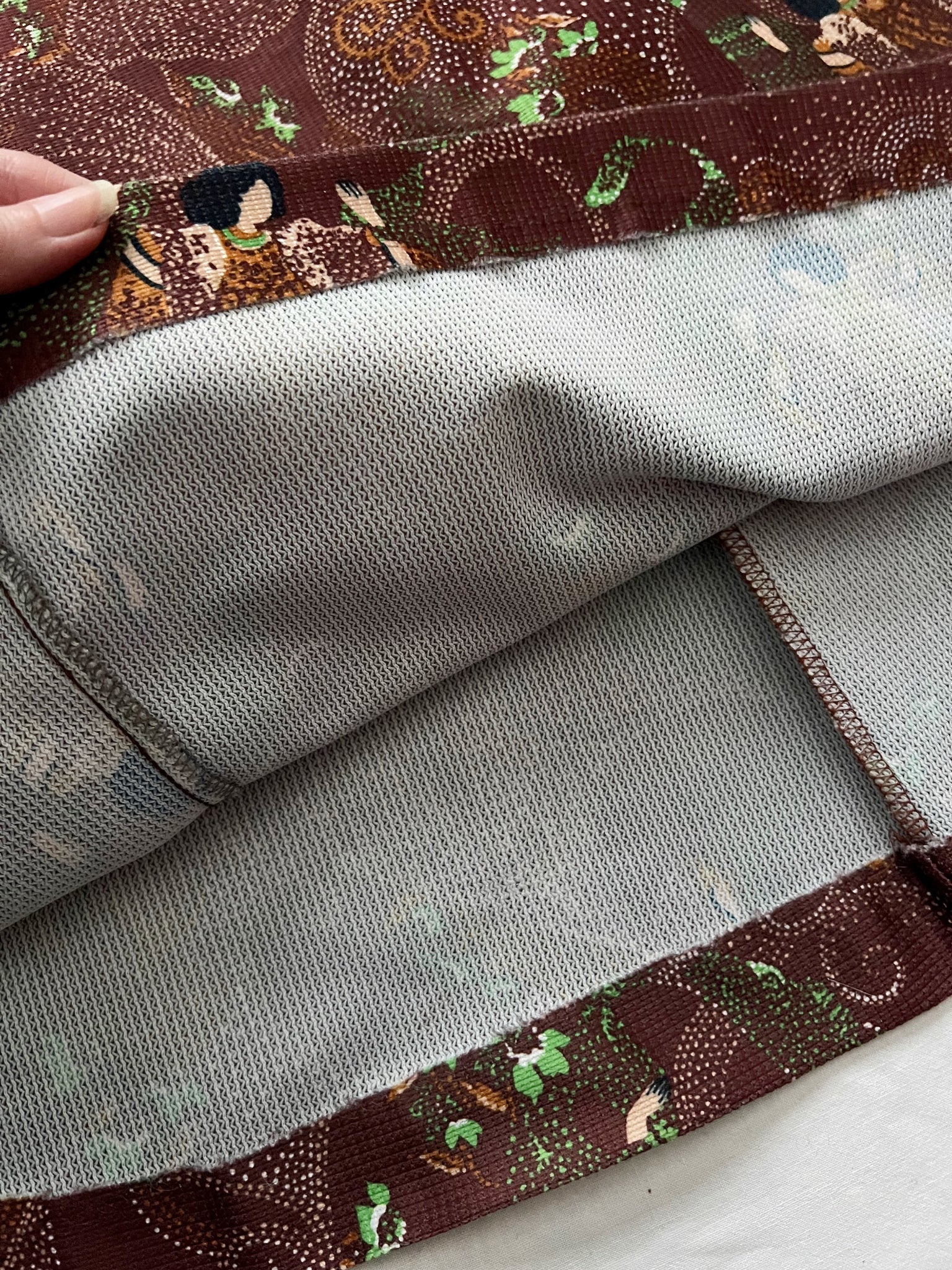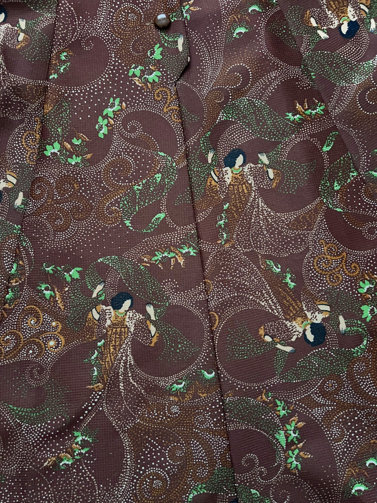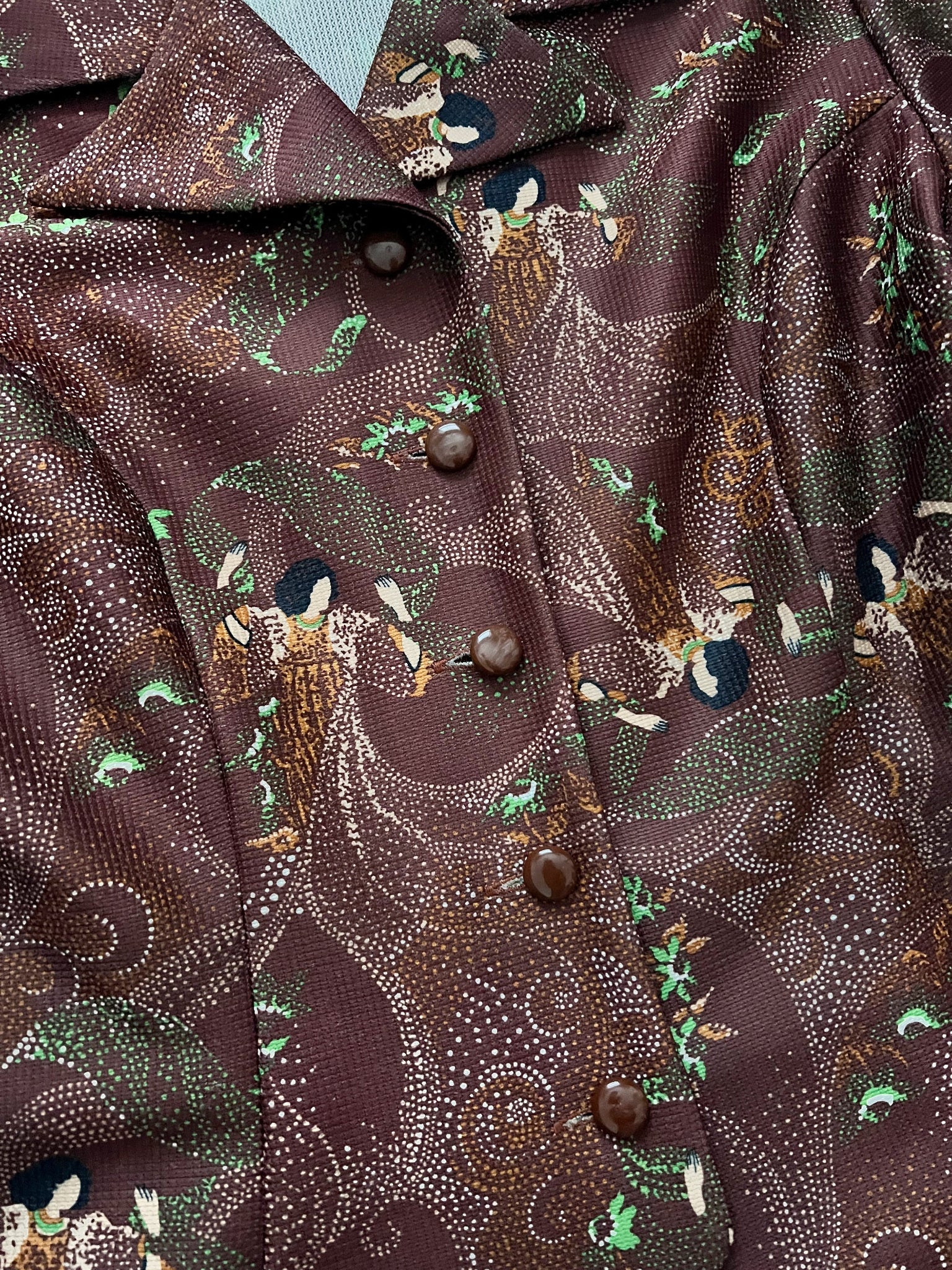 A brown knee length, long sleeved dress with a pointed collar and brown buttons down the front. The bodice is fitted and flares into an A-line skirt. The dress has a pattern of swirling, intricate designs with a mix of earth tones and subtle pops of color around illustrated women.