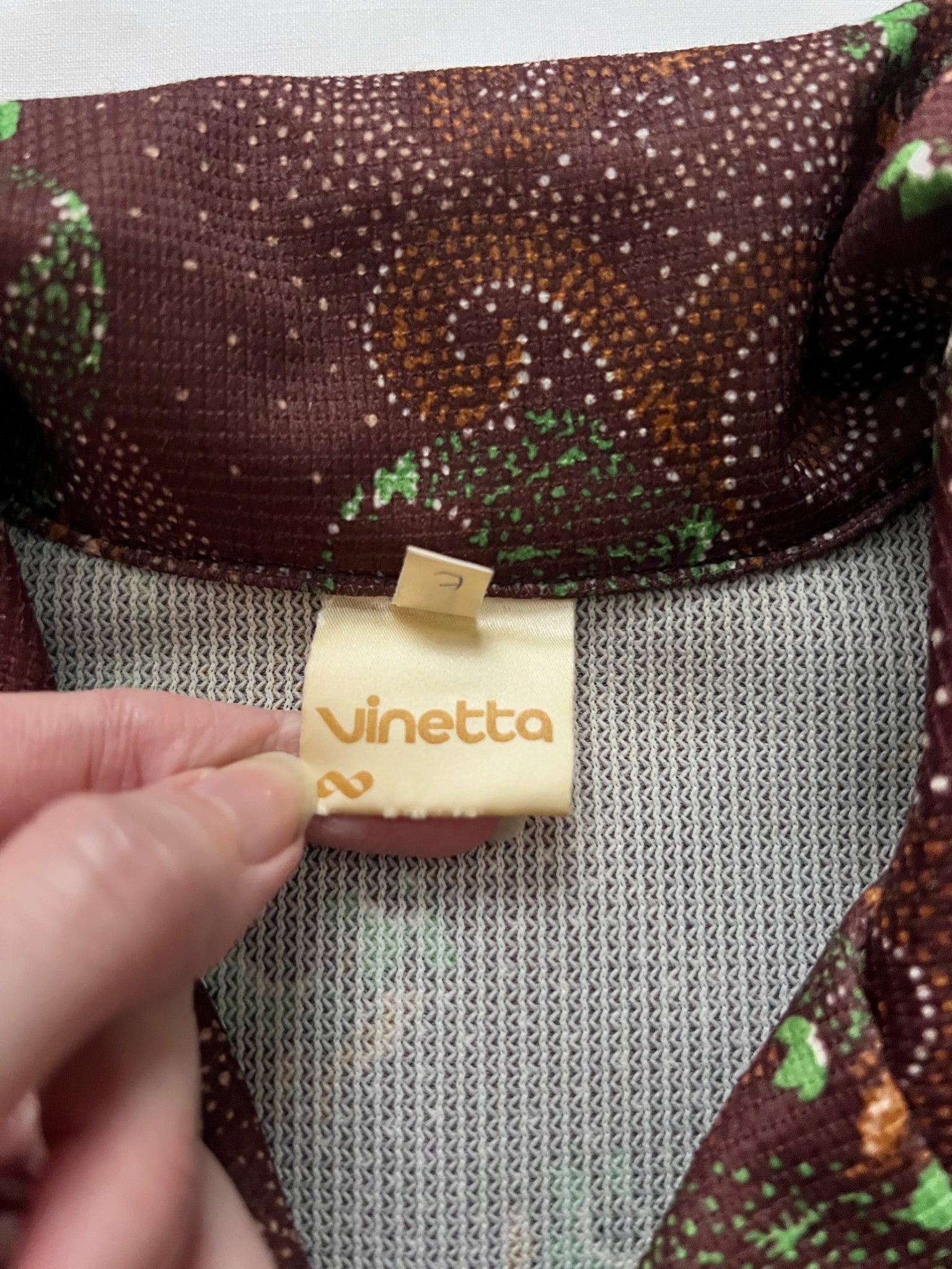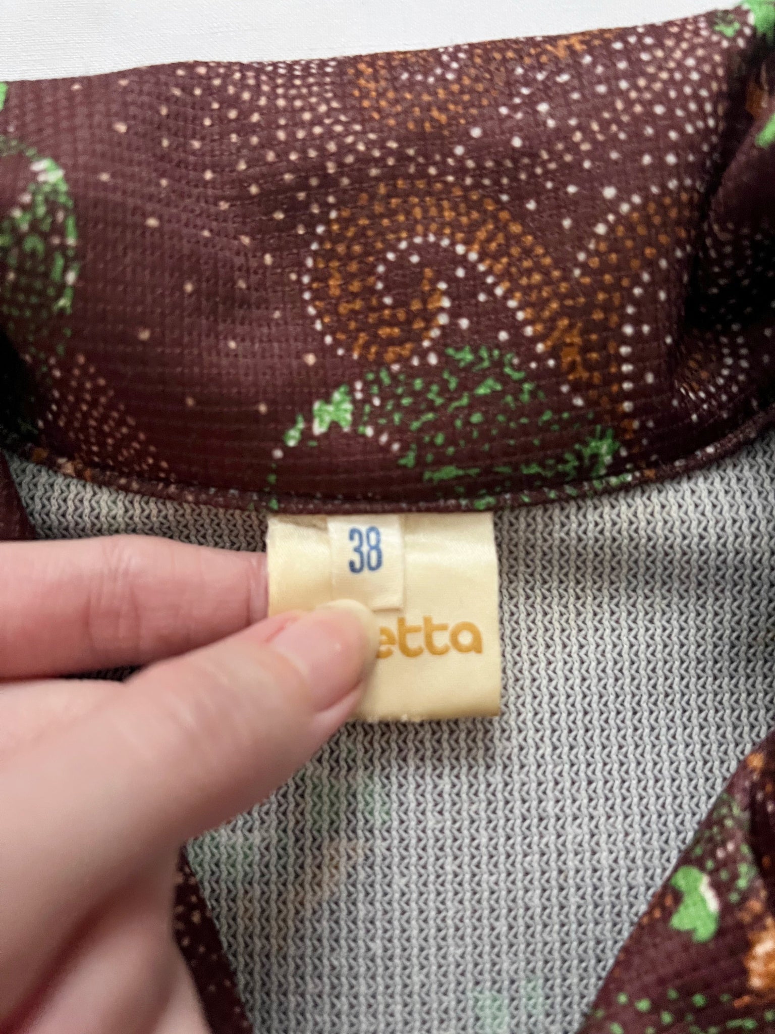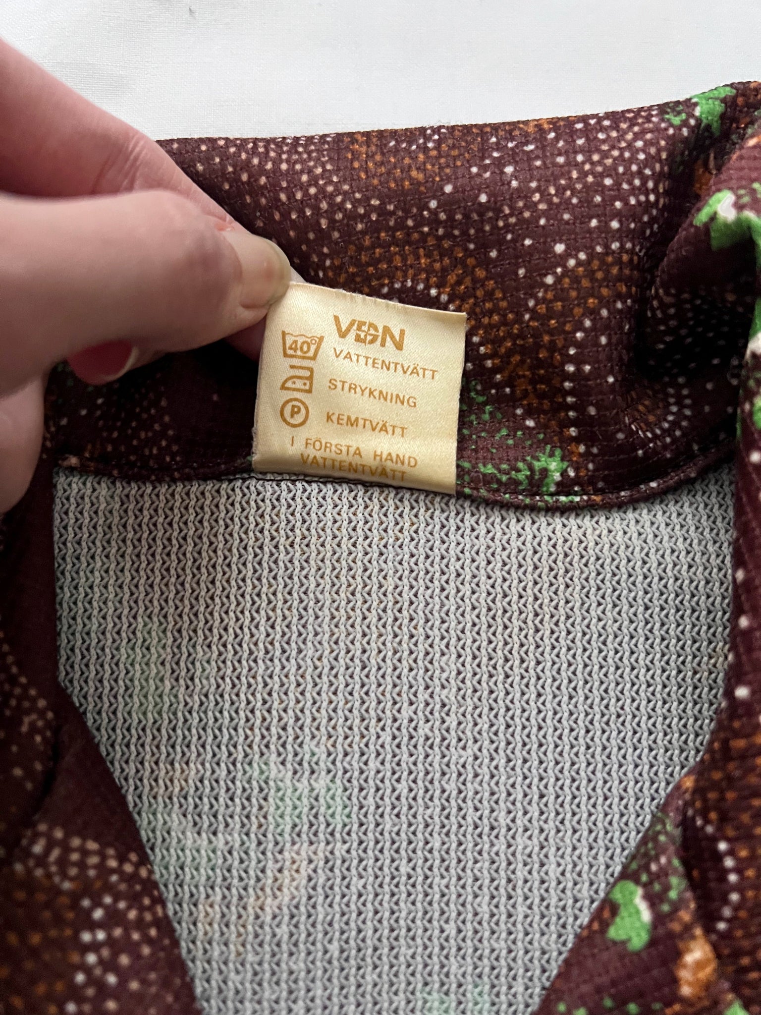 A brown knee length, long sleeved dress with a pointed collar and brown buttons down the front. The bodice is fitted and flares into an A-line skirt. The dress has a pattern of swirling, intricate designs with a mix of earth tones and subtle pops of color around illustrated women.