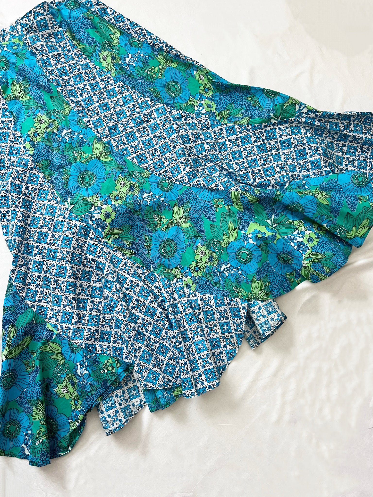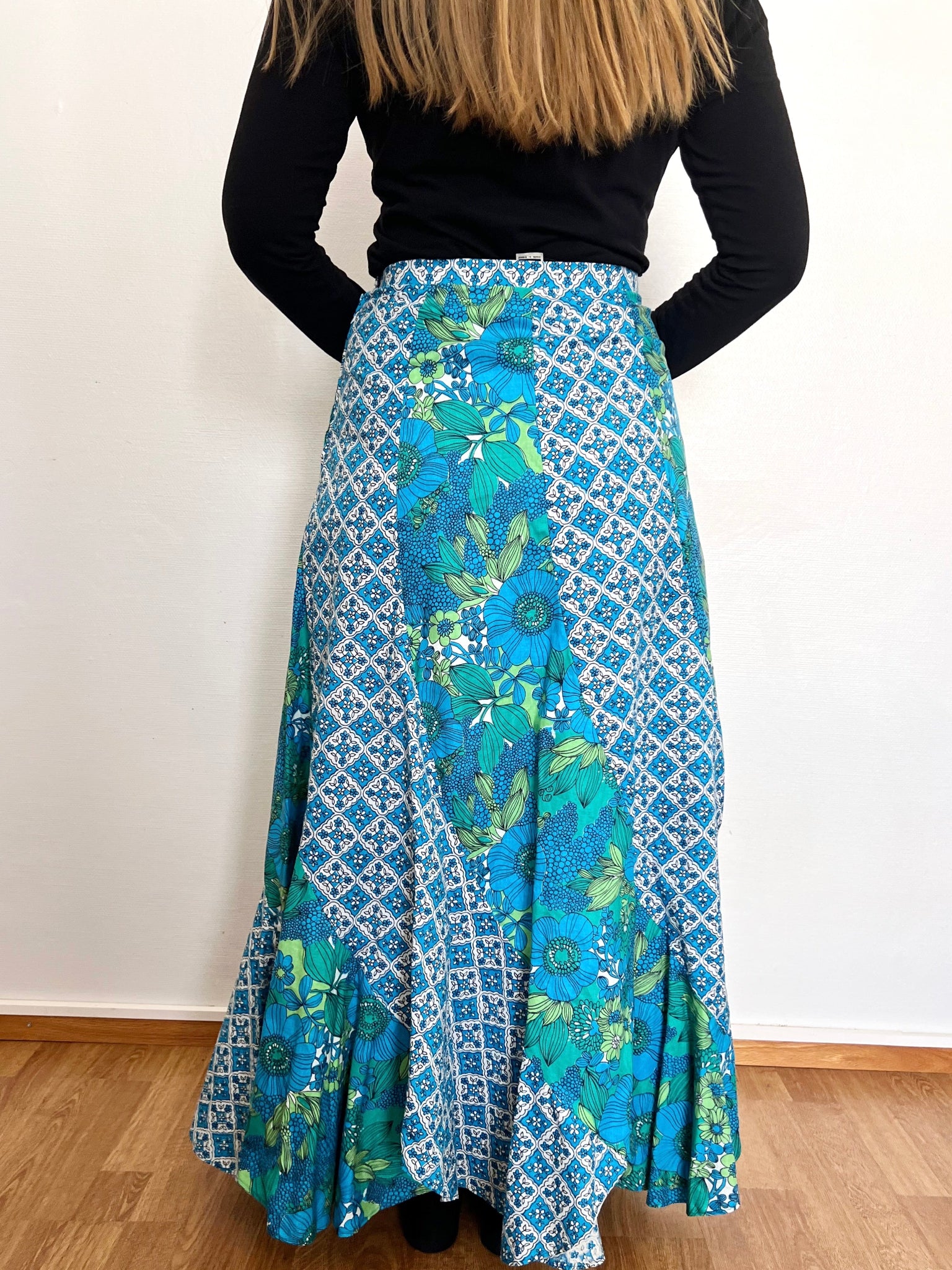 A long flowing skirt with a patchwork design, one with a floral print, and one with a geometric tile pattern. The skirt has a zipper.