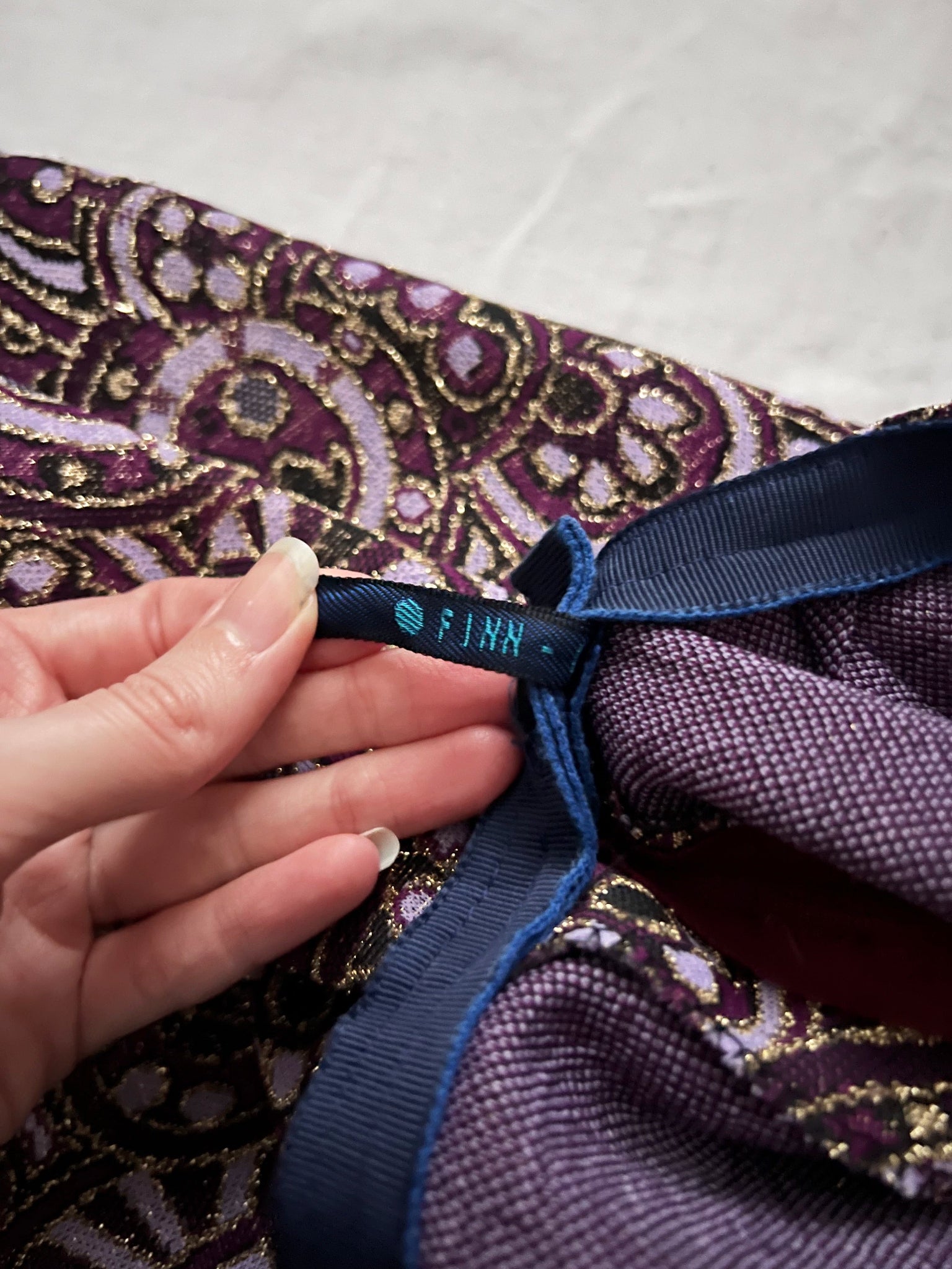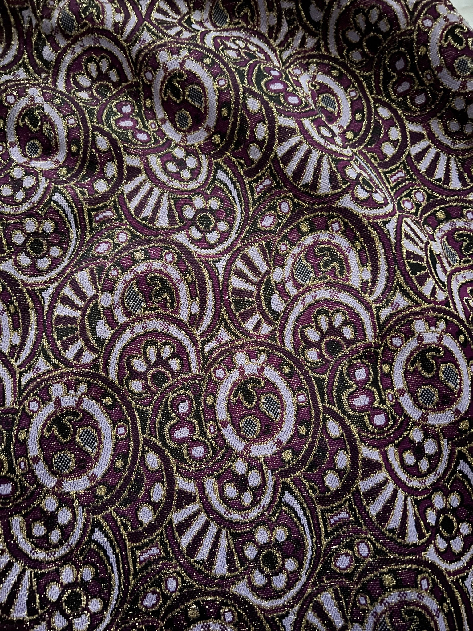 A long A-line skirt with a design of intricate, repeating motifs in shades of purple, with touches of gold that give it a slightly shimmering look. The skirt has a slit, and a zipper.
