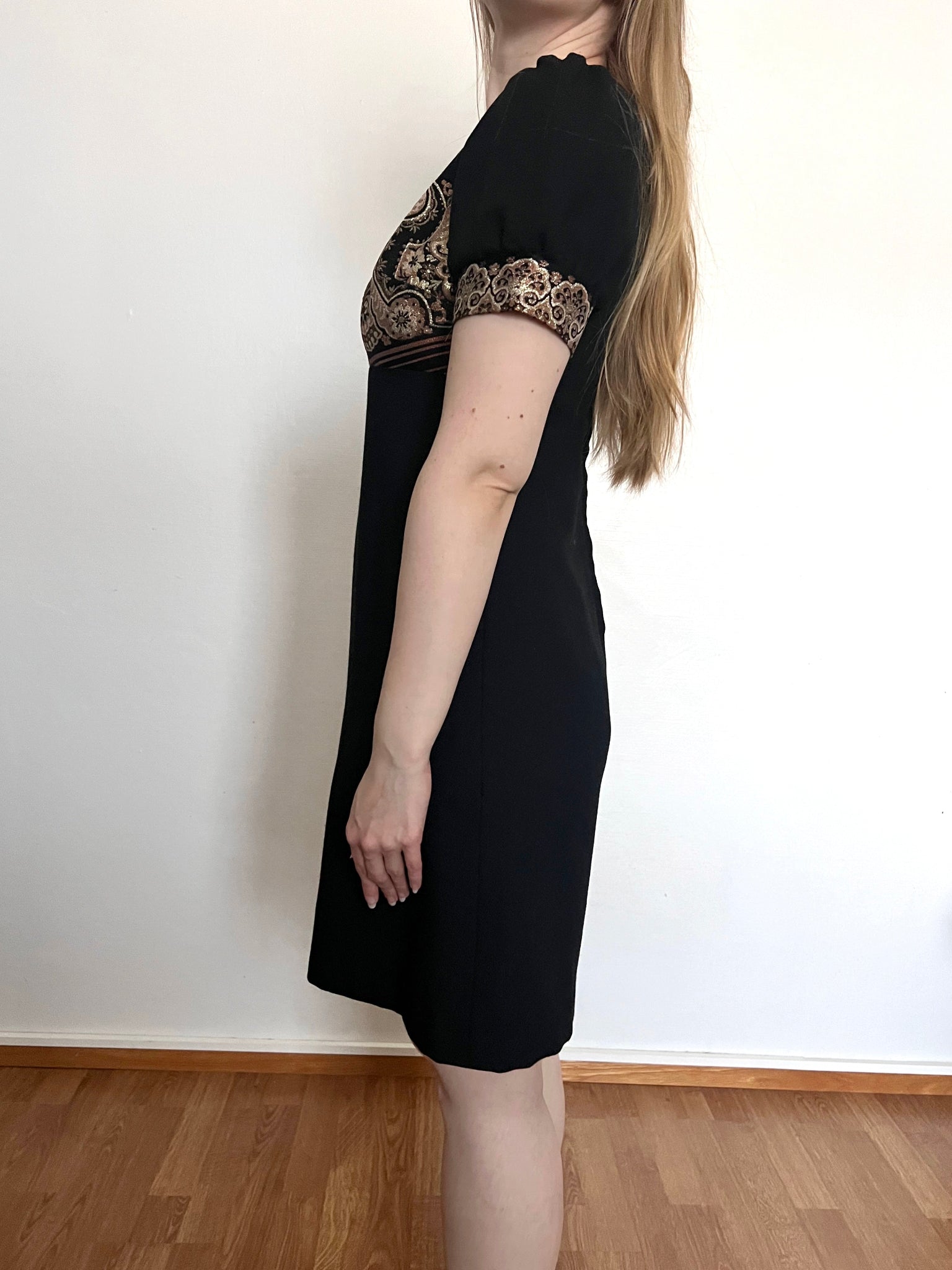 A knee length A-line black dress with a shimmery bronze/gold ornate panel across the chest and the sleeve cuffs. The neckline is wide and squared, the sleeves are puffed, and the dress has a back zipper.