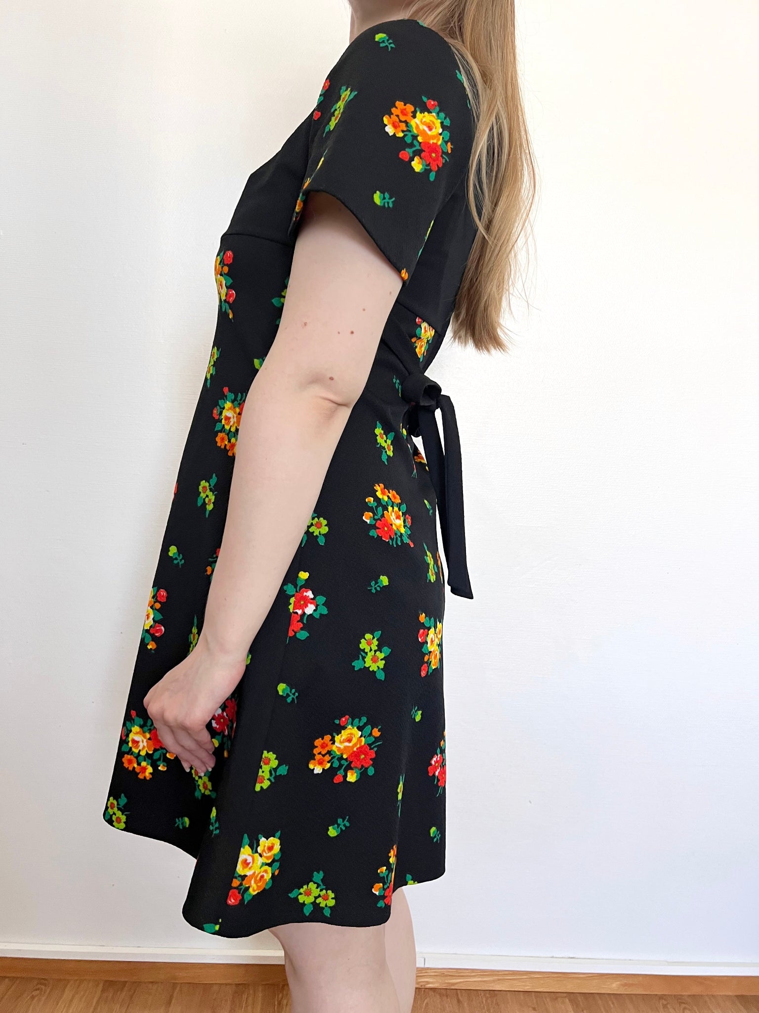 60s black flower dress, Size S