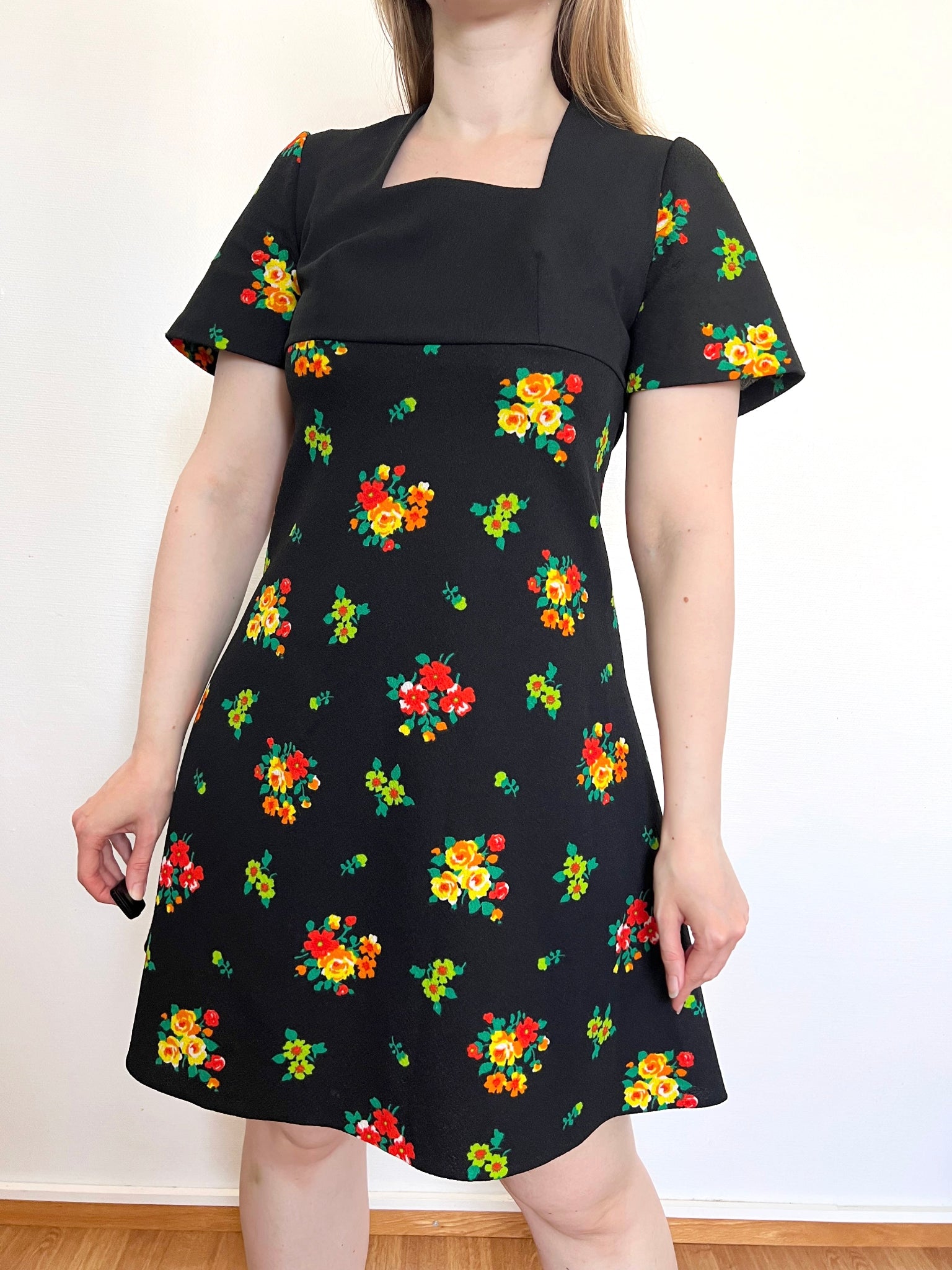 A 60s short sleeved, A-line mini dress with a black background with a vibrant floral print. The bodice has a square neckline, a black belt to tie a bow in the back, and a back zipper.
