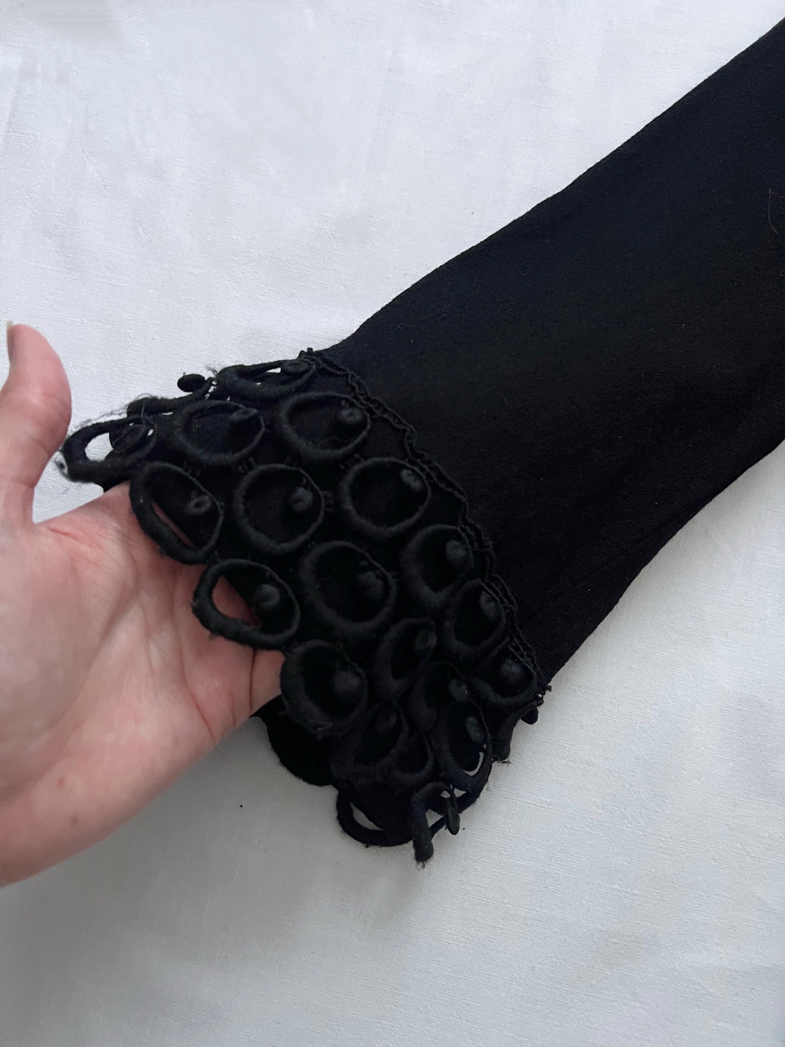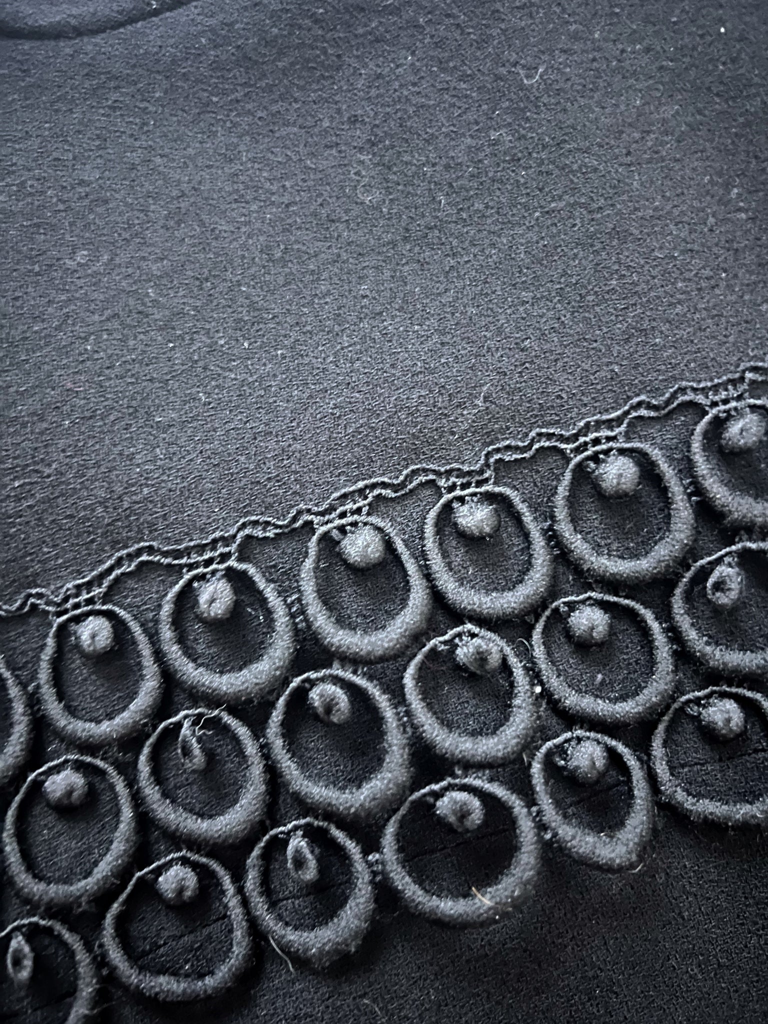A knee length black dress with three-quarter sleeves, and unique decorative trim of circular, looped fabric patterns across the upper chest and around the sleeve cuffs. The dress has a back zipper.