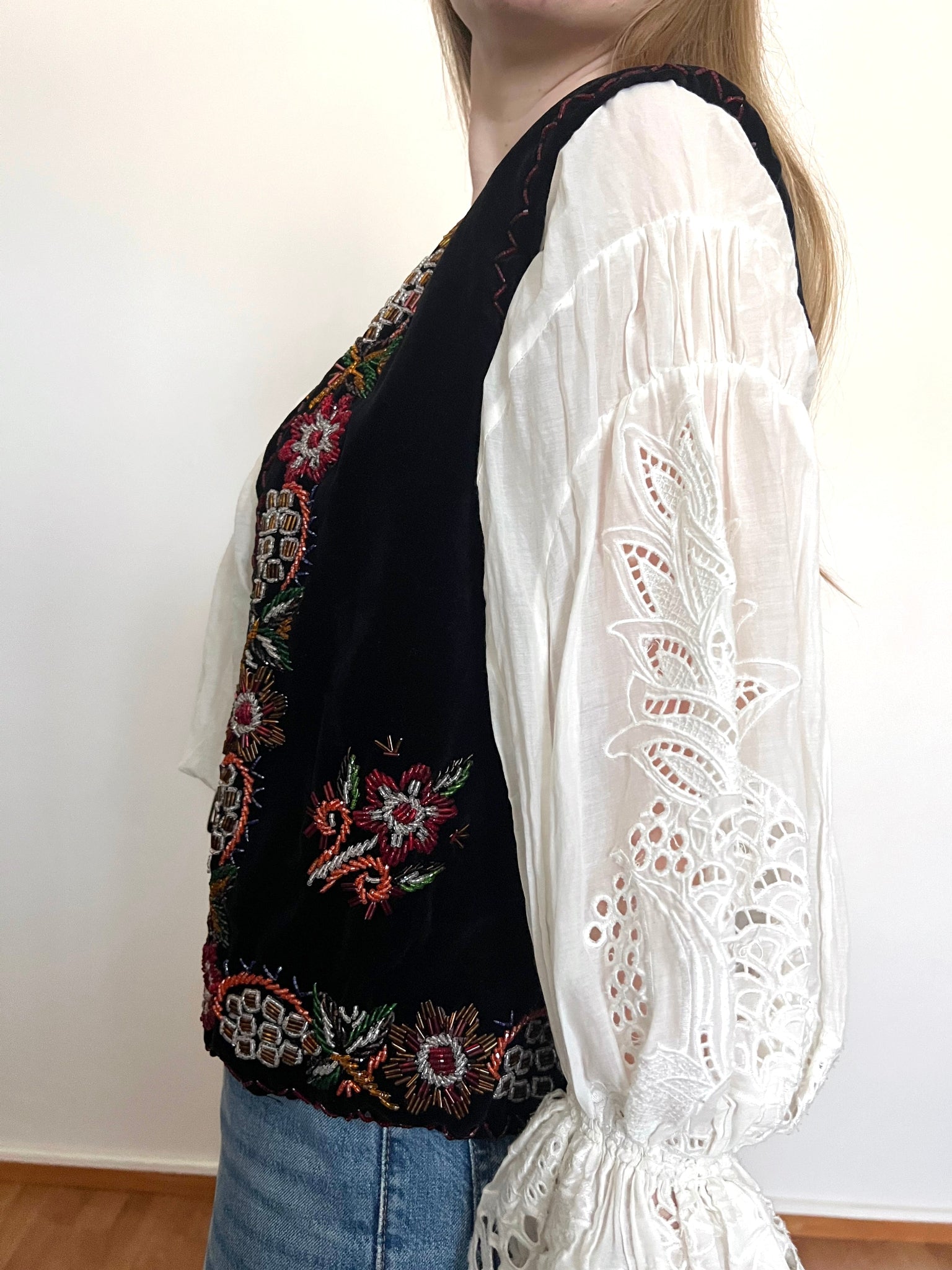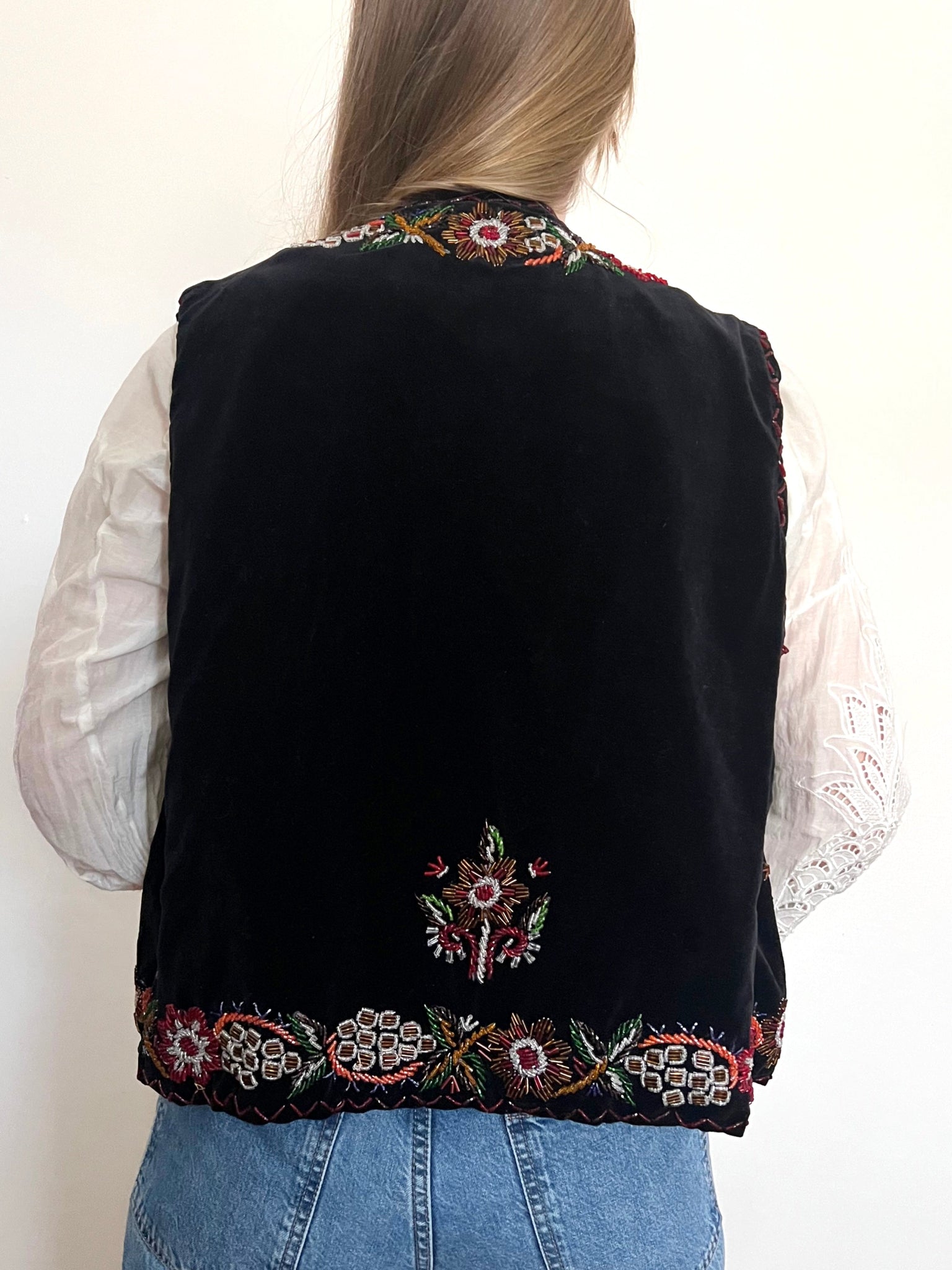 A black velvet vest decorated with stunning and intricate beaded design both on the front, sides, and back of the vest.