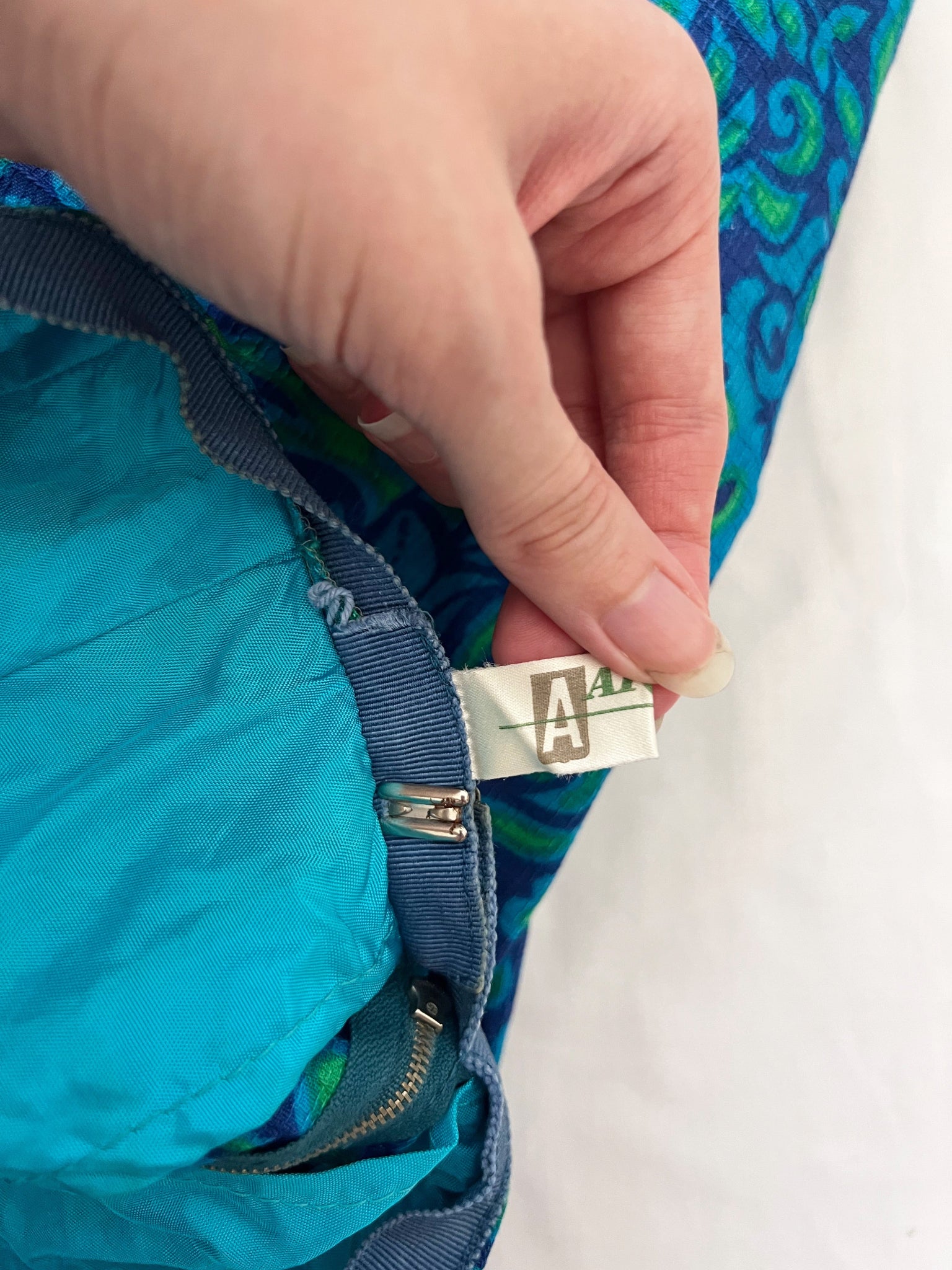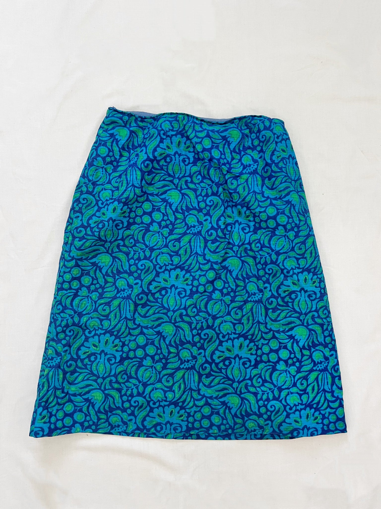 A knee length blue skirt with a classic 60s groovy pattern. The skirt has a back zipper.