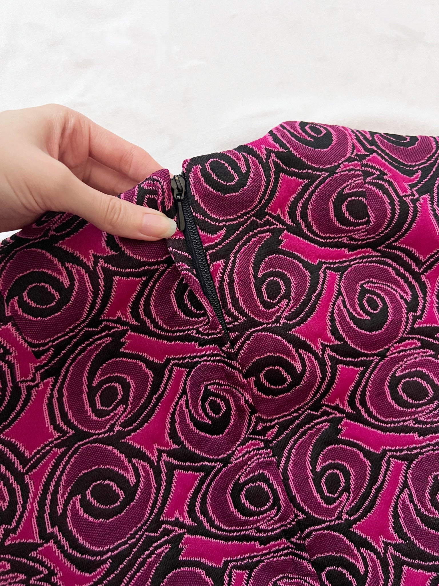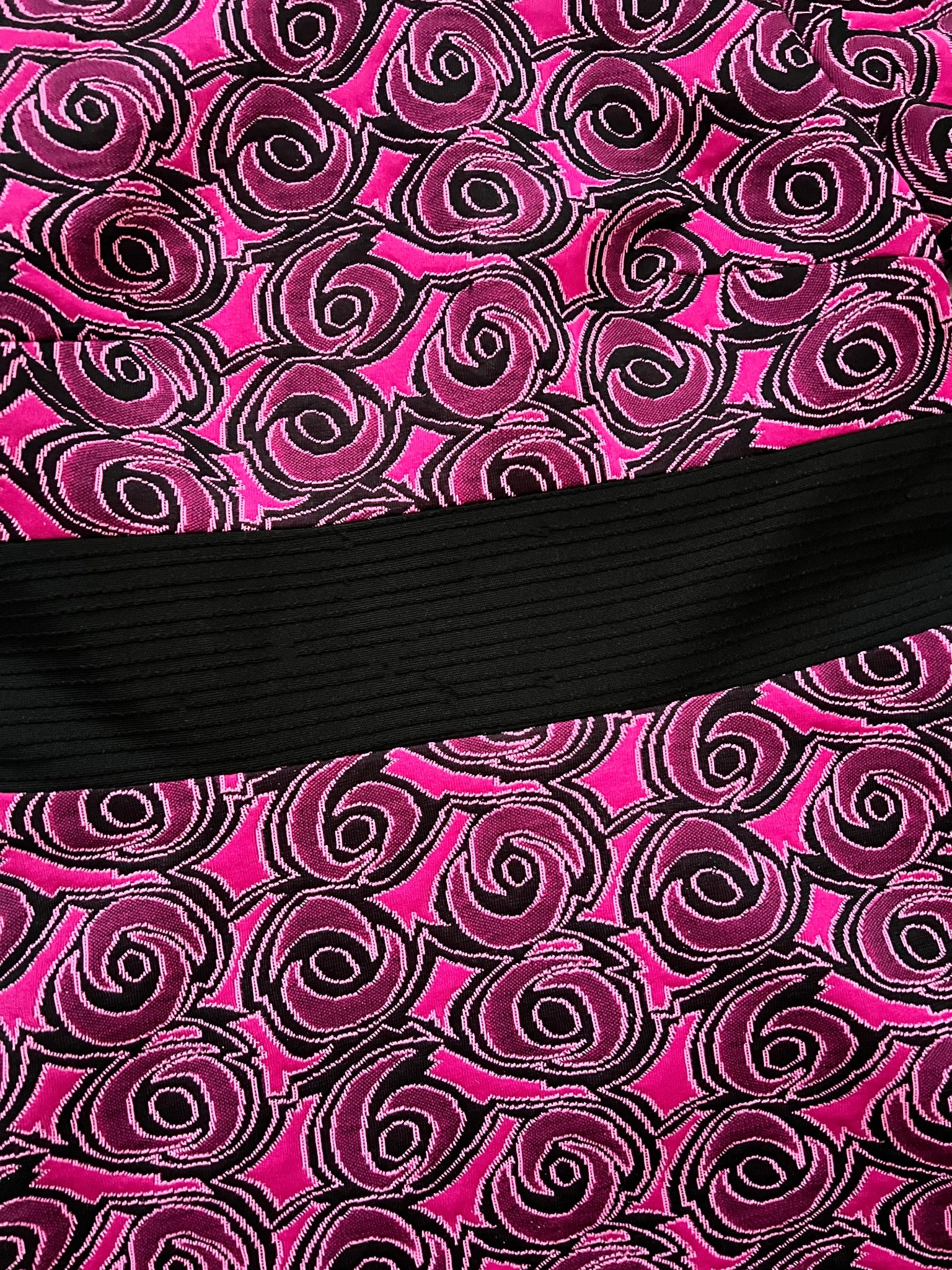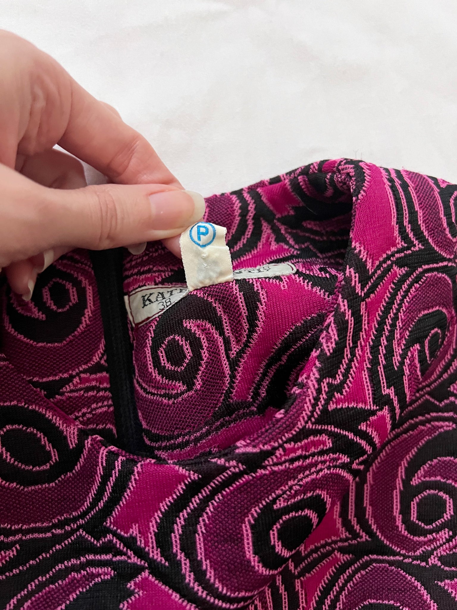 A short mini dress with a bold swirling black pattern design on a magenta background. The waist is accentuated by a wide, ribbed black band. The same ribbed black band is also at the sleeve cuffs. the sleeve cuffs also have two small decorative buttons in the same fabric as the dress. The dress has a back zipper.