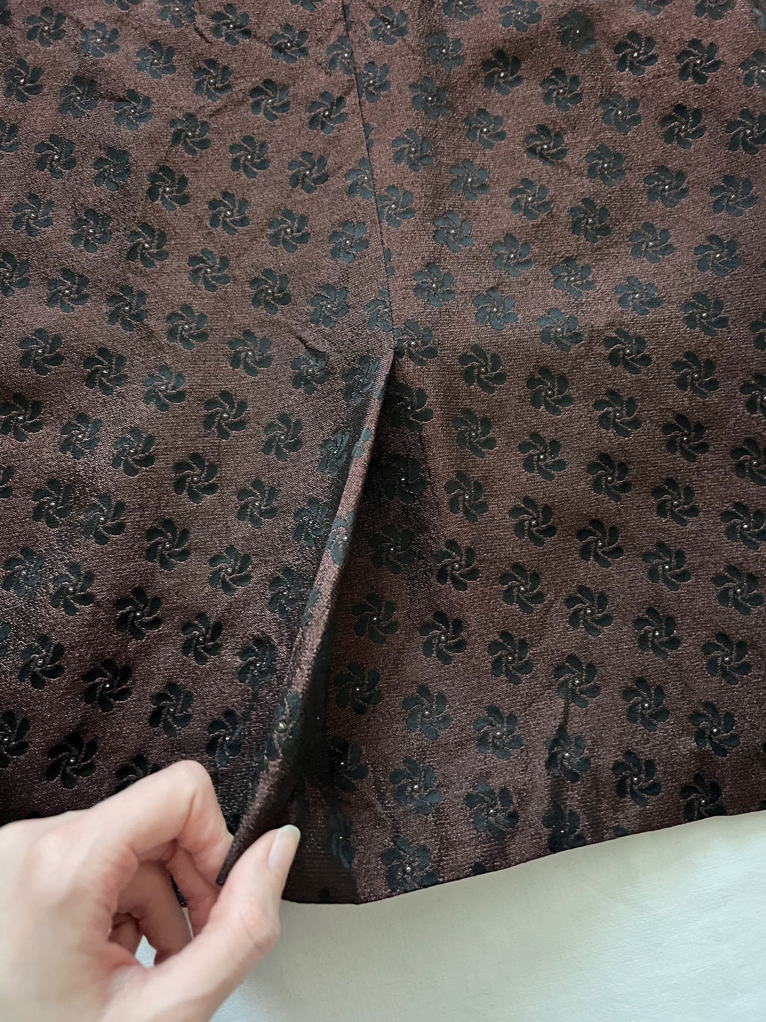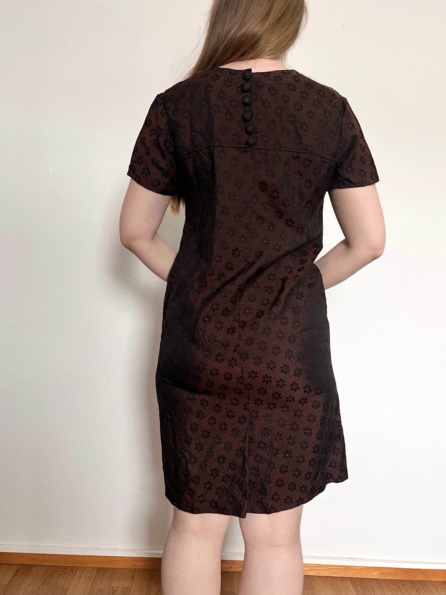 A short sleeved dark brown dress with a pattern of black swirly roses with a small silver dot in the middle. The small silver dot gives the dress a subtle seen. The neckline is rounded and below there is a small rose is the same fabric. At the back there is decorative buttons in the same fabric.