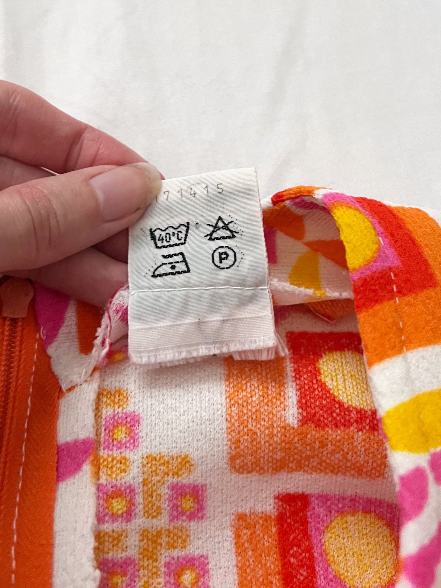 A 60s midi dress with a white backgrund with a pattern of colorful shapes in orange, pink, red, and yellow. At the front there are three decorative matching buttons at the V-neckline. The dress has a back zipper.