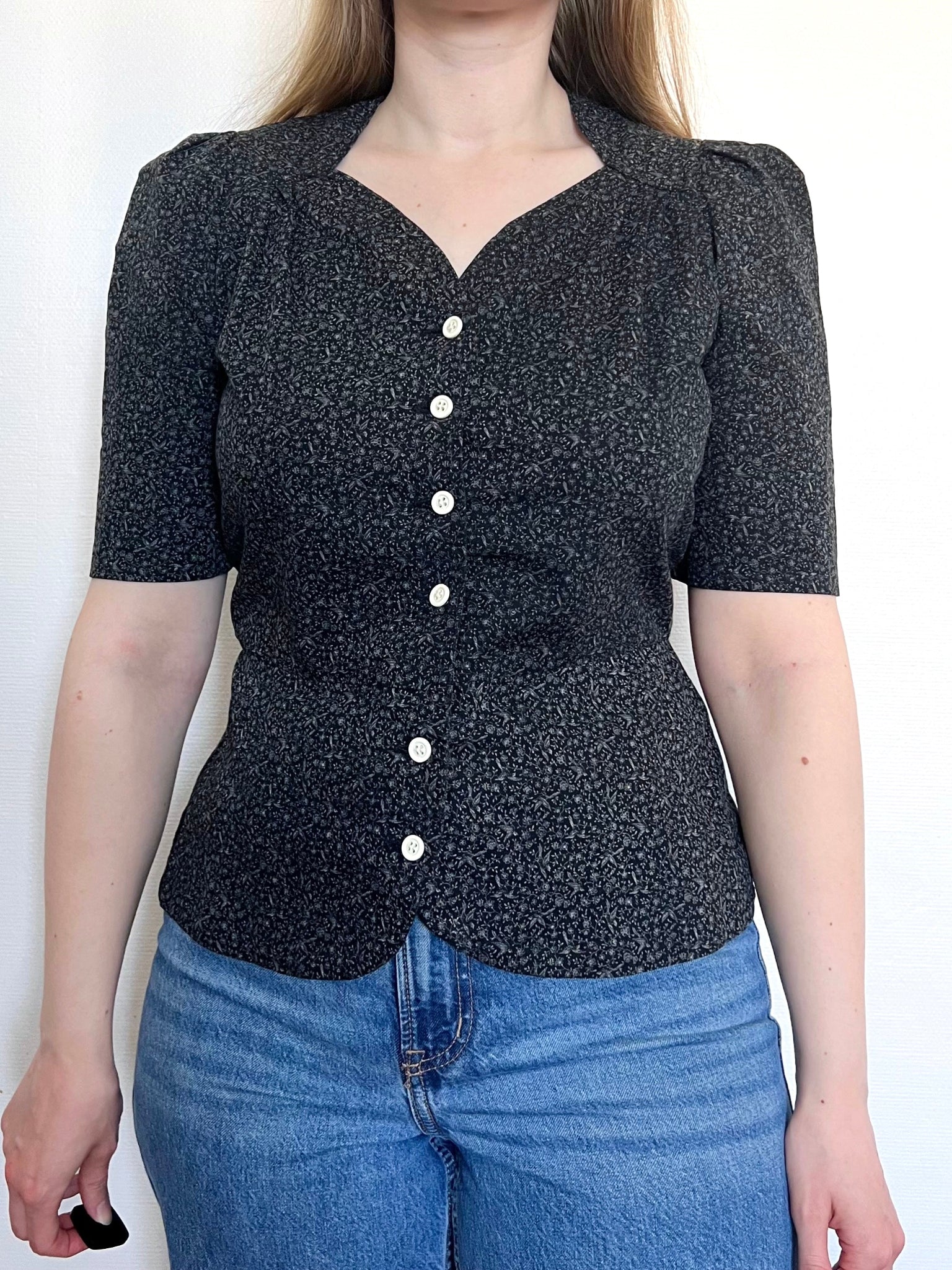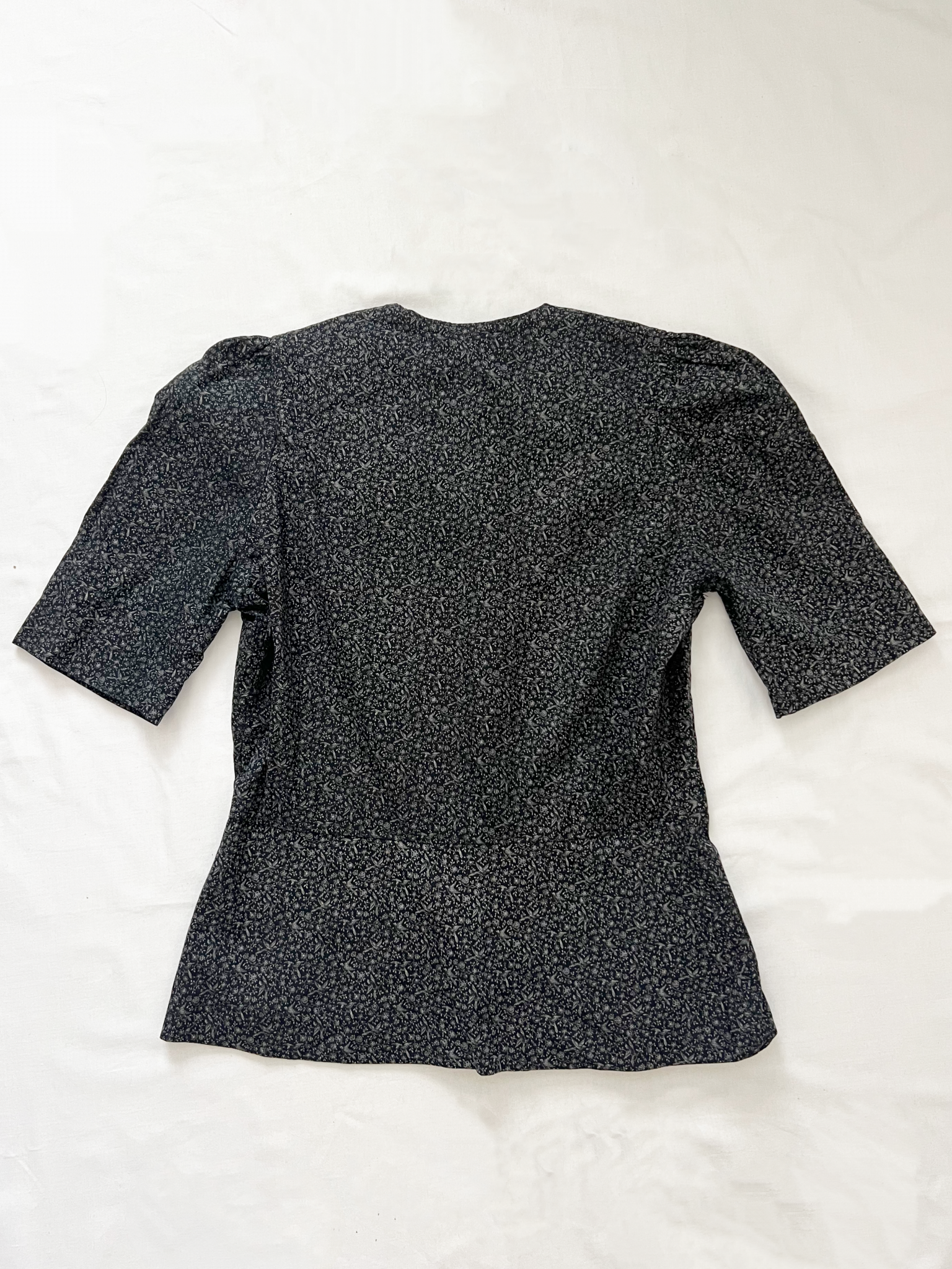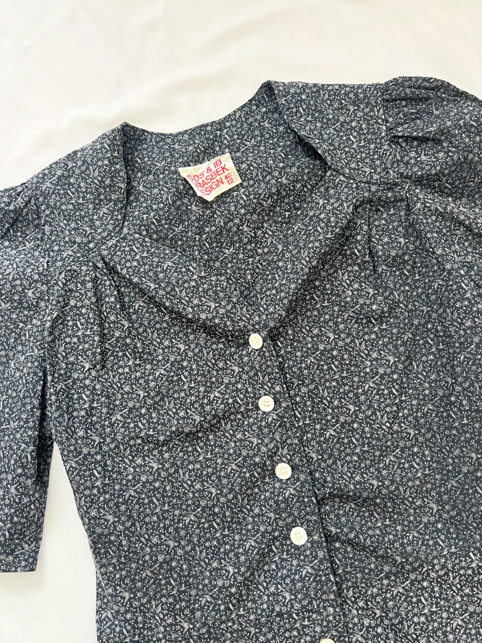 A dark gray t-shirt with a pattern of light gray flowers, and with white buttons. The neckline is sweetheart shape, the waist is accentuated and the sleeves are puffed. Made in Denmark
