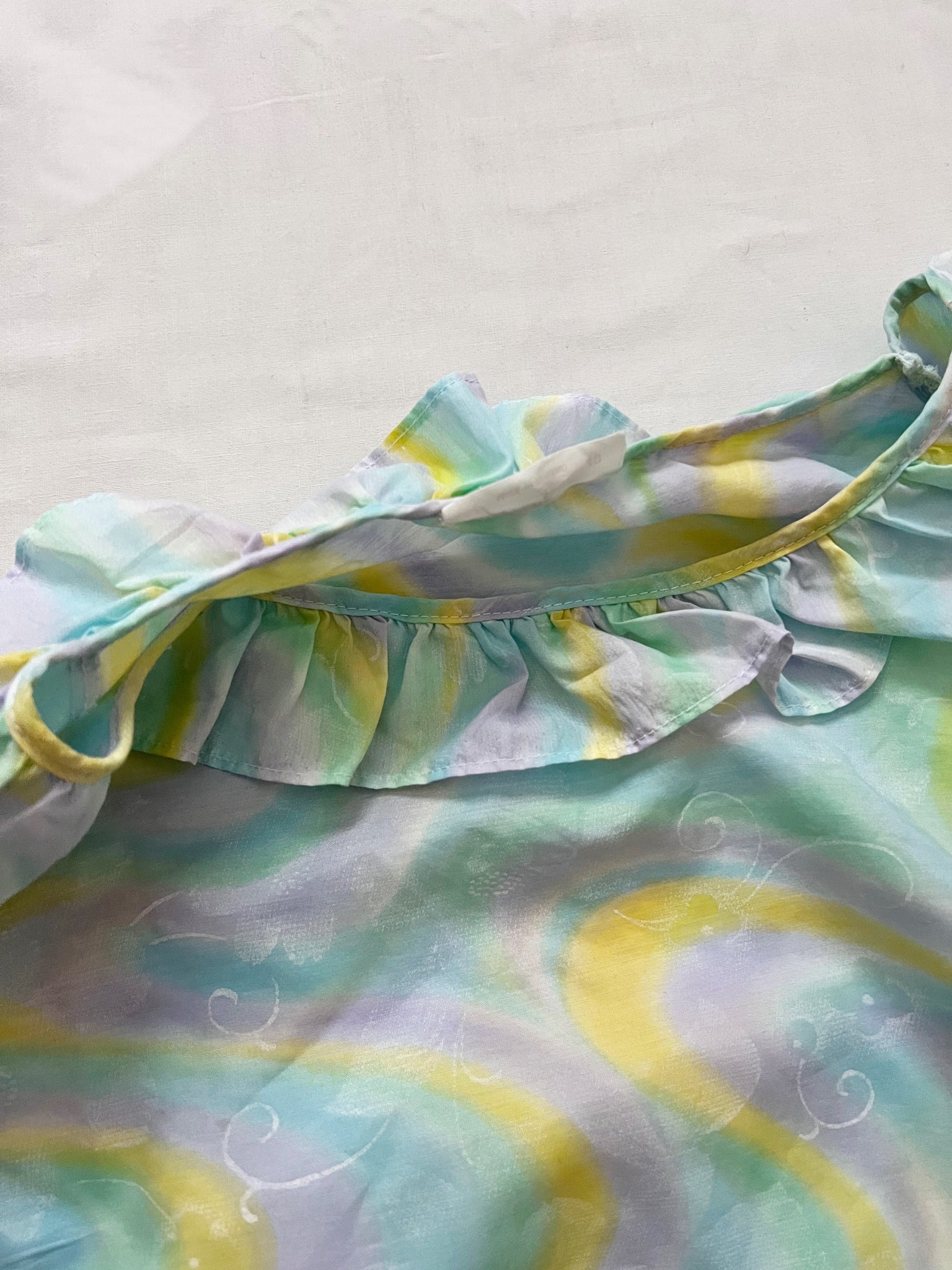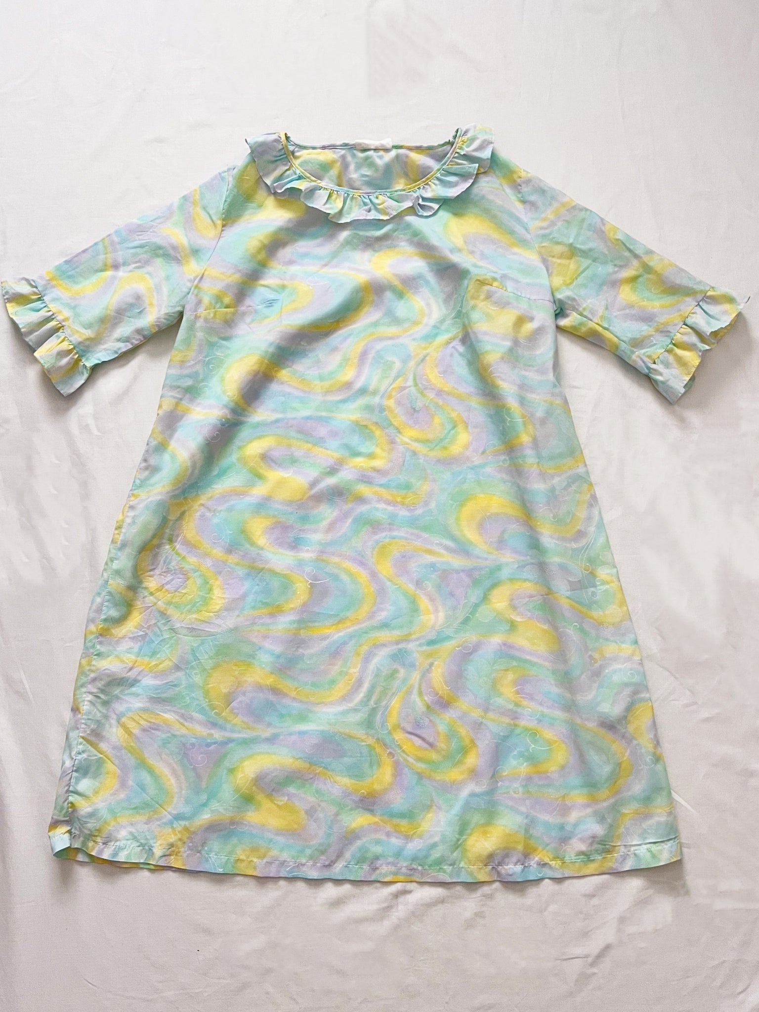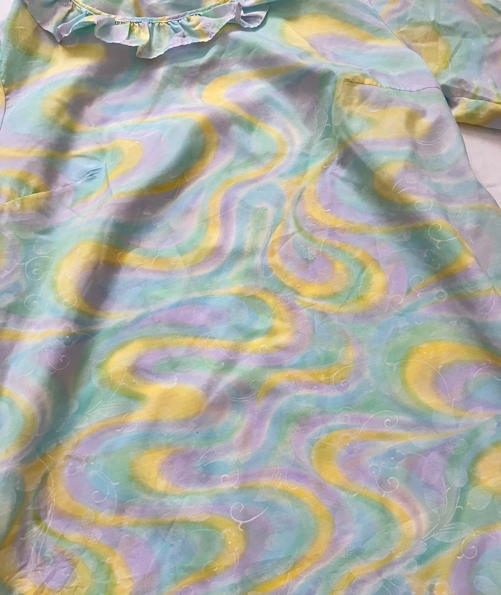 A knee length night gown with a pattern of pastel swirls. The neckline has a small ruffled collar, and the elbow length sleeves are finished with a matching ruffle.
