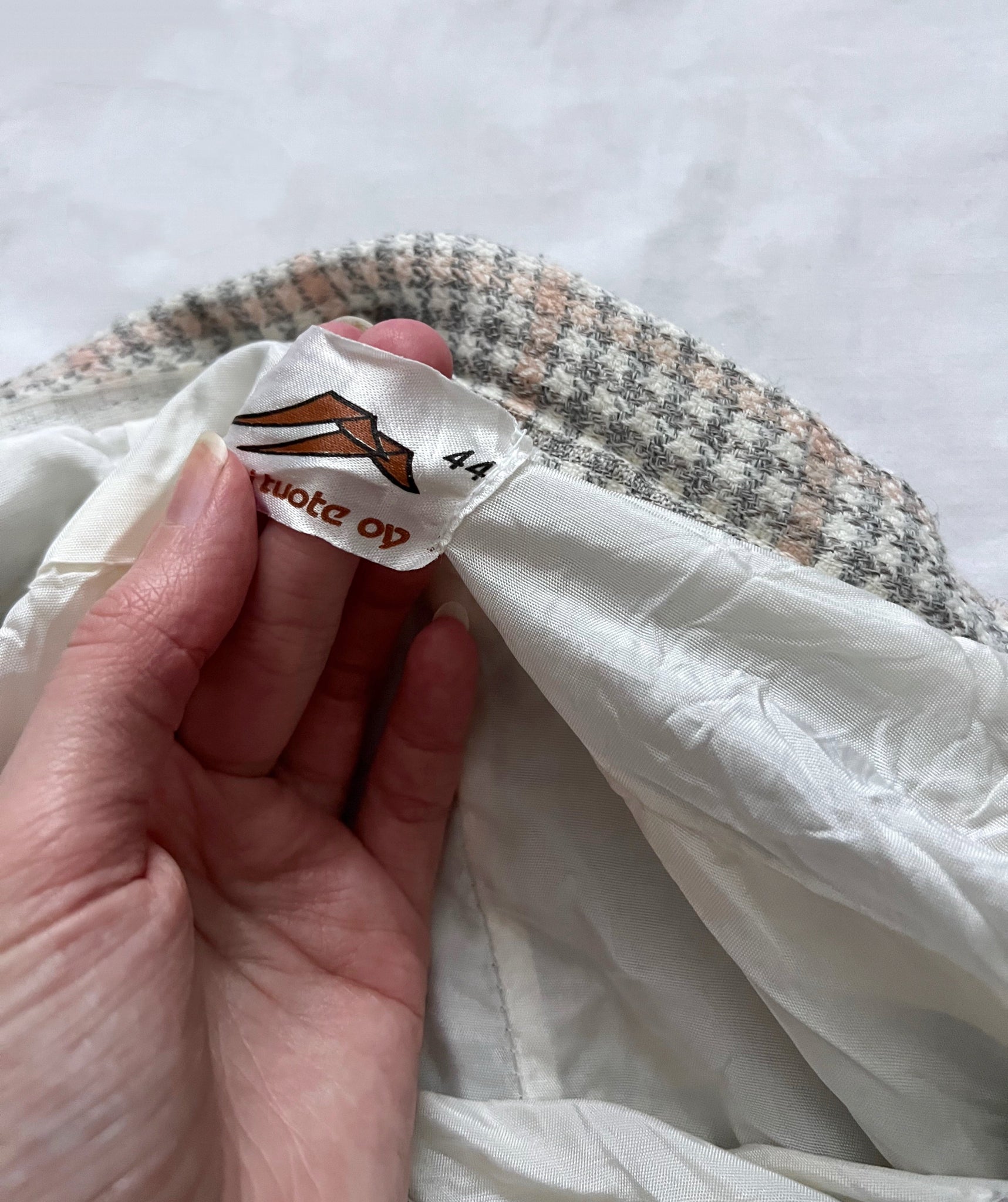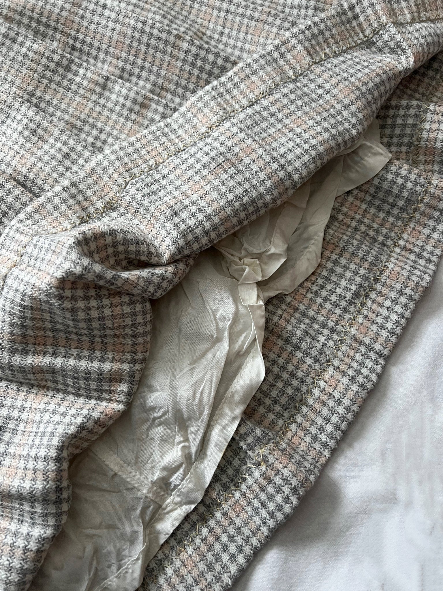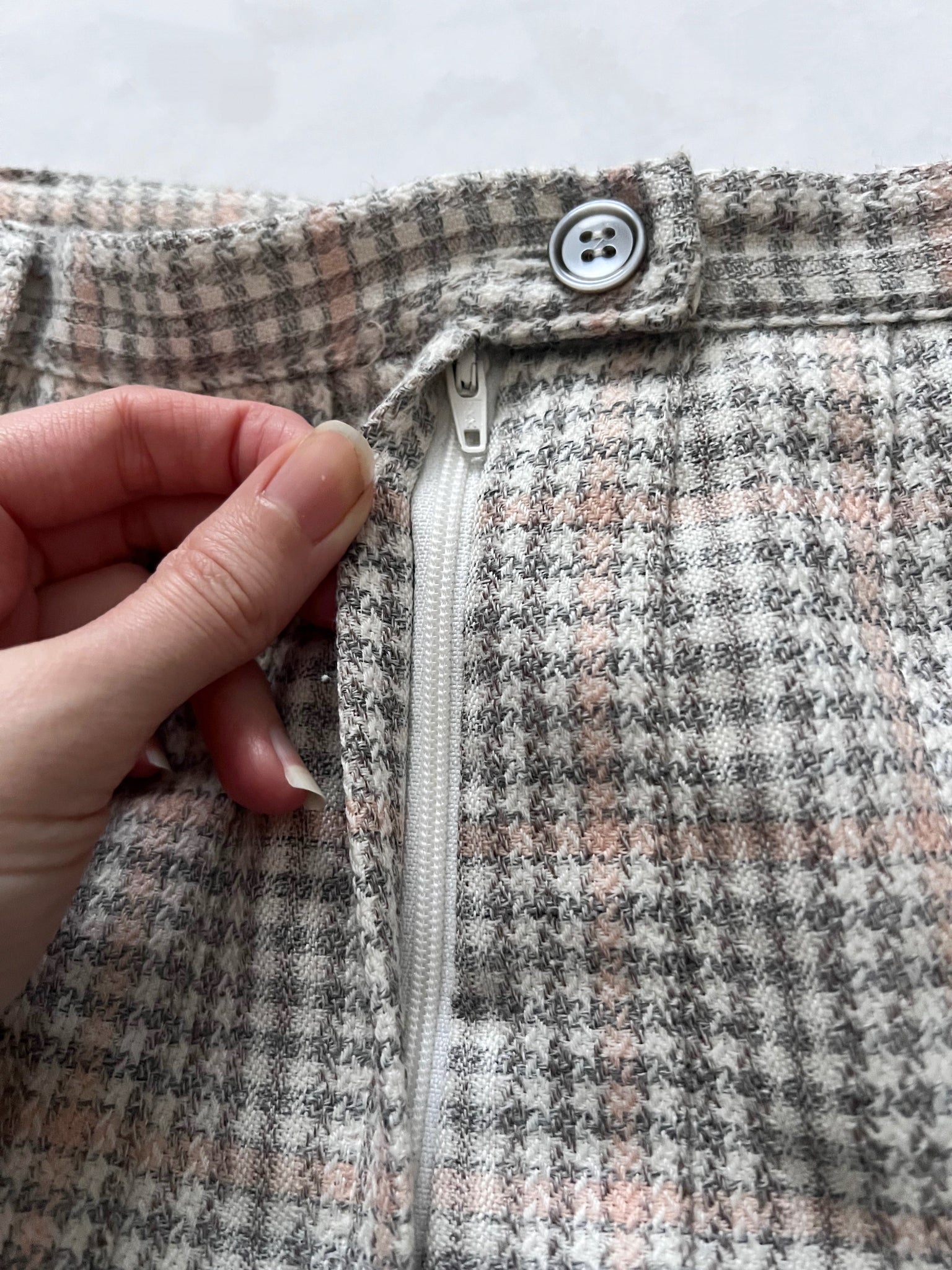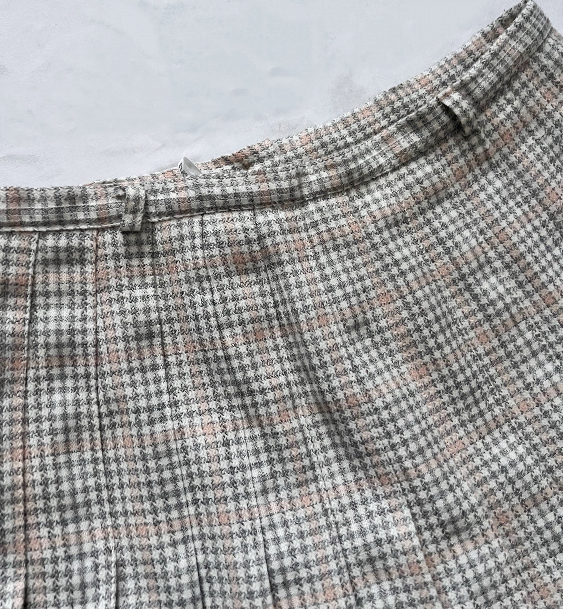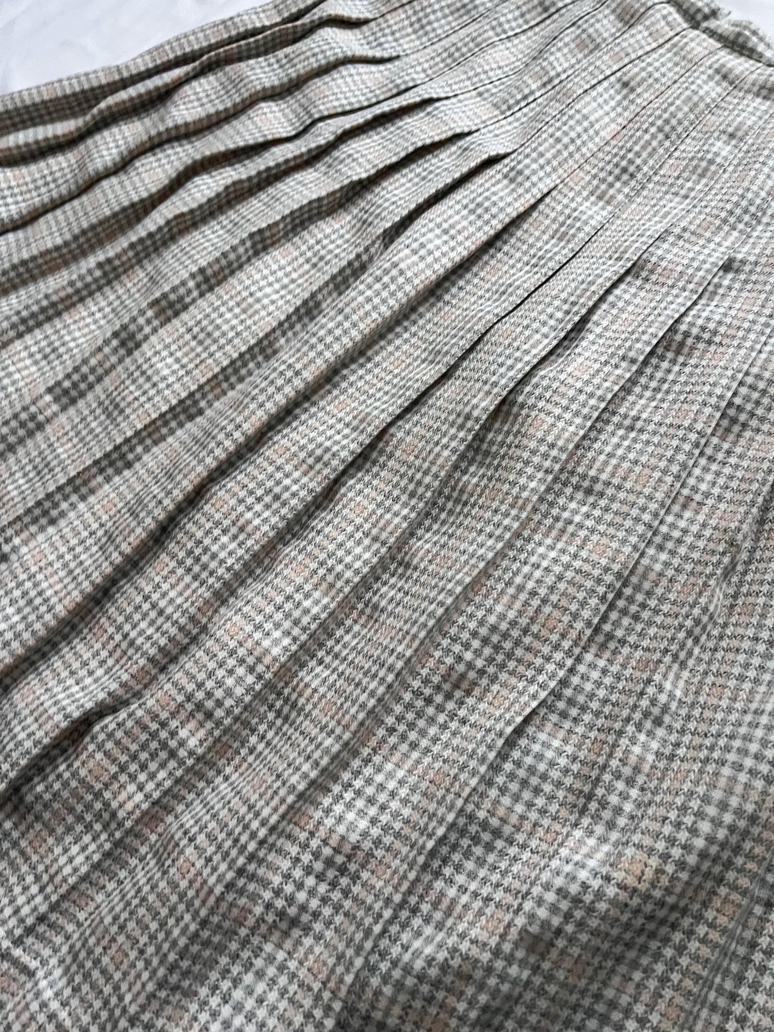 A midi length plaid pattern skirt in shades of beige, grey, and cream. The skirt has pleats from the waistband to the hem, belt loops, and a zipper.
