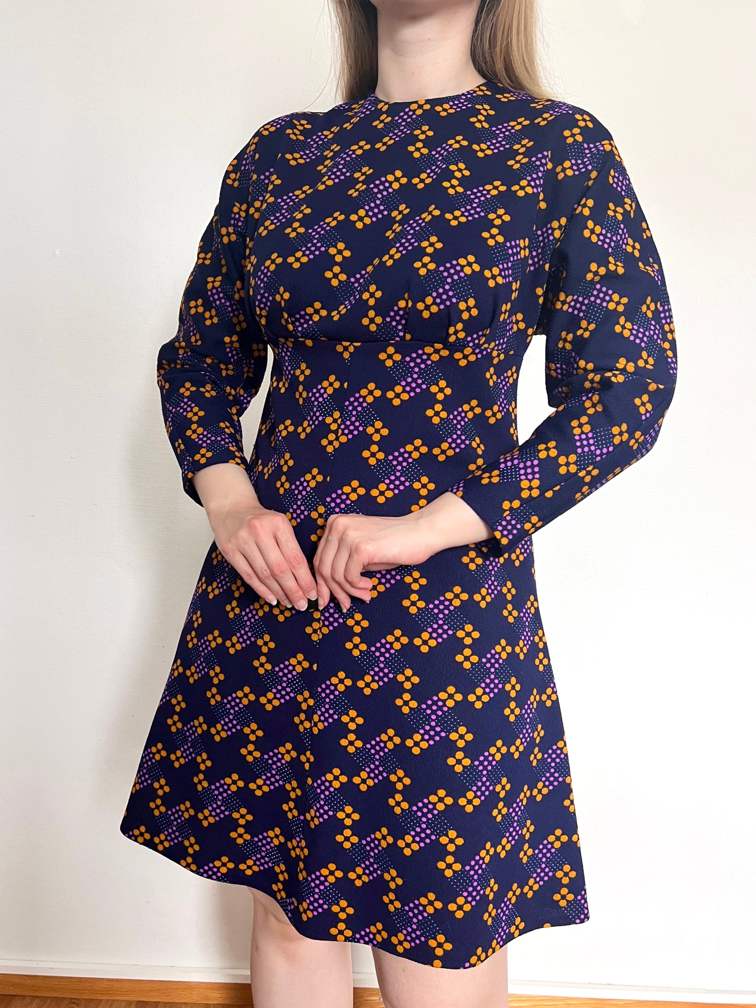 A purple long sleeved A-line dress with a pattern of orange and purple geometric shapes. The dress has a back zipper.
