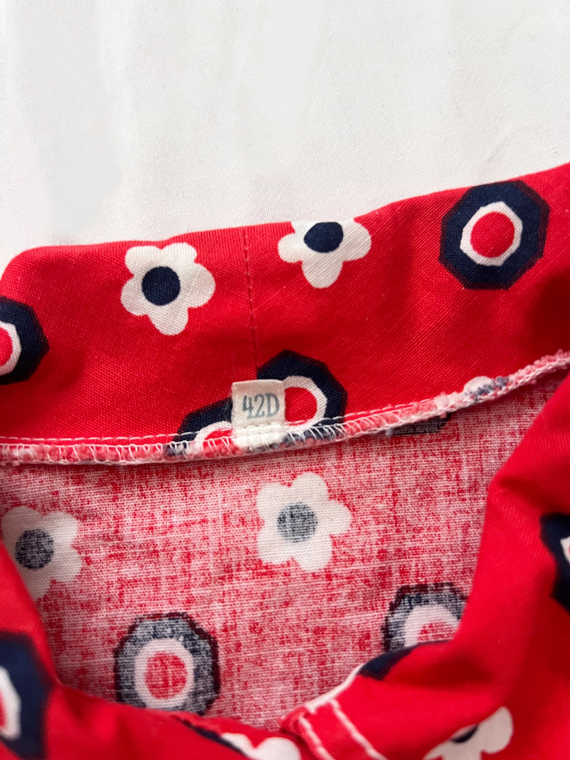 A red sleeveless, A-line mini dress with a retro white and black floral pattern, a wide and pointed collar, and two small chest pockets. The dress has big white buttons, and one hidden metal button at the top.