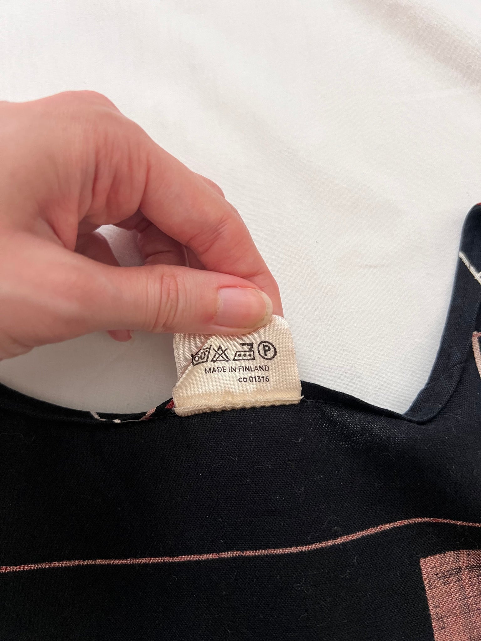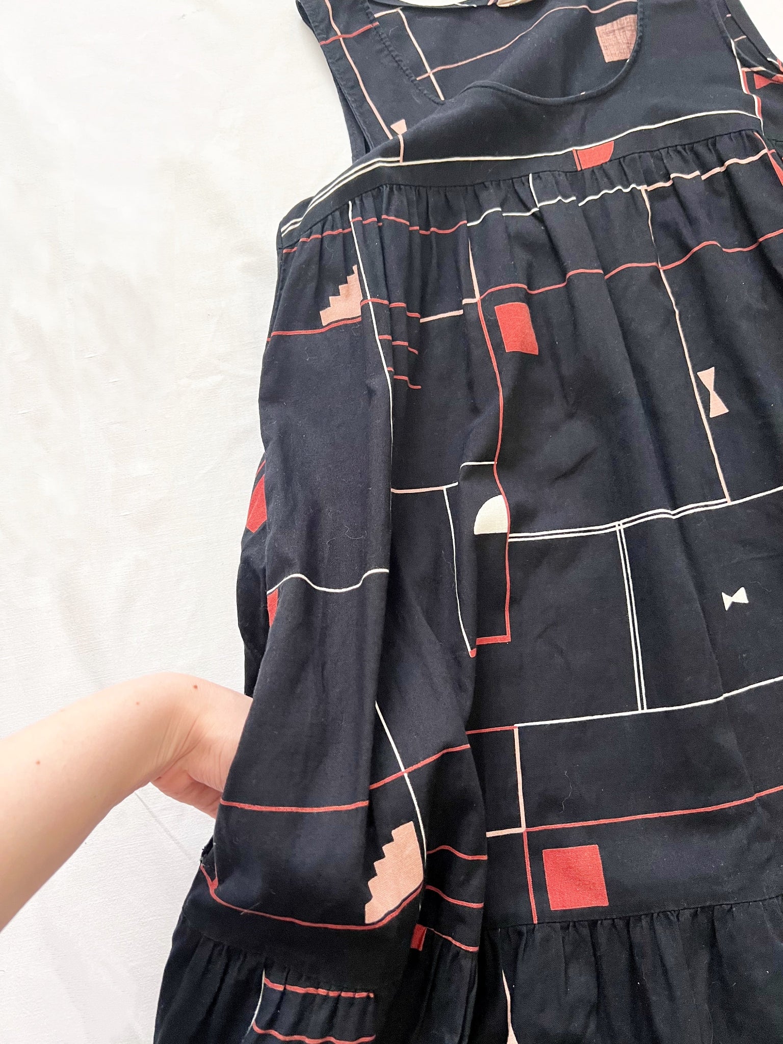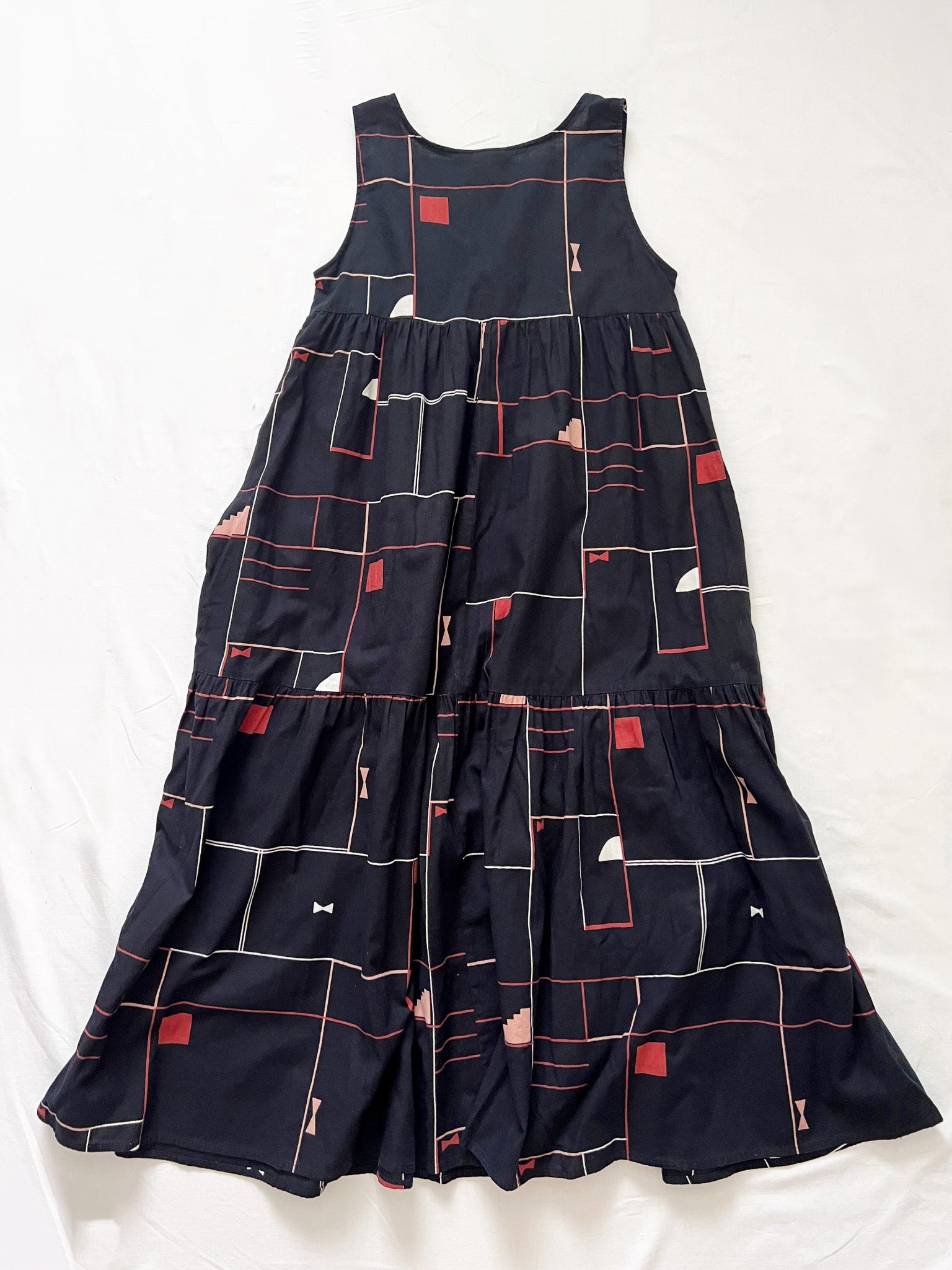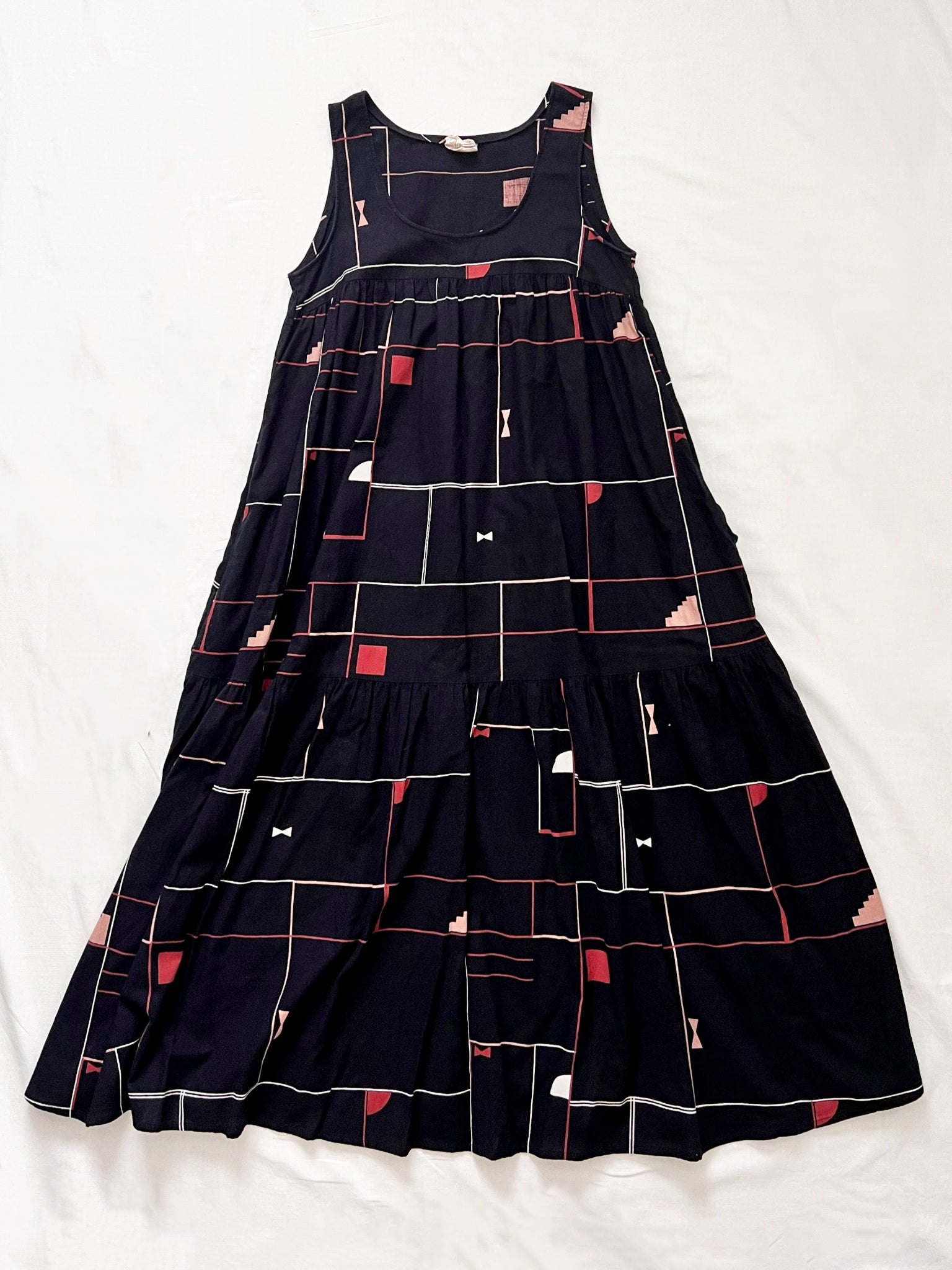 A black sundress with a geometric print in red, pink, white, and beige tones. The dress a wide square neckline and a gathered empire waist. There are two side pockets.