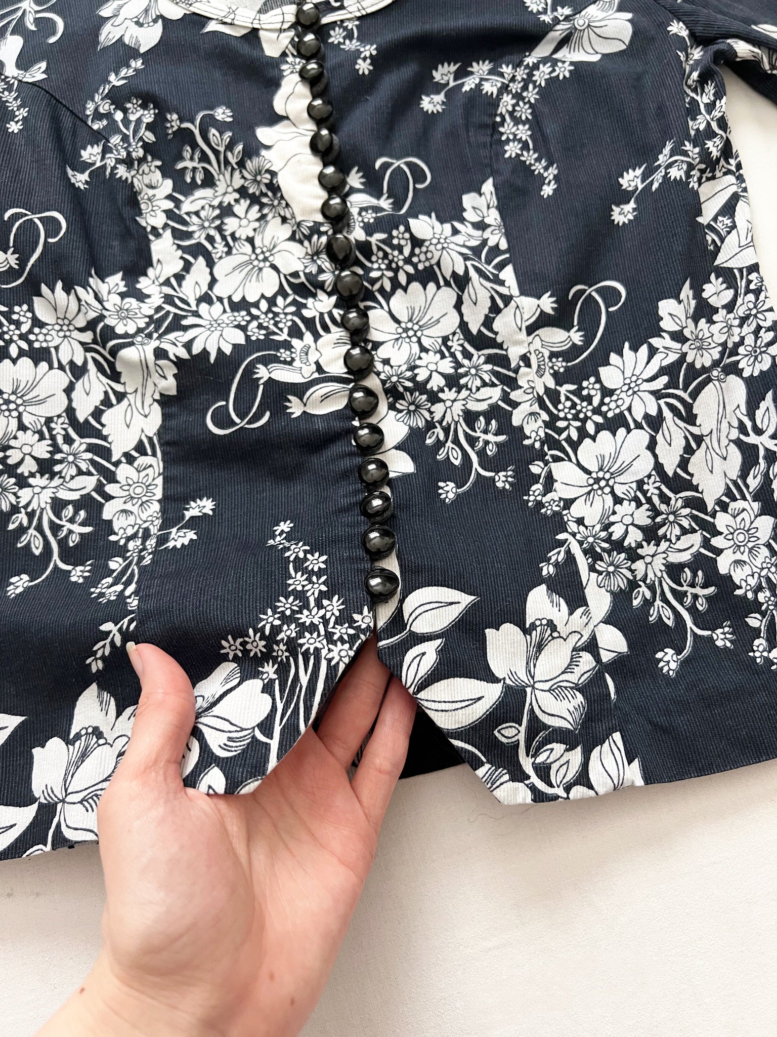 A dark gray 100% cotton t-shirt with a pattern of white flowers, and black buttons. At the hem of the t-shirt, right where the row of buttons ends, there is a small V-shaped cutout.