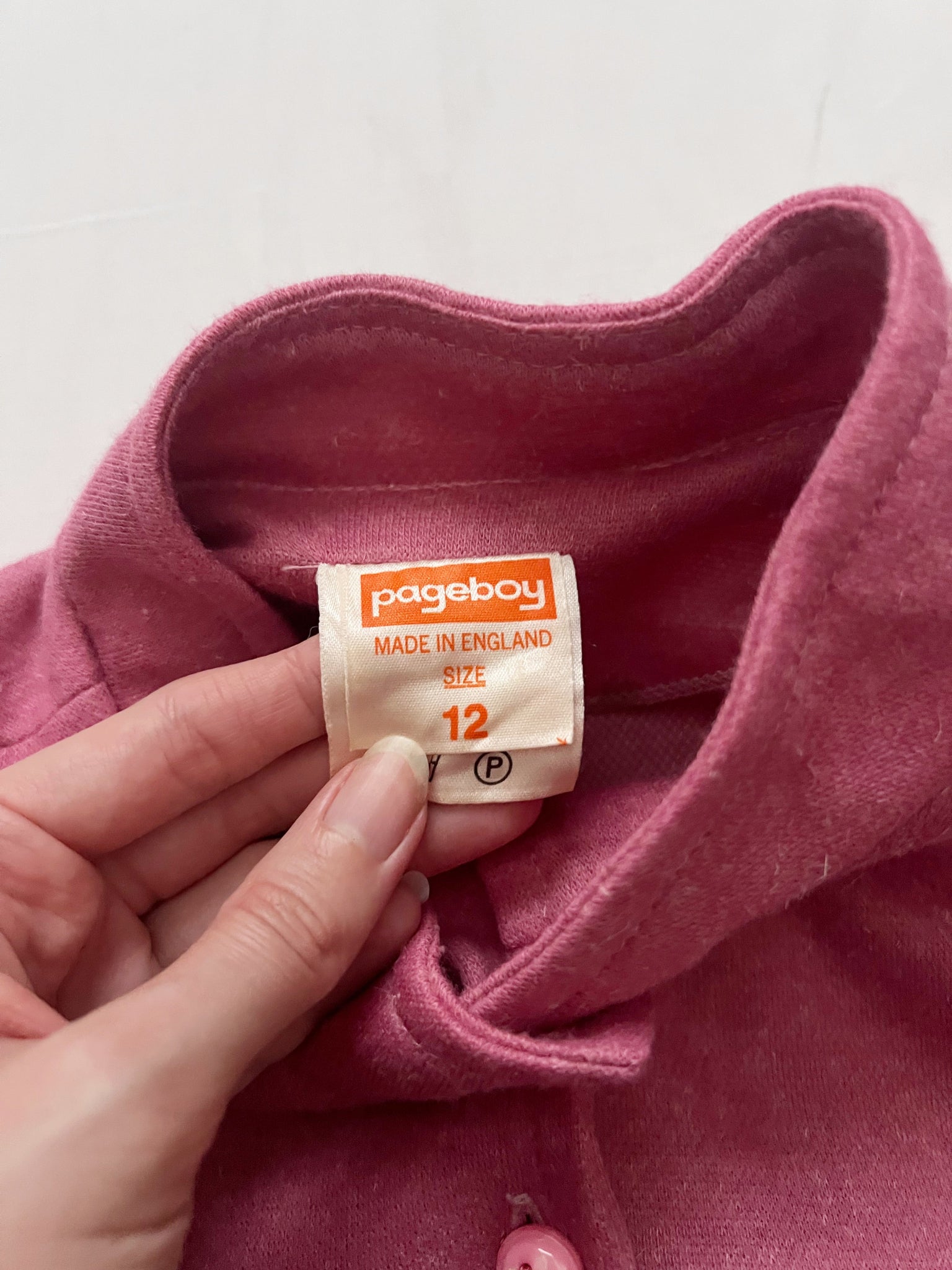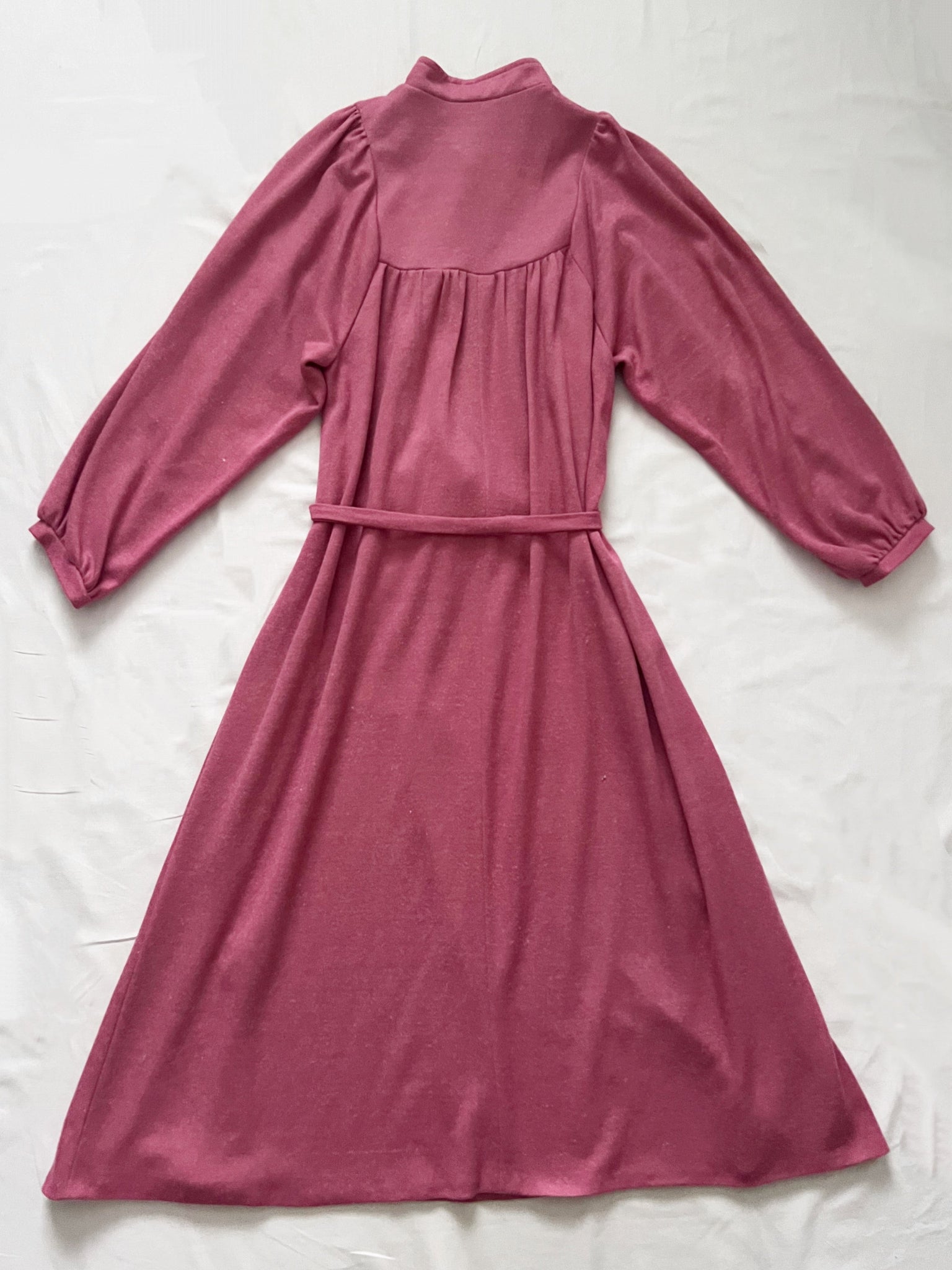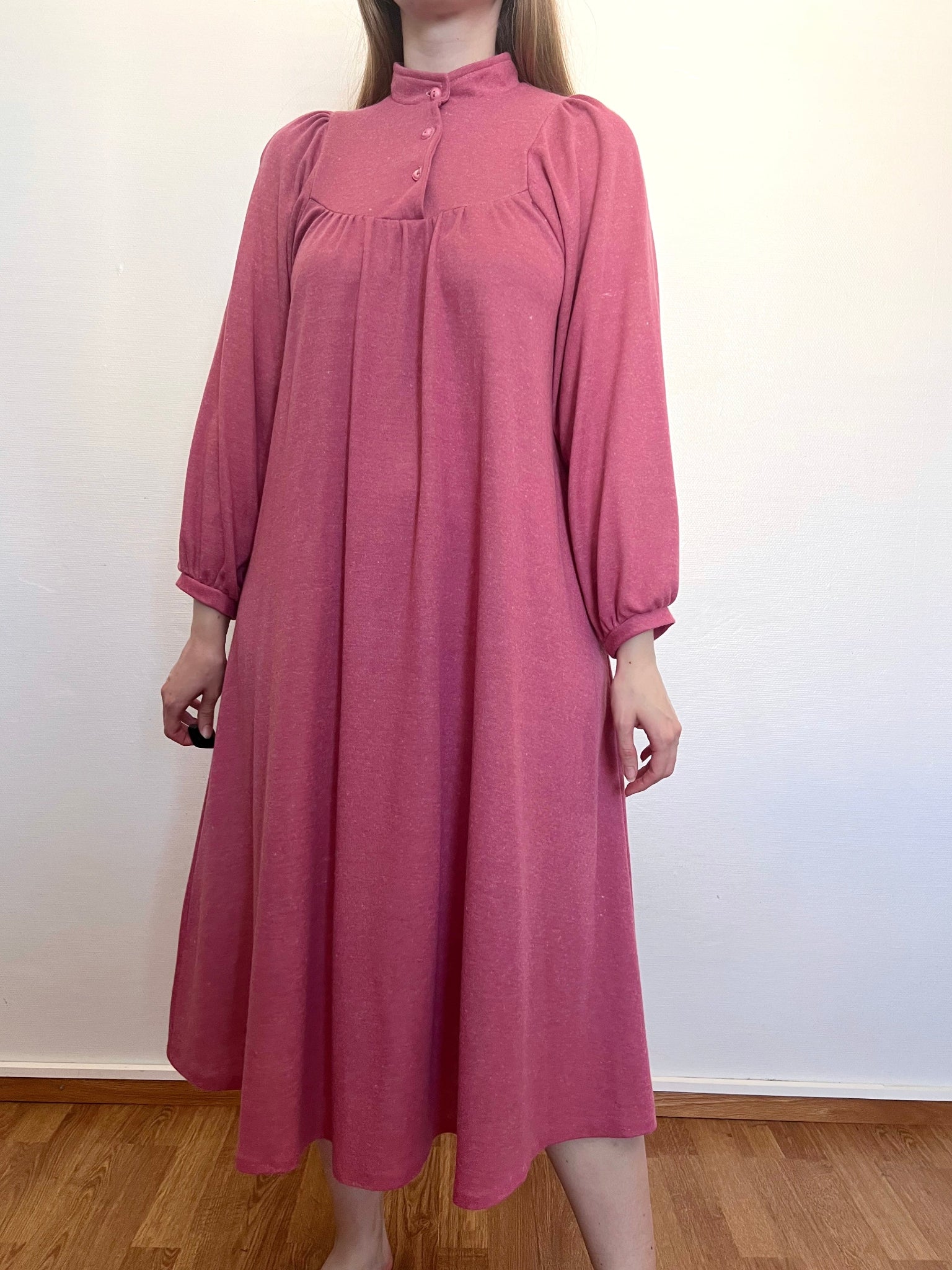A soft pink midi length dress with a relaxed fit. The dress has long, slightly puffed sleeves, a high neckline with a small stand up collar with three matching pink buttons. The dress has a matching belt, but can also be worn without the belt. One belt loop is not original. The fabric is very soft.