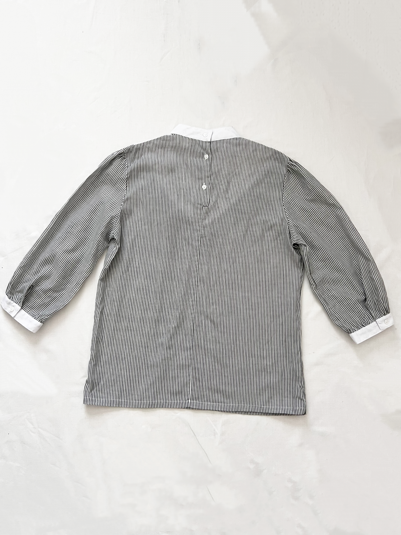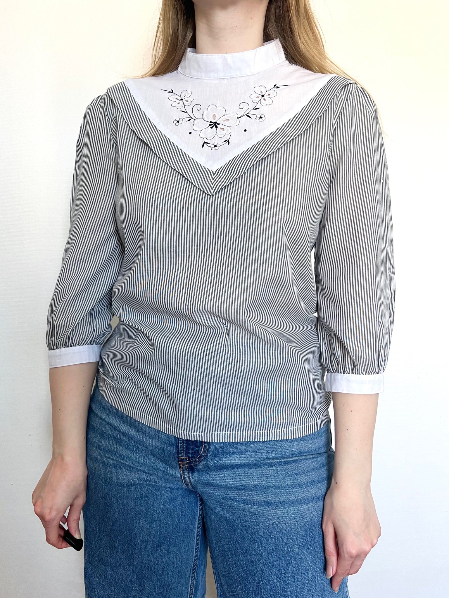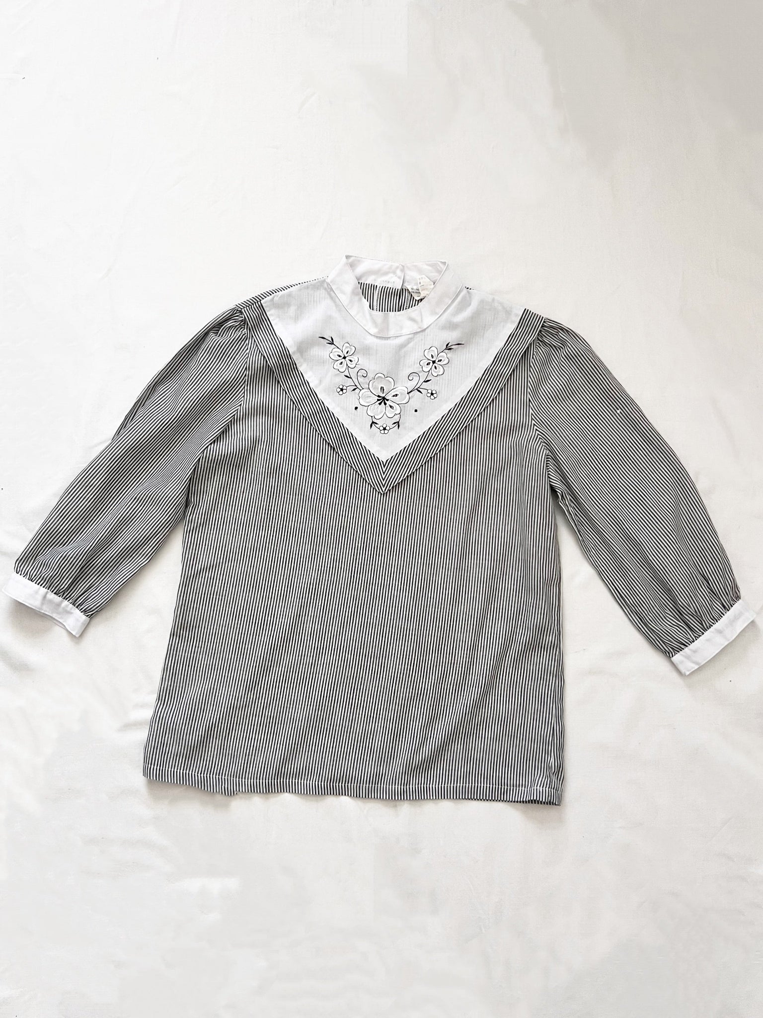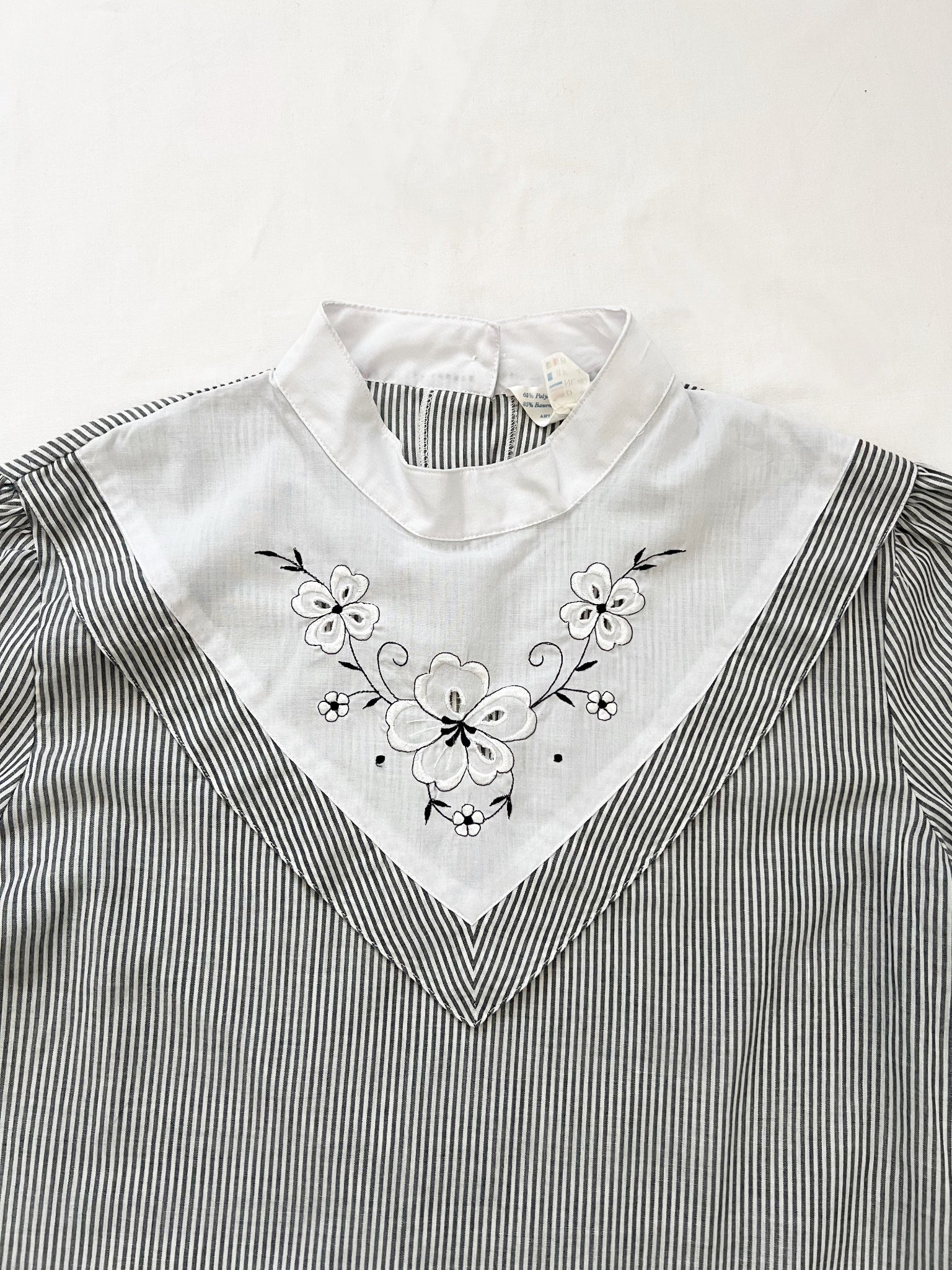 A prairie inspired top with thin black and white stripes, a high neck collar in white with a white triangular bib across the chest. The bib is embroidered with a floral design. The tops sleeves are three quarter length and finished with matching white cuffs.