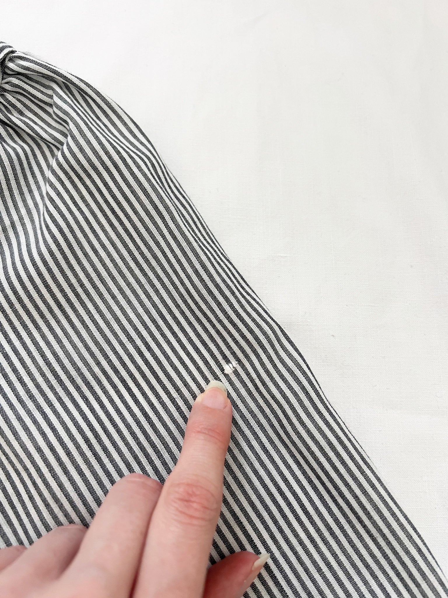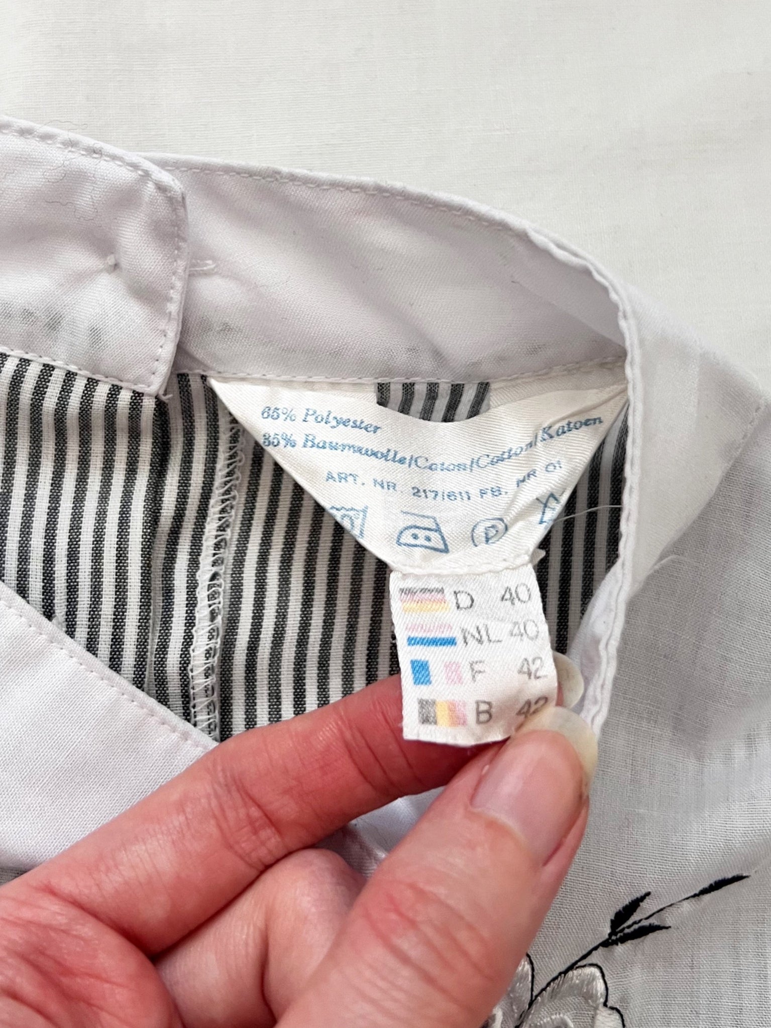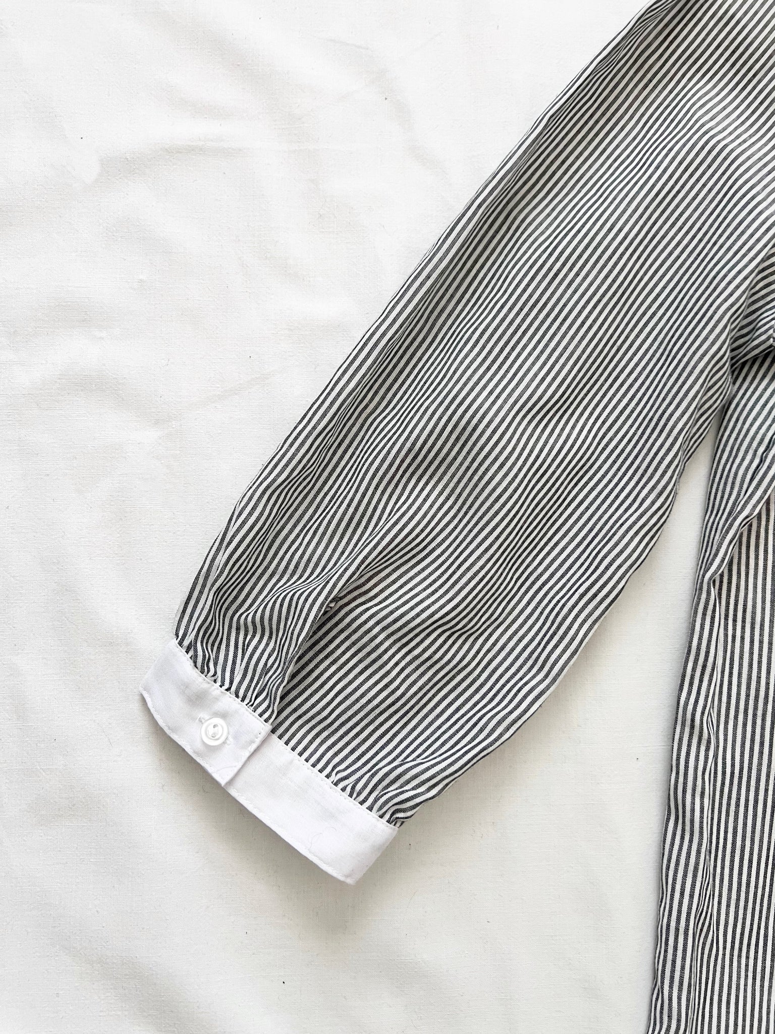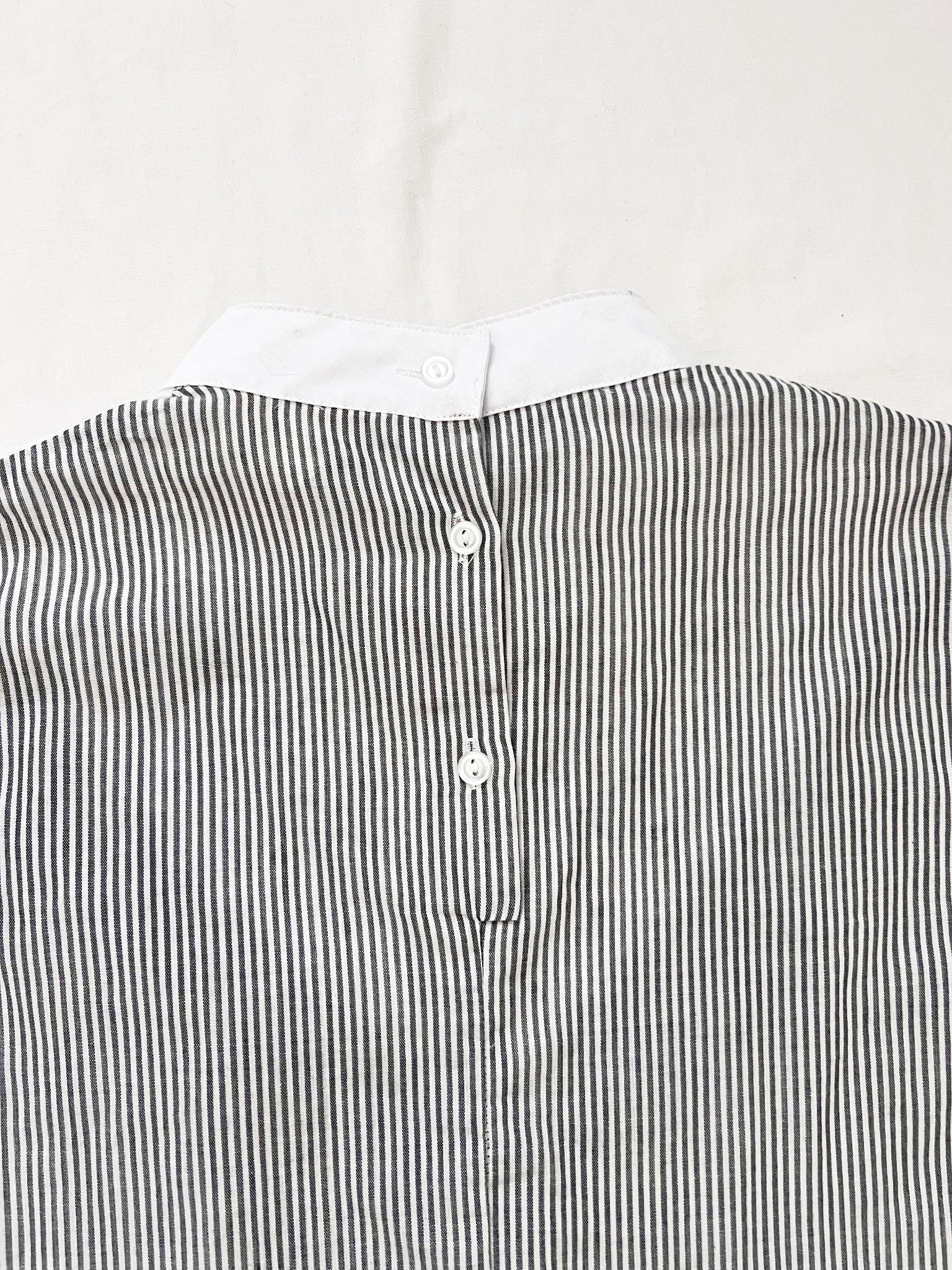A prairie inspired top with thin black and white stripes, a high neck collar in white with a white triangular bib across the chest. The bib is embroidered with a floral design. The tops sleeves are three quarter length and finished with matching white cuffs.