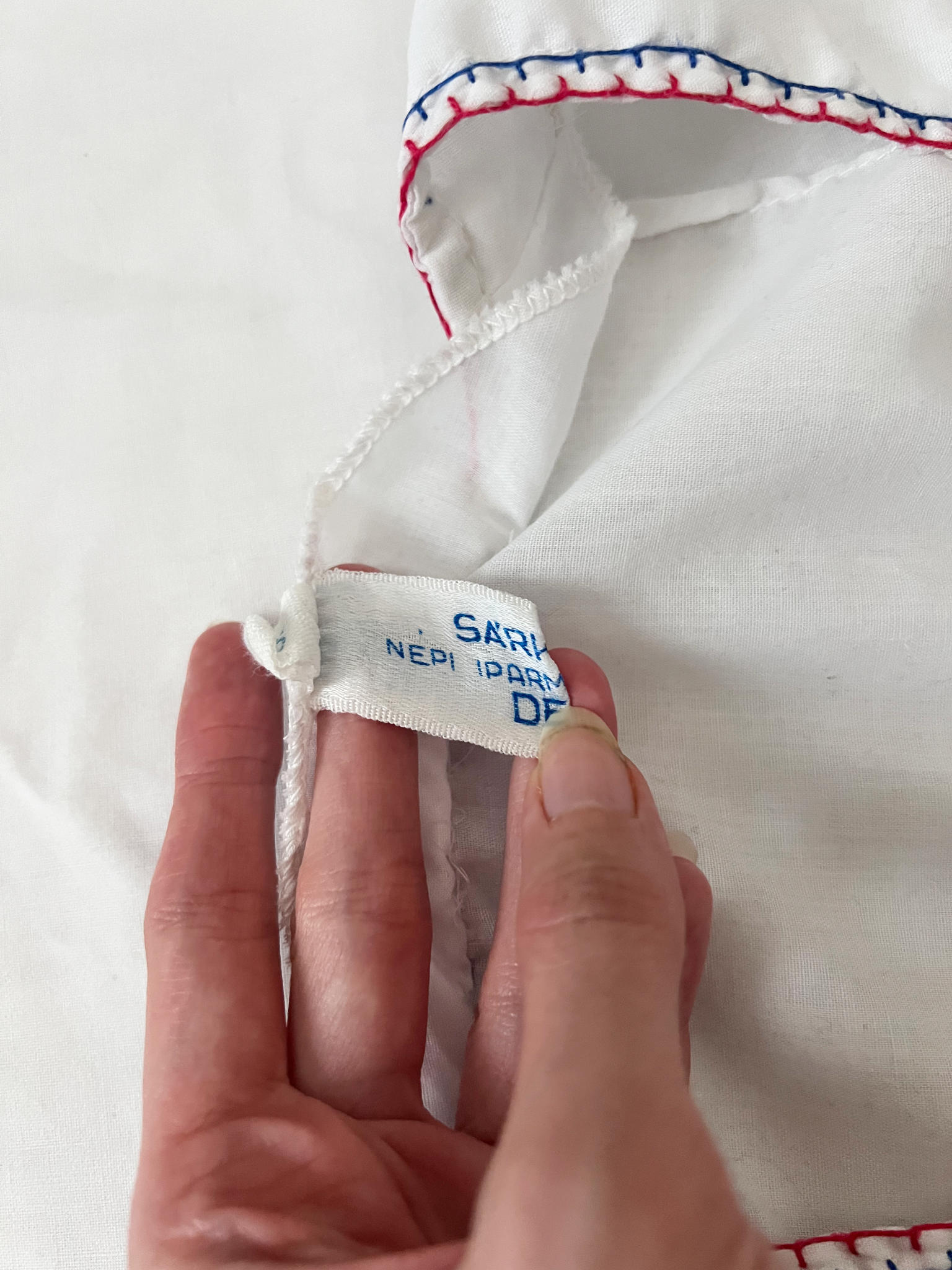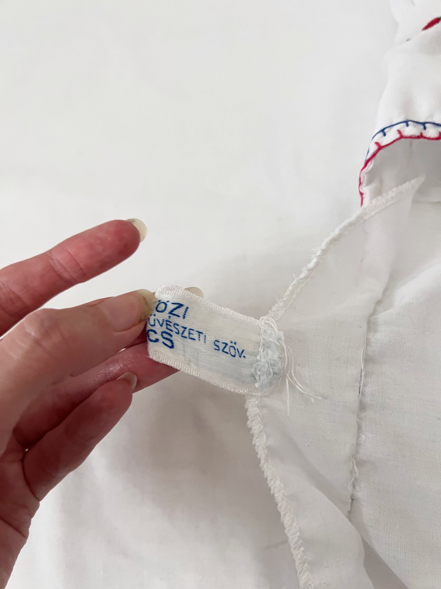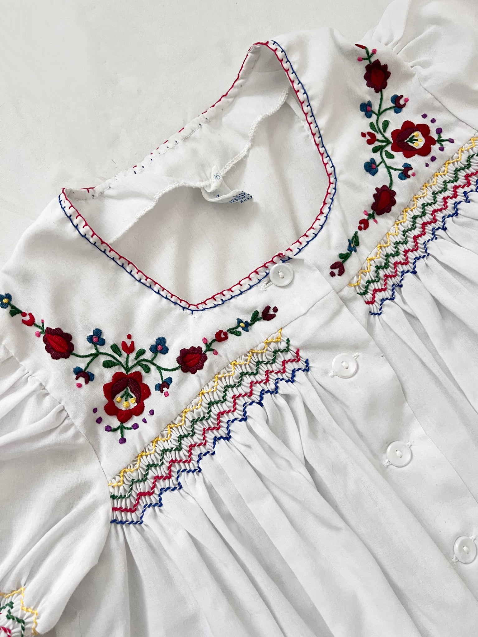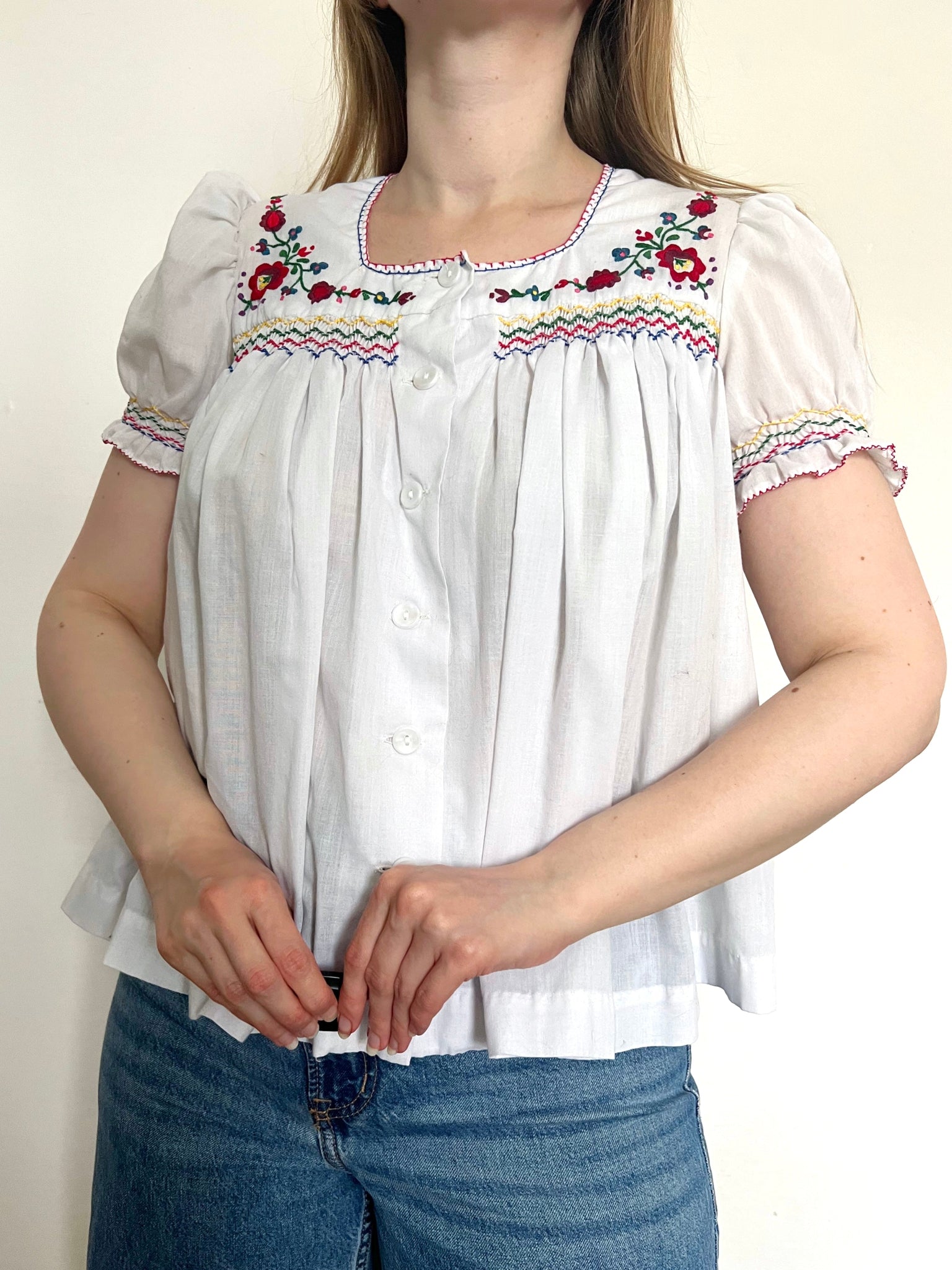 A short sleeved blouse with a babydoll fit. The blouse has embroidered flowers at the top front, and multicolored thread embroidered at the cuffs, and around chest and back. The blouse has puffed sleeves, and front buttons.