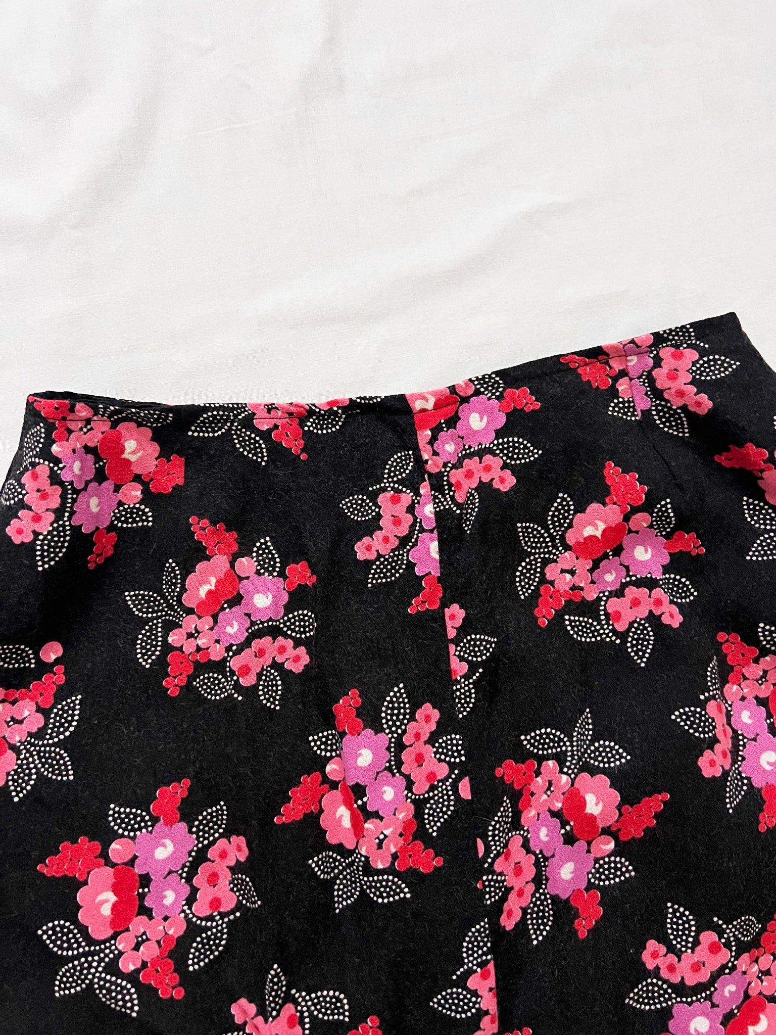 A maxi skirt with a black base color with a pattern of clusters of pink, red, and light purple flowers and white dotted leaves. The skirt has a zipper.