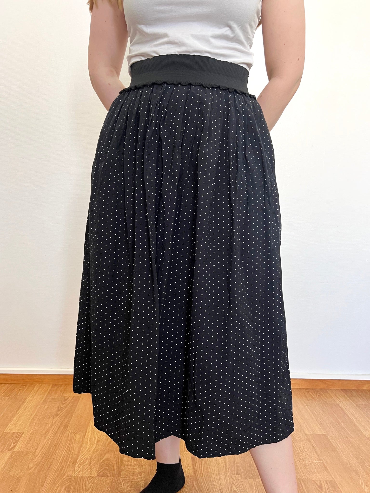 A black midi skirt with a pattern of small white polka dots, two side pockets, a stretchy waistband with a ruffle detail on, and a slit at the side of the skirt.