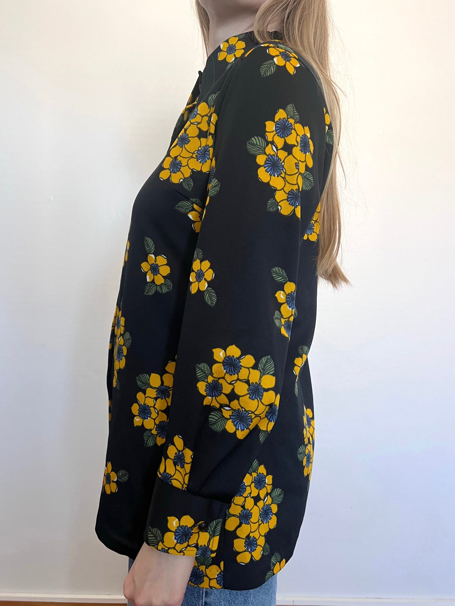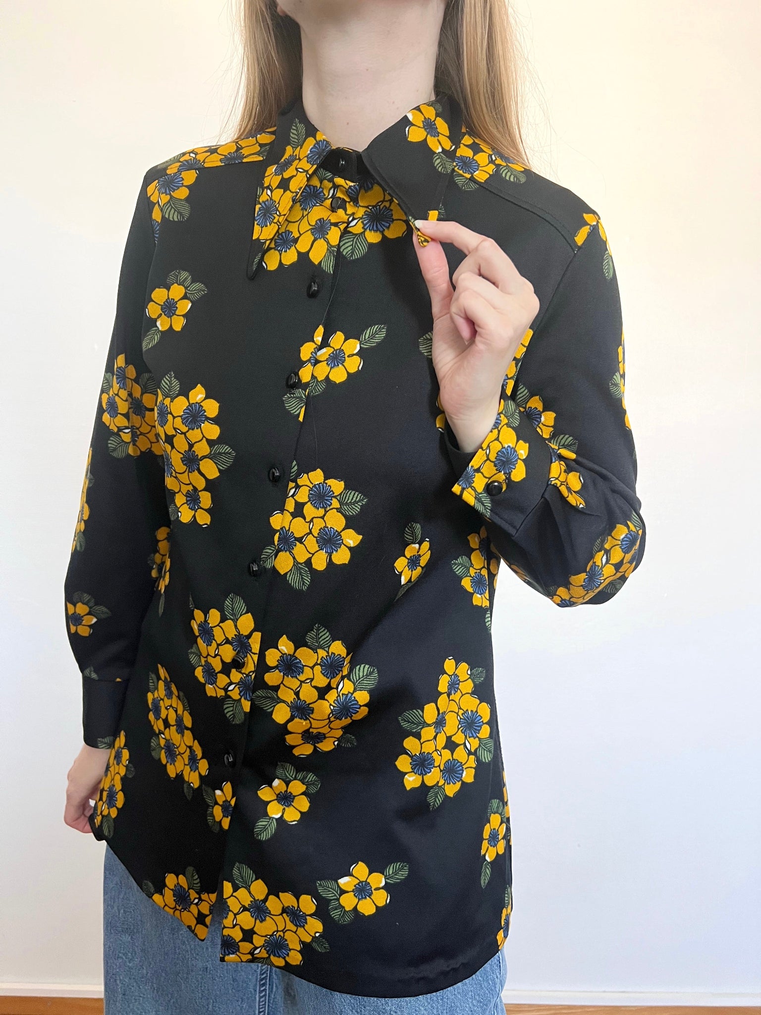 A long sleeved, button up shirt with a pattern of yellow flowers on a black background. The shirt has a wide, pointed collar and structured cuffs with a button. The buttons are black.
