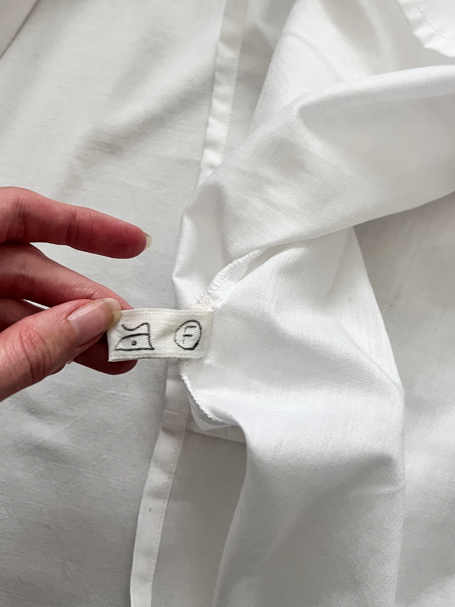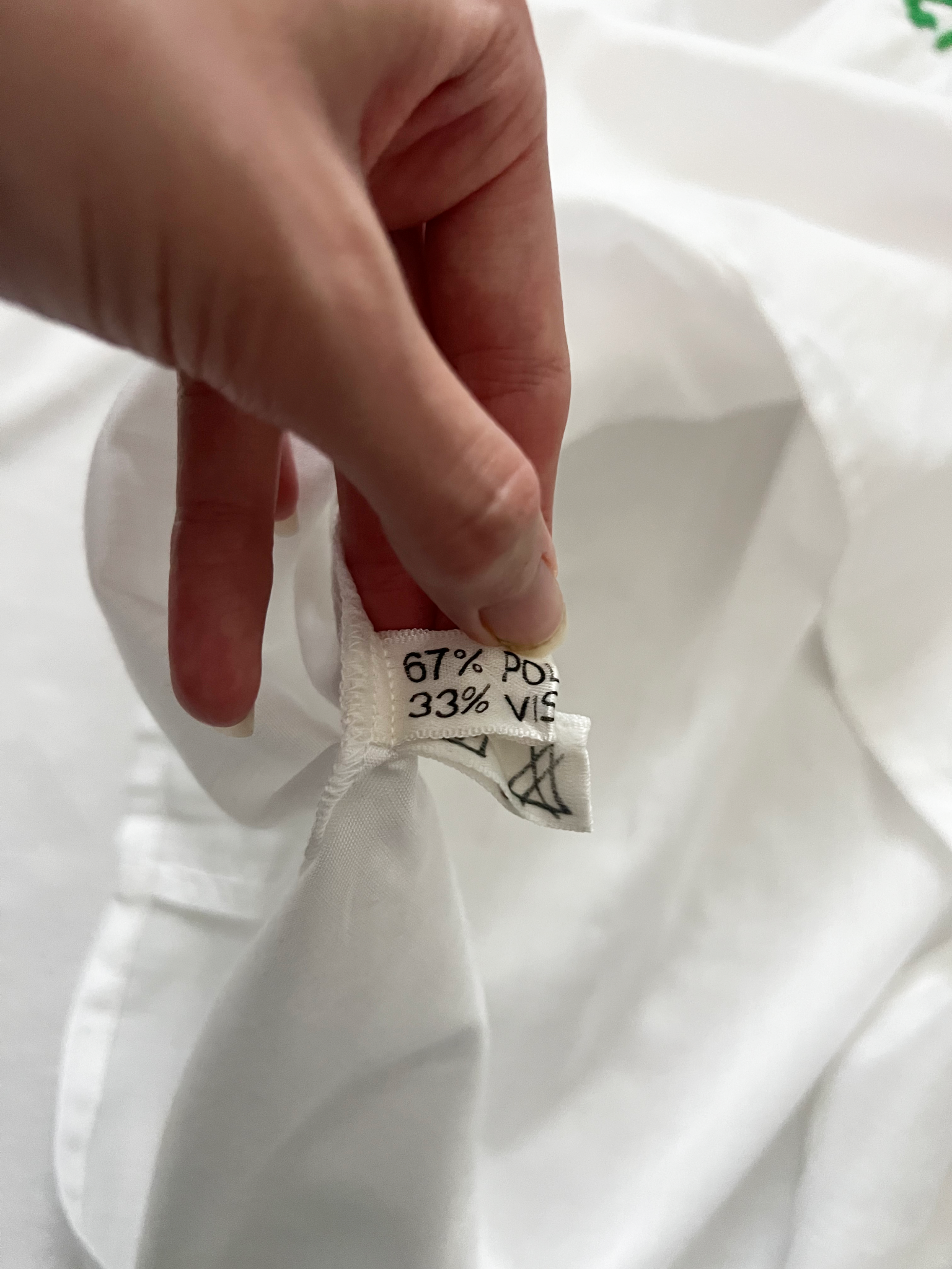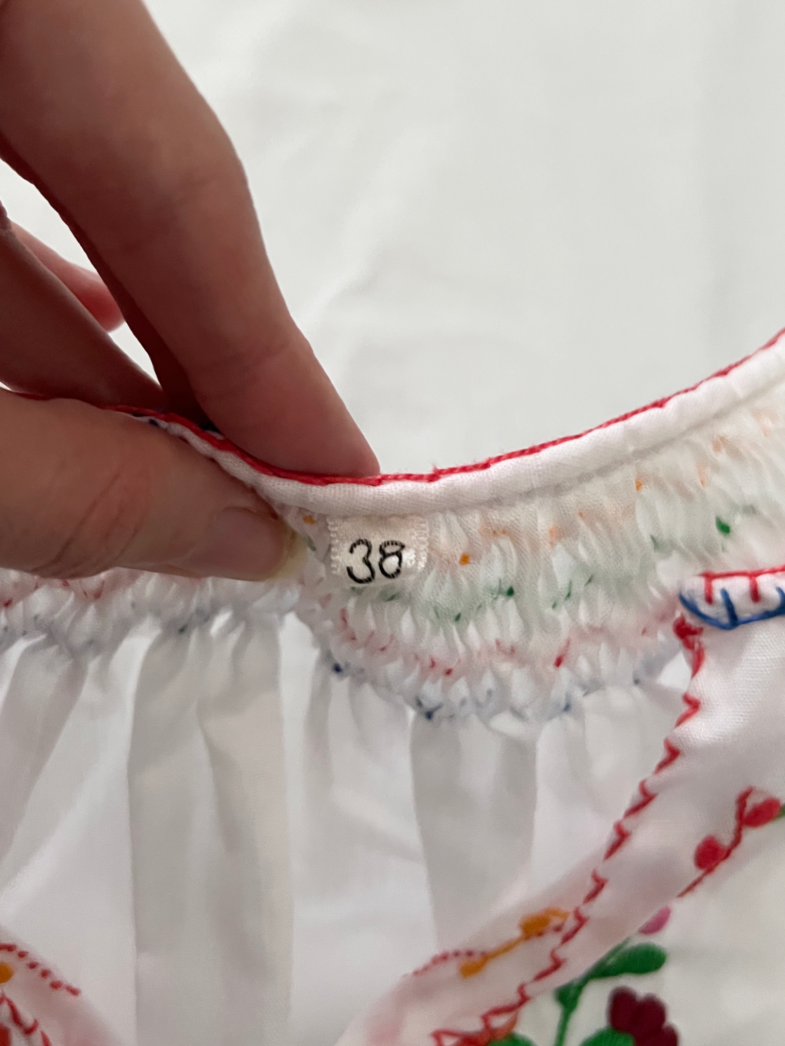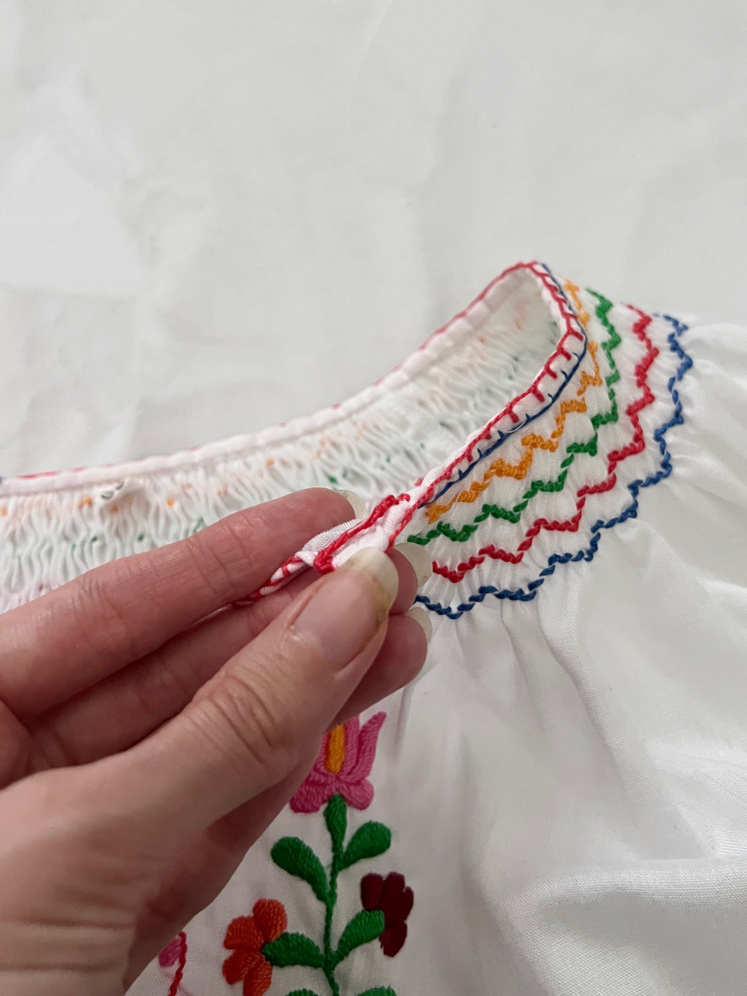 A white peasant blouse with embroidered Hungarian Matyó floral pattern, and multicolored thread in a crisscross pattern around the neck and at the sleeve cuffs.