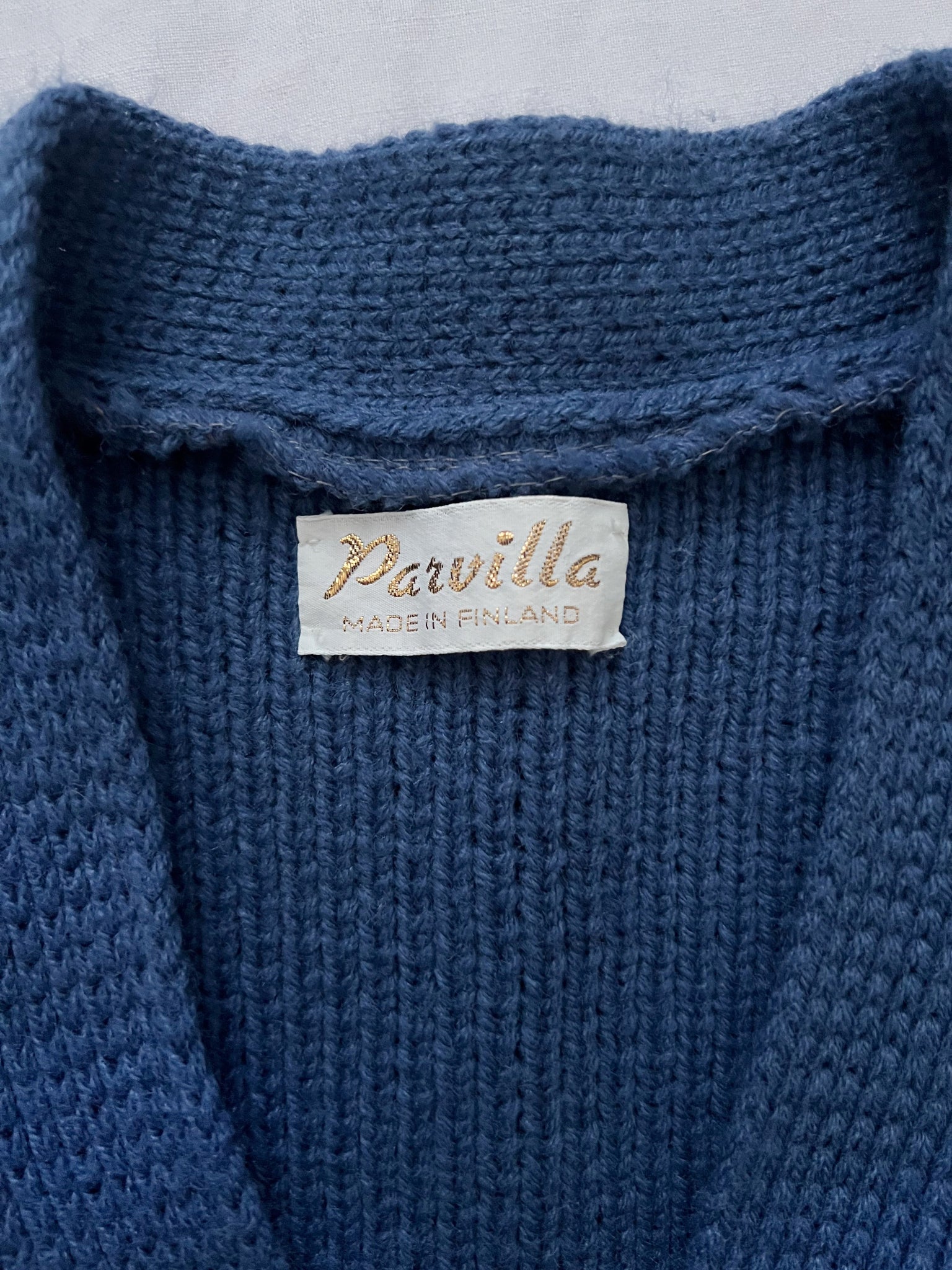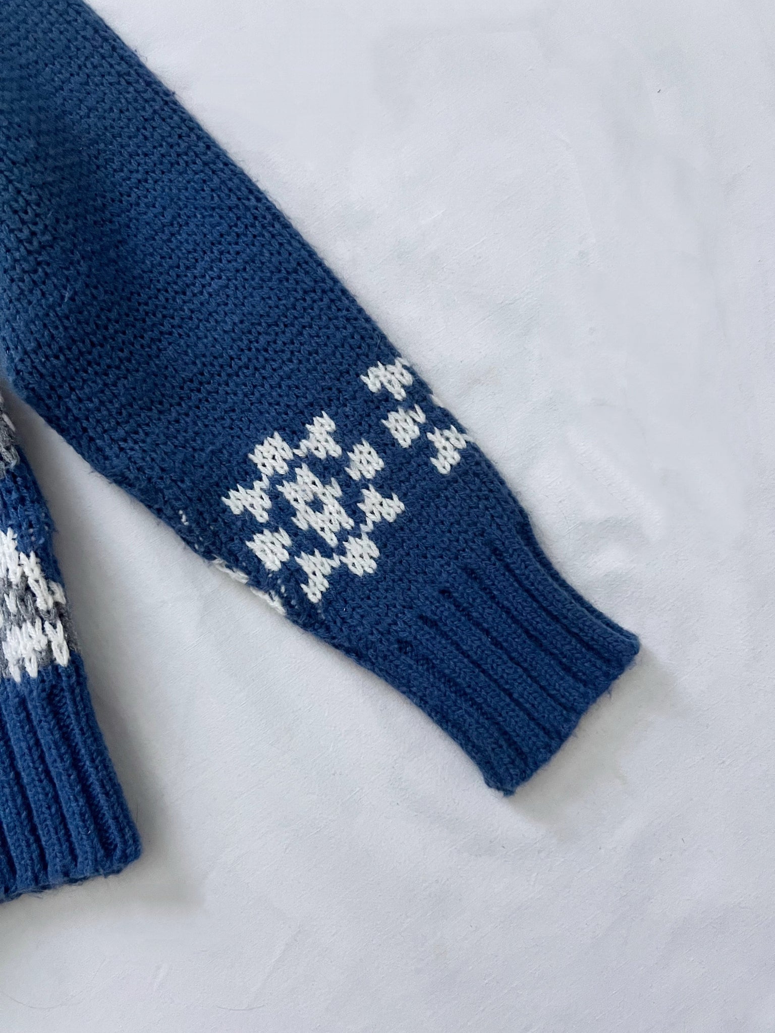 A cozy blue and white knitted cardigan with a Nordic inspired pattern at the front and at the hem. The cardigan has a V-neckline, ribbed cuffs and hem, and is fastened with a row of large blue buttons