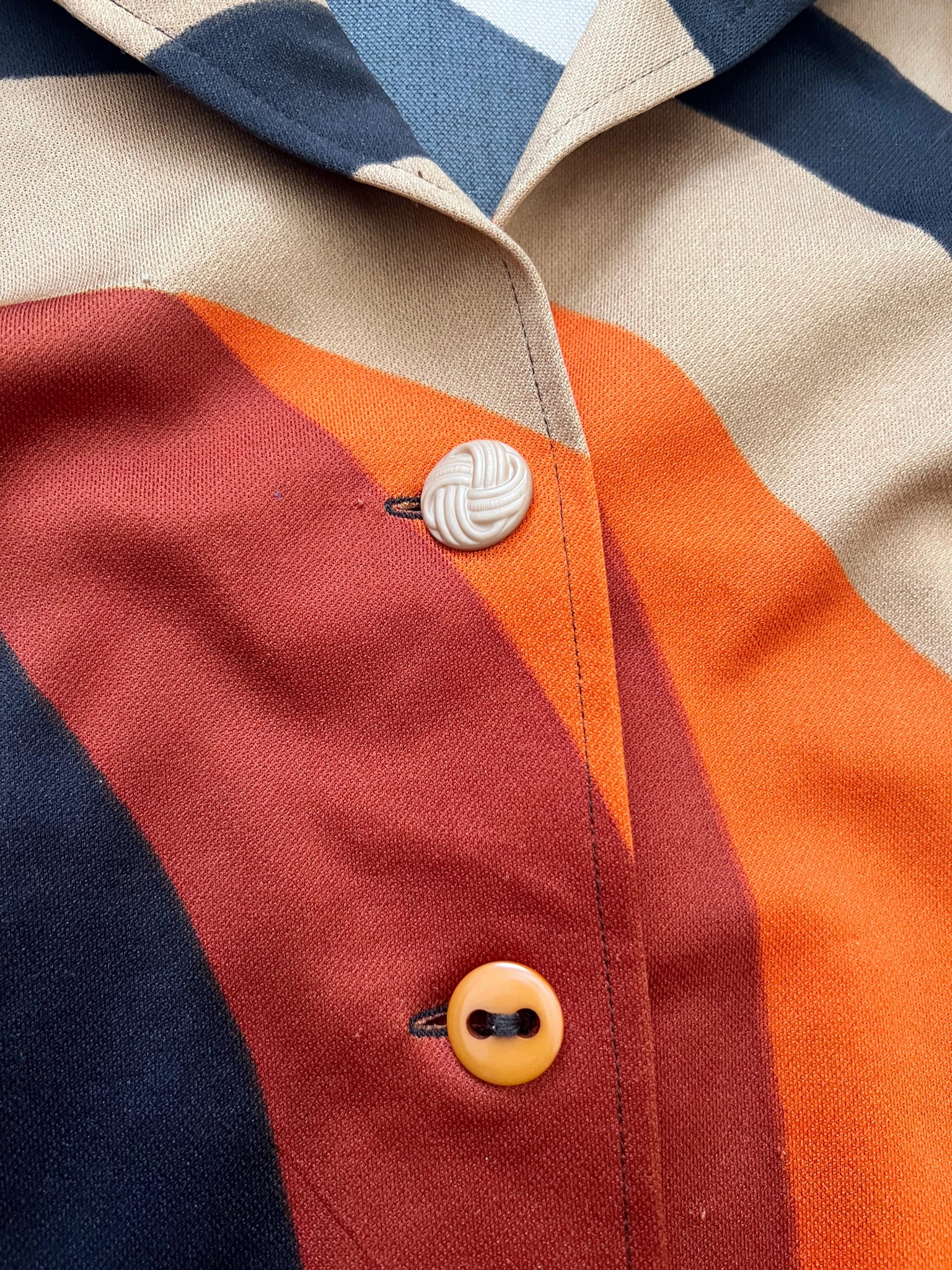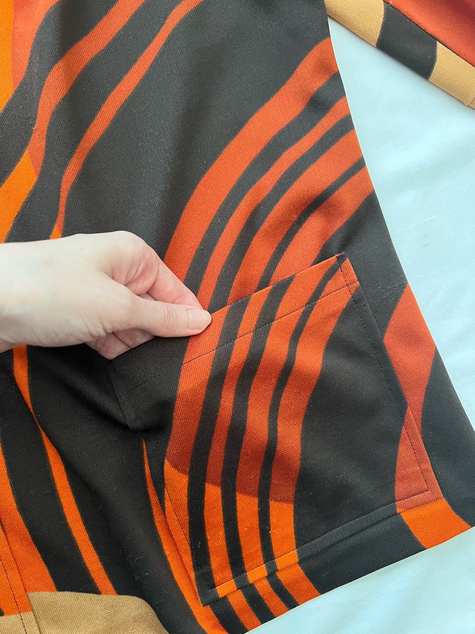 A long sleeve shirt with a bold abstract pattern in shades of orange, brown, and beige. The shirt has a pointed collar, and two front pockets.