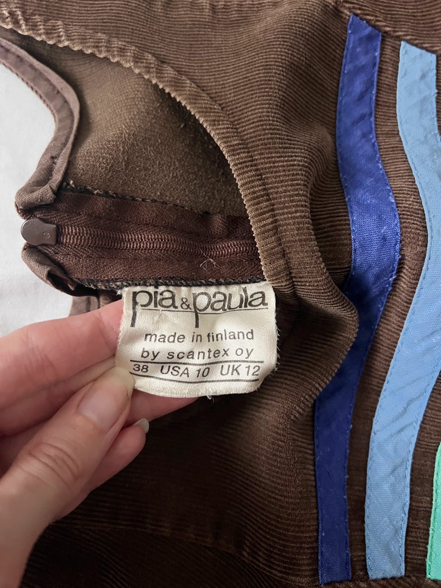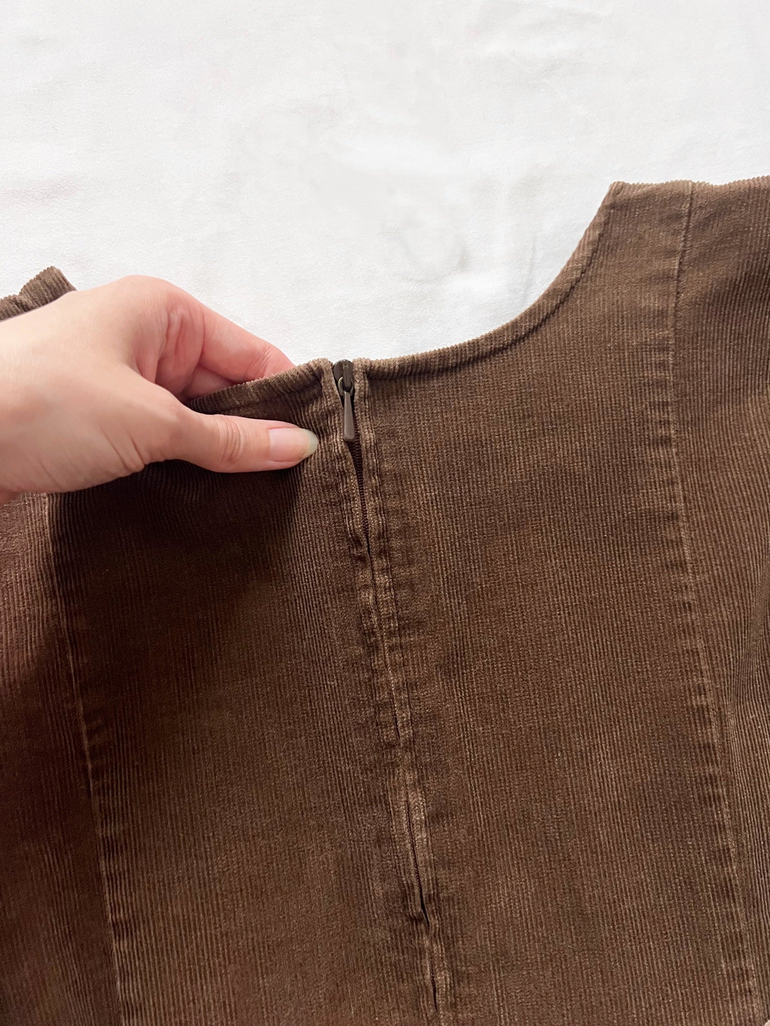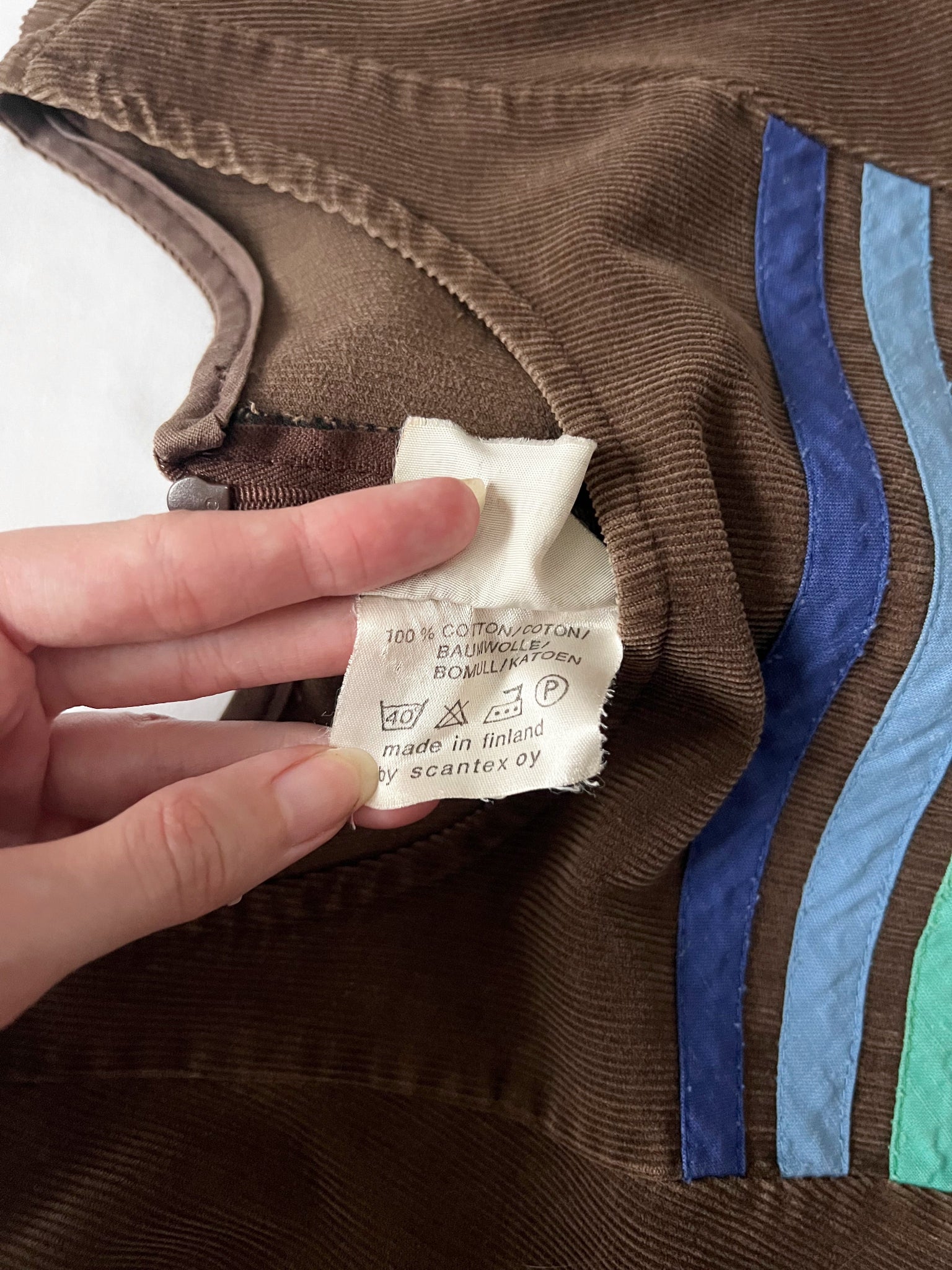 A brown corduroy tunic with short sleeves and a round neckline. The bodice has a panel of colorful horizontal stripes, and two ties that tie into a bow in the back. At the back there is a zipper.