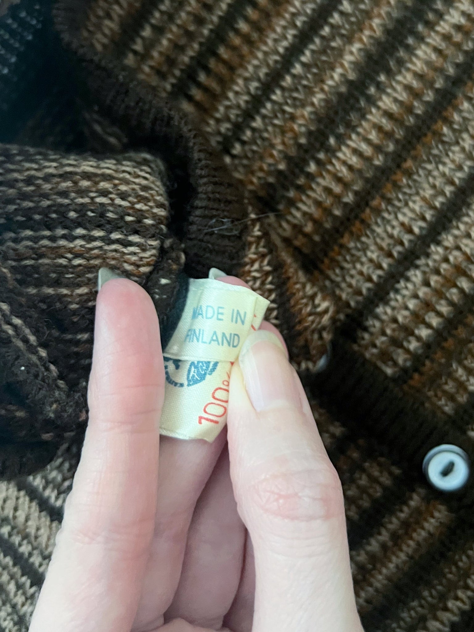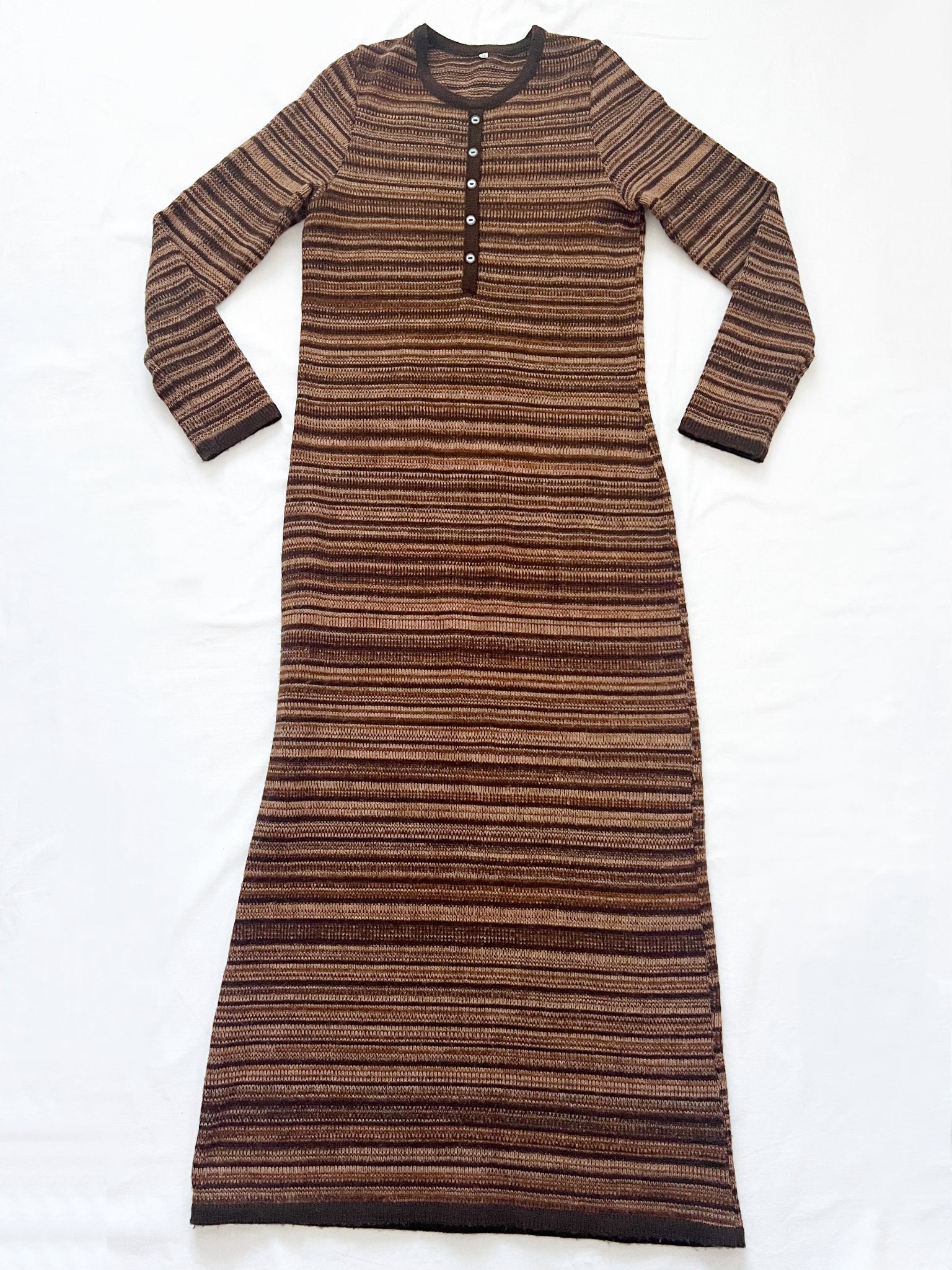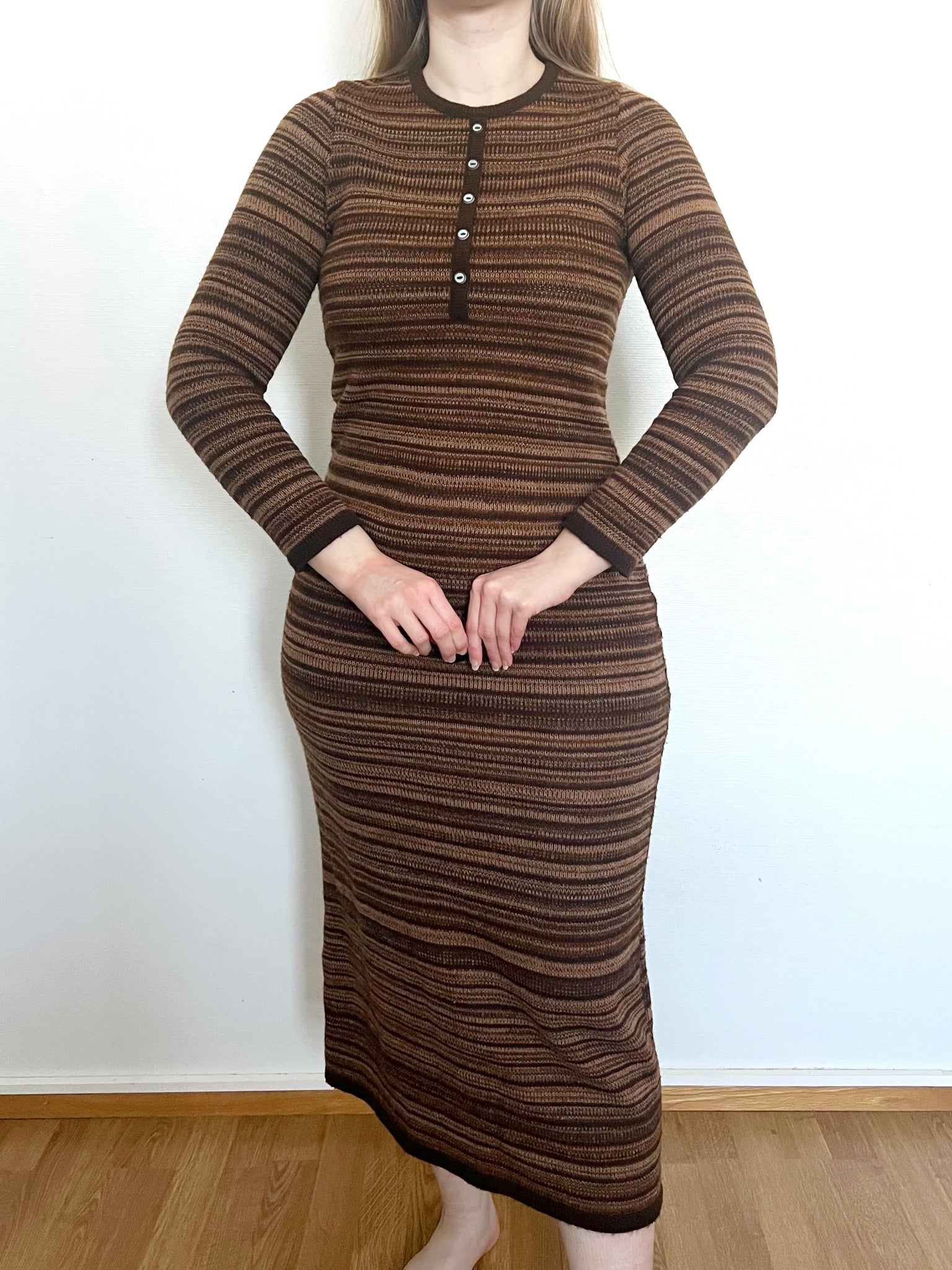 A brown, striped knitted dress with decorative buttons at the front. Made in Finland