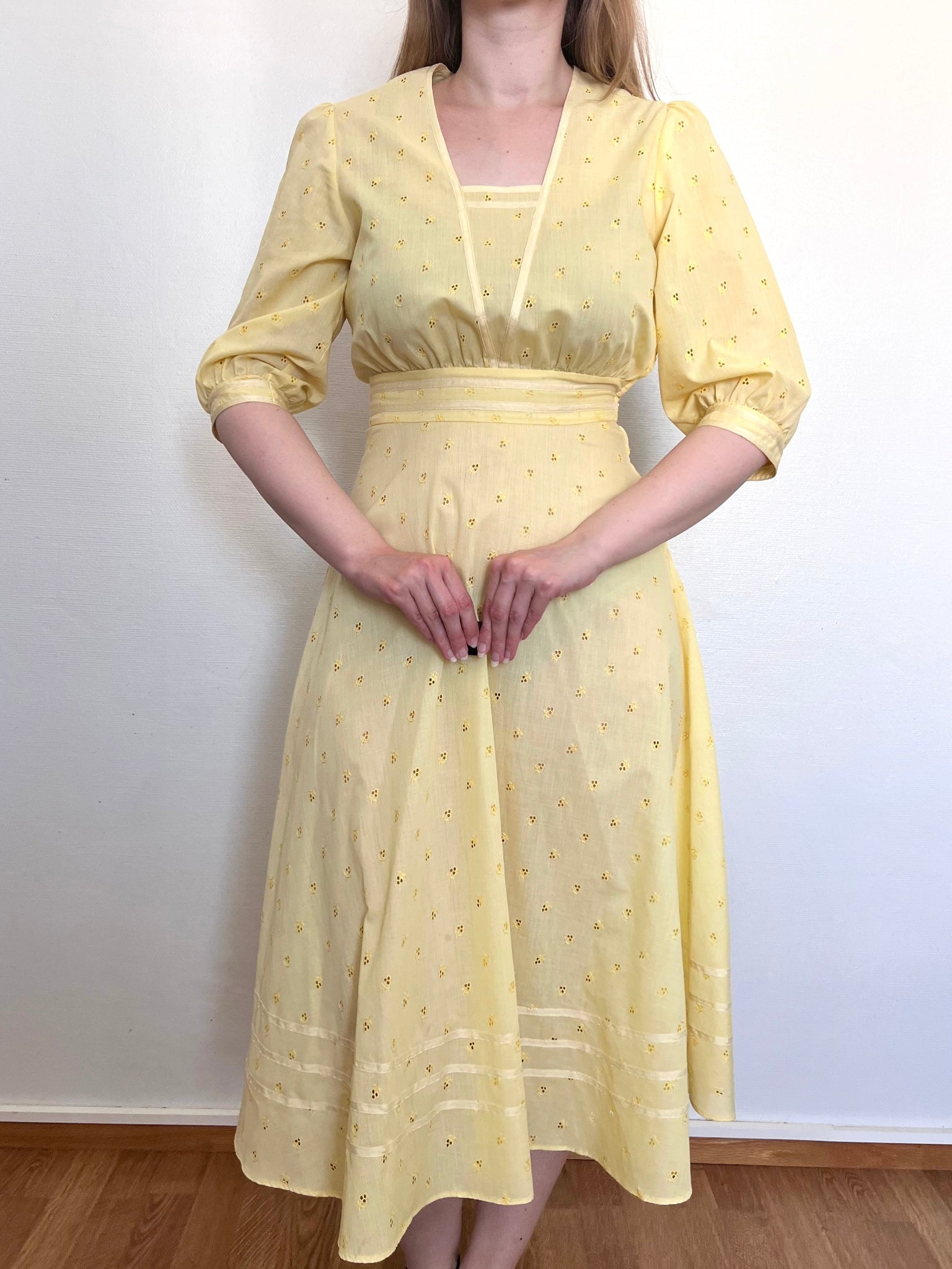 A butter yellow midi dress with a V-neckline bordered with a delicate trim, which is mirrored in the fitted waistband. The bodice is gathered under the bust, and the three-quarter length sleeves are puffed. The skirt is finished with horizontal bands of sheer detailing near the hem, both at the front and back of the dress. The fabric has a small floral cutouts, and is semi-sheer. The dress has a side zipper