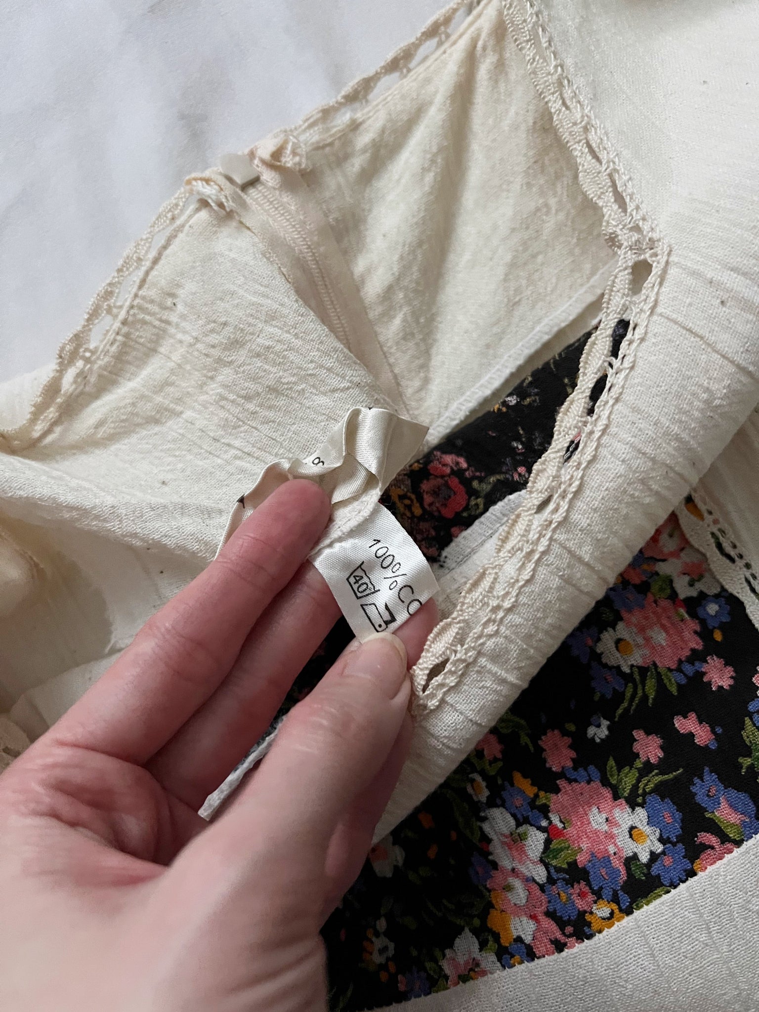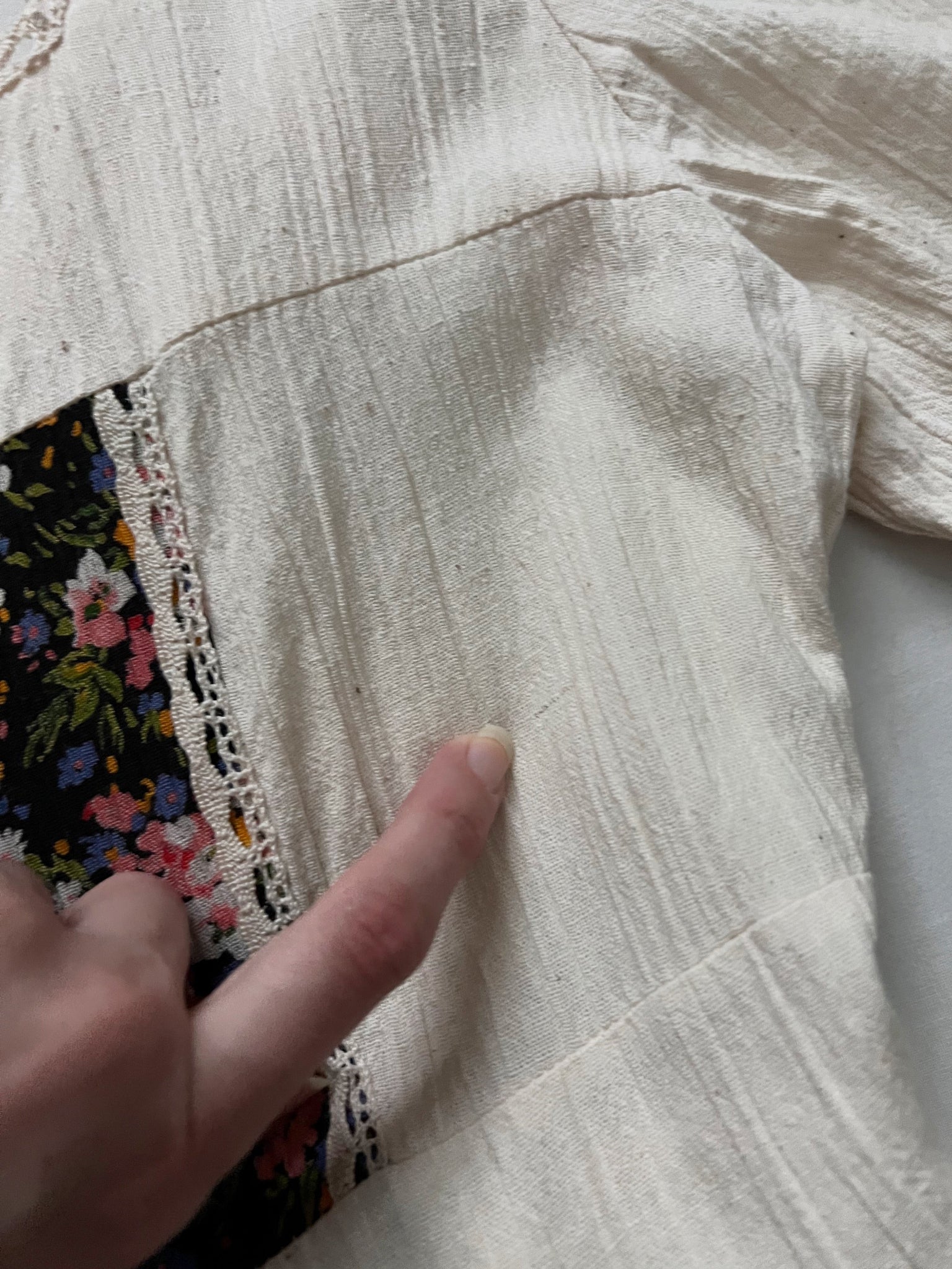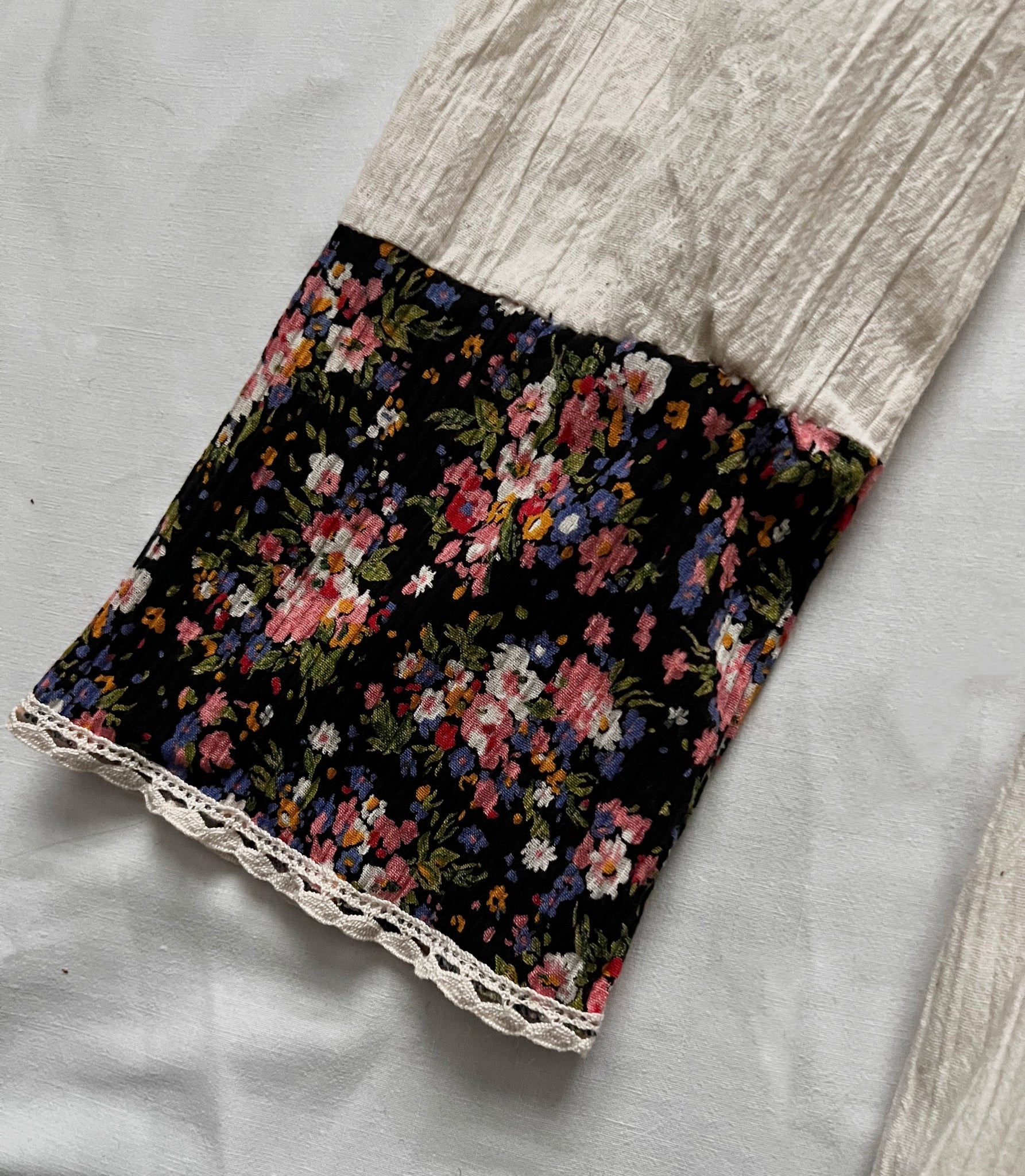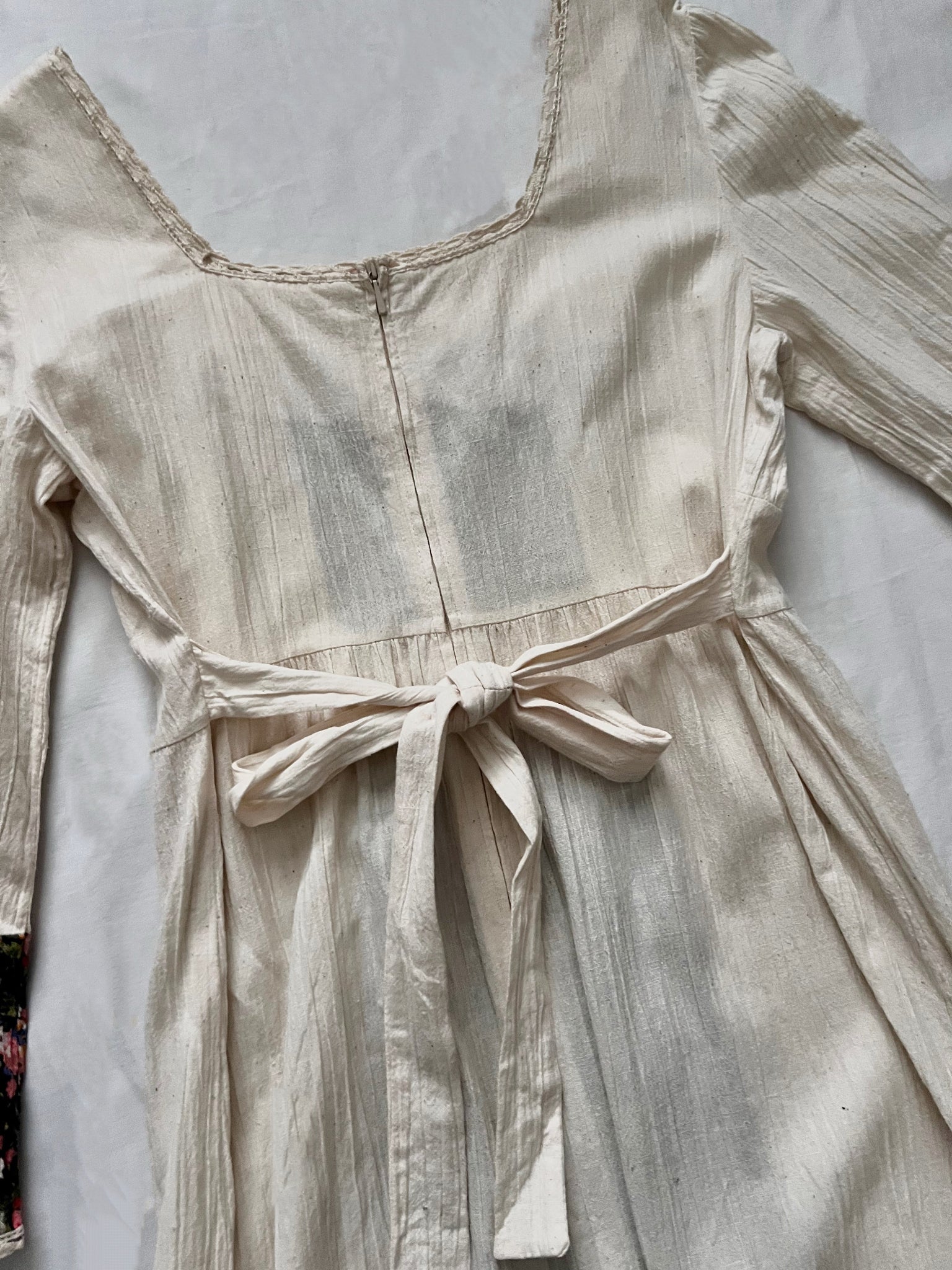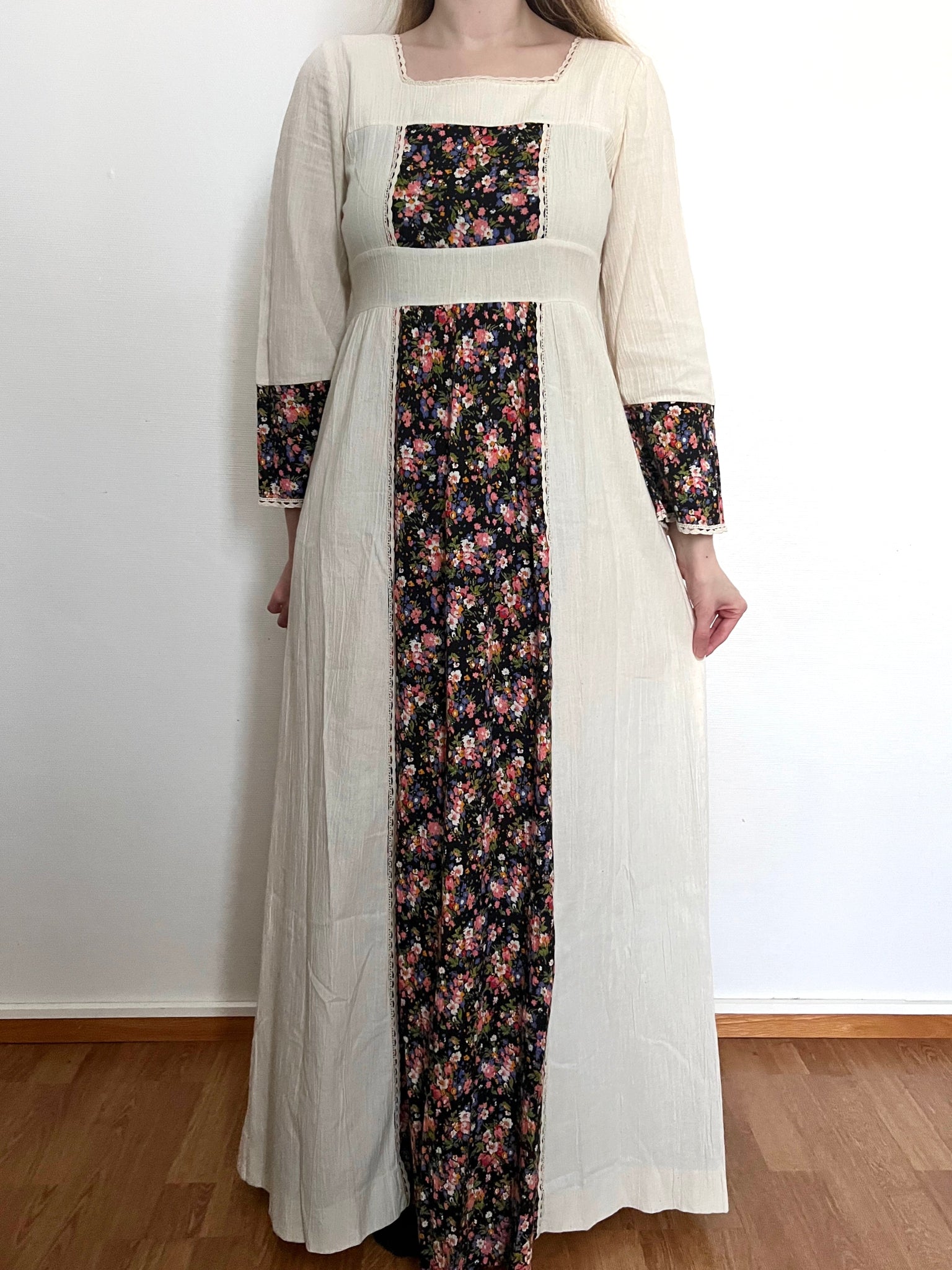 A light cream colored maxi dress with a pattern of panels with flowers on a black backround on the chest, down the bust to the hem, and at the ends of the sleeves. These floral sections are framed with a trim. The dress has a square neckline that is also framed by a trim, both front and back, two ties that tie into a bow in the back, and a back zipper.