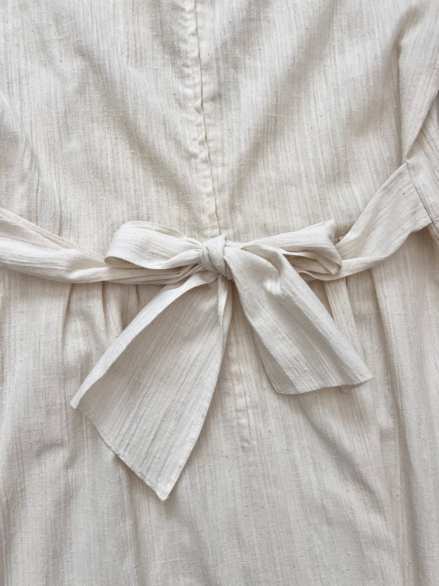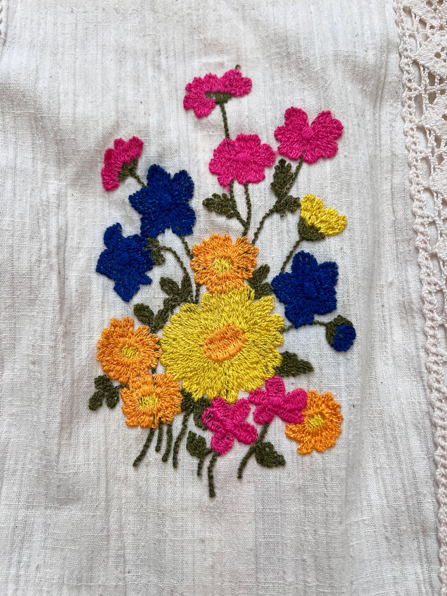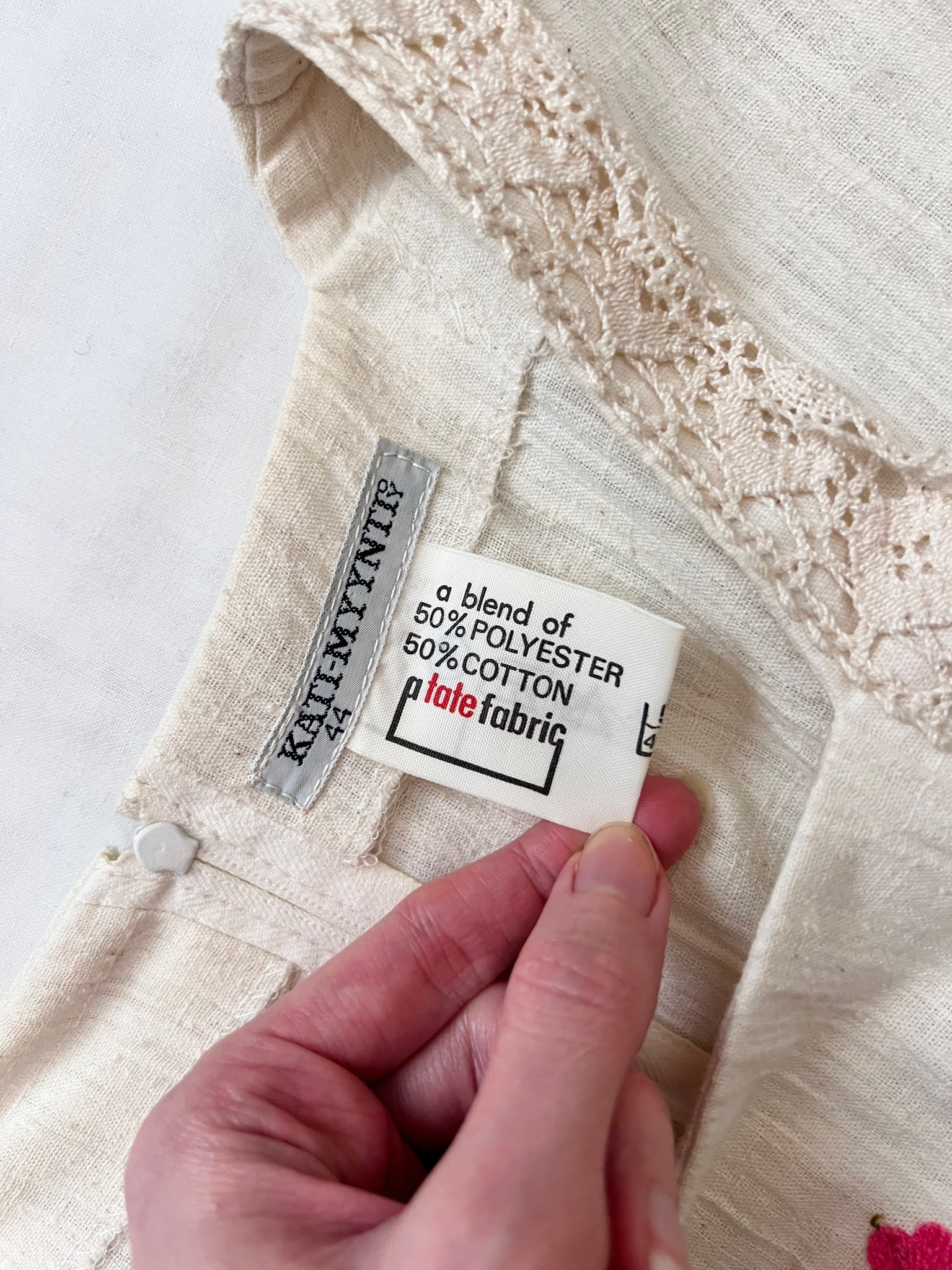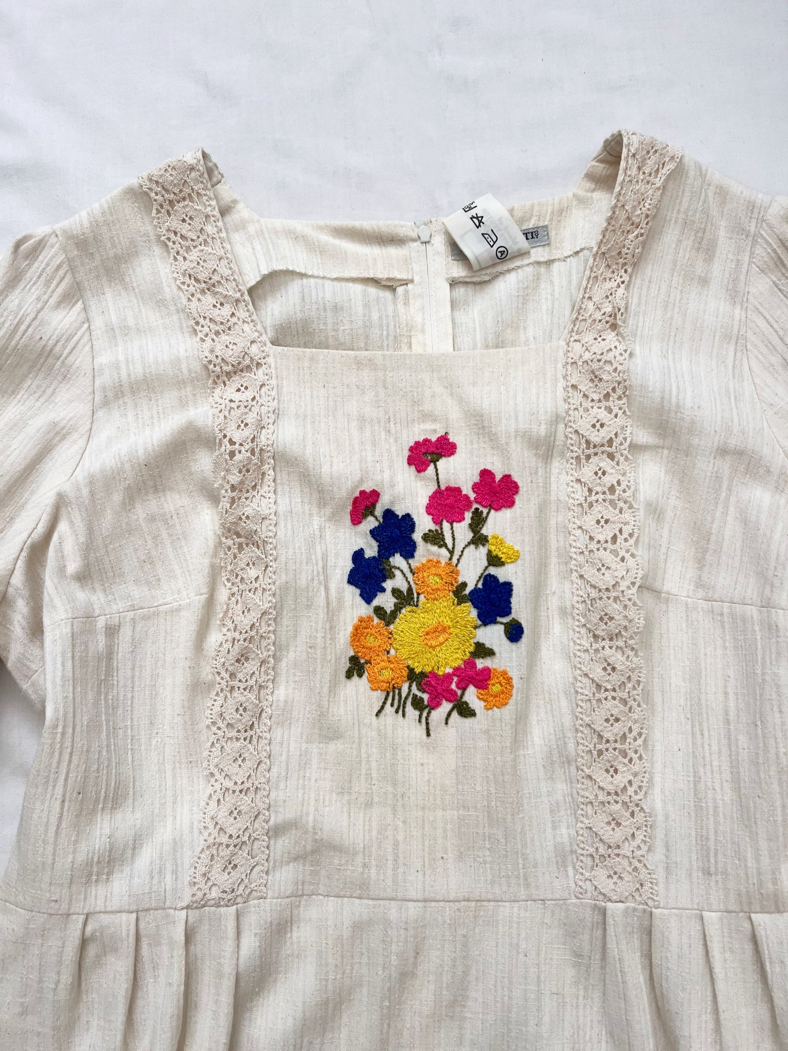 A cream colored midi dress with a square neckline framed by lace trim that runs vertically down the bodice. At the chest there is colorful floral embroidery. The sleeves are long and the cuffs have matching lace. At the back there is two strings that tie into a bow. There is a back zipper.