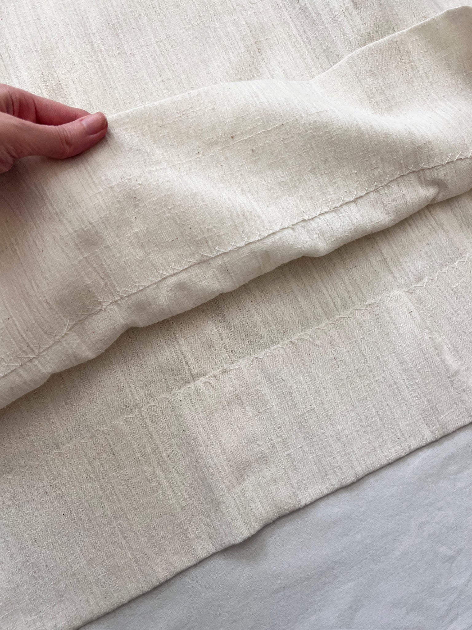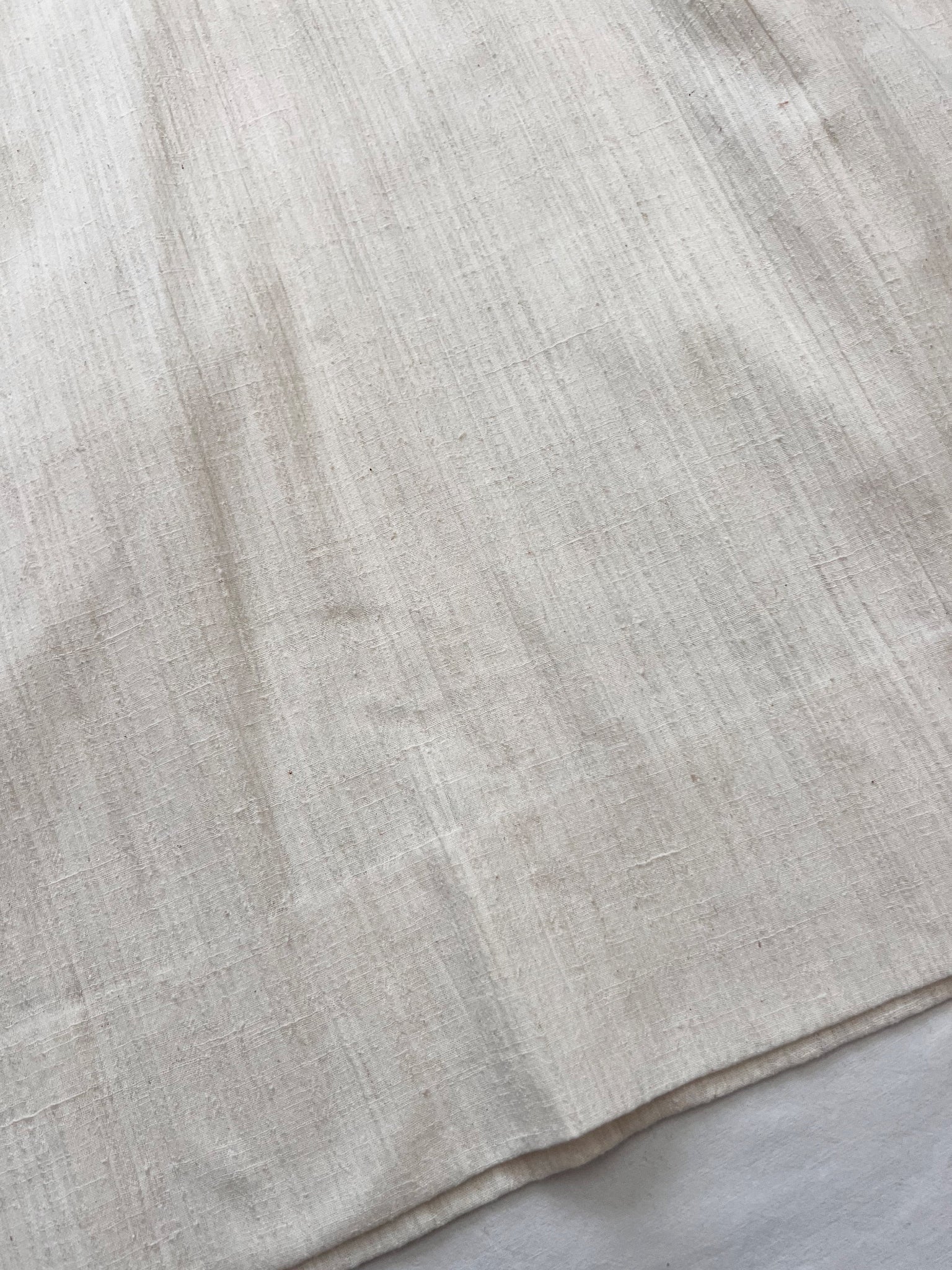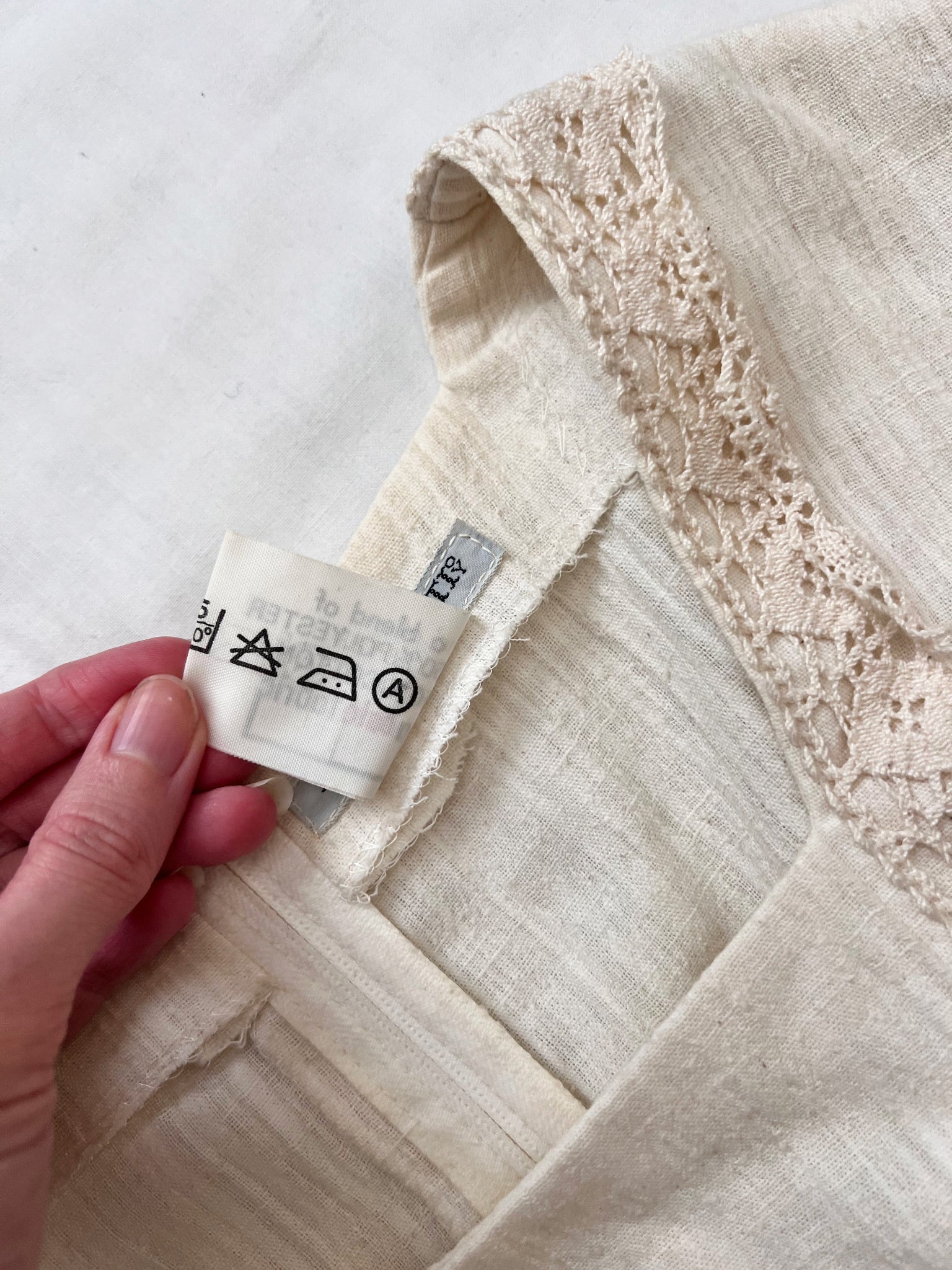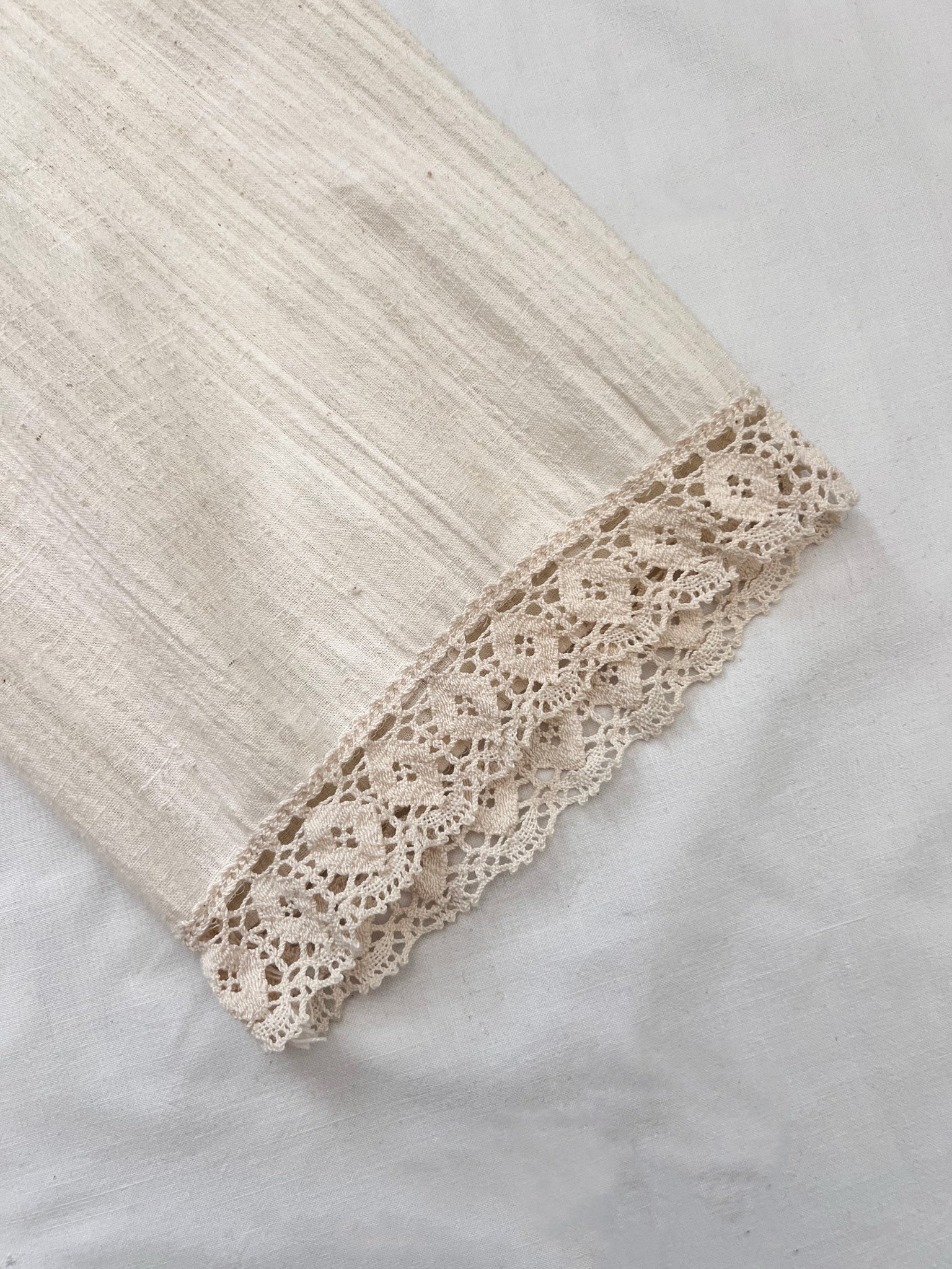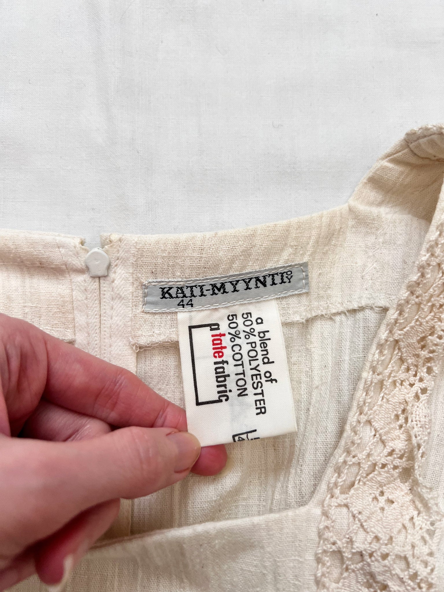 A cream colored midi dress with a square neckline framed by lace trim that runs vertically down the bodice. At the chest there is colorful floral embroidery. The sleeves are long and the cuffs have matching lace. At the back there is two strings that tie into a bow. There is a back zipper.