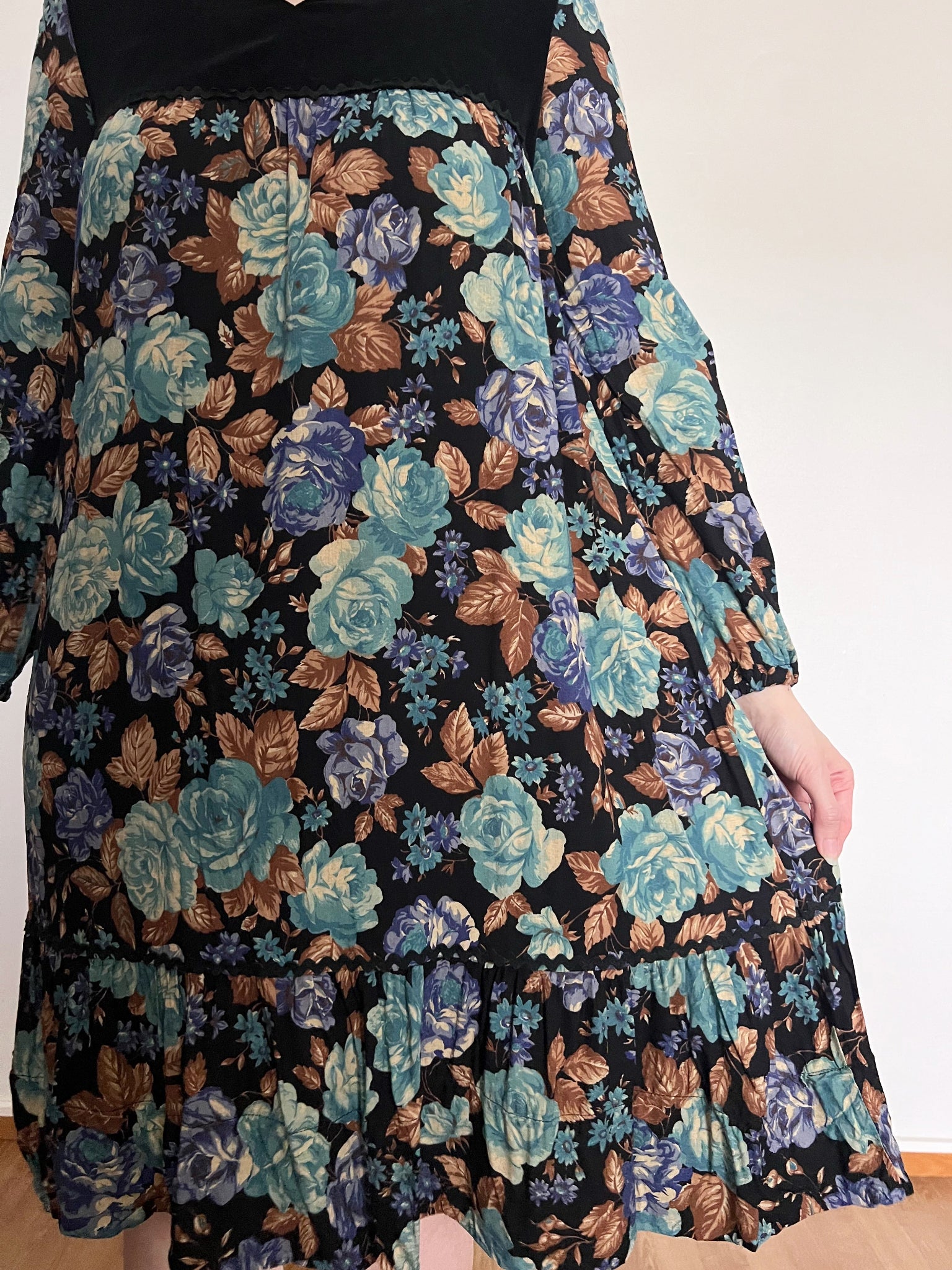 70s floral and black velvet dress, Size S
