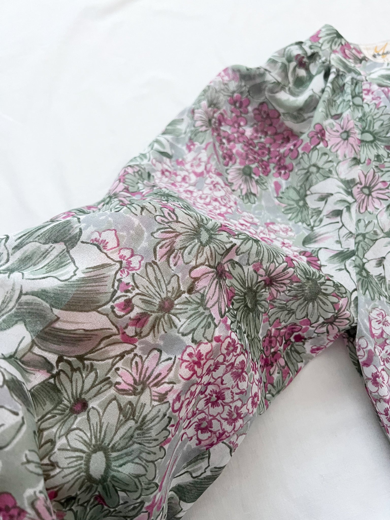A 70s dress with a floral print, a loose, gathered neckline and puffed, slightly sheer sleeves. The waist is cinched and the dress has a inside lining.
