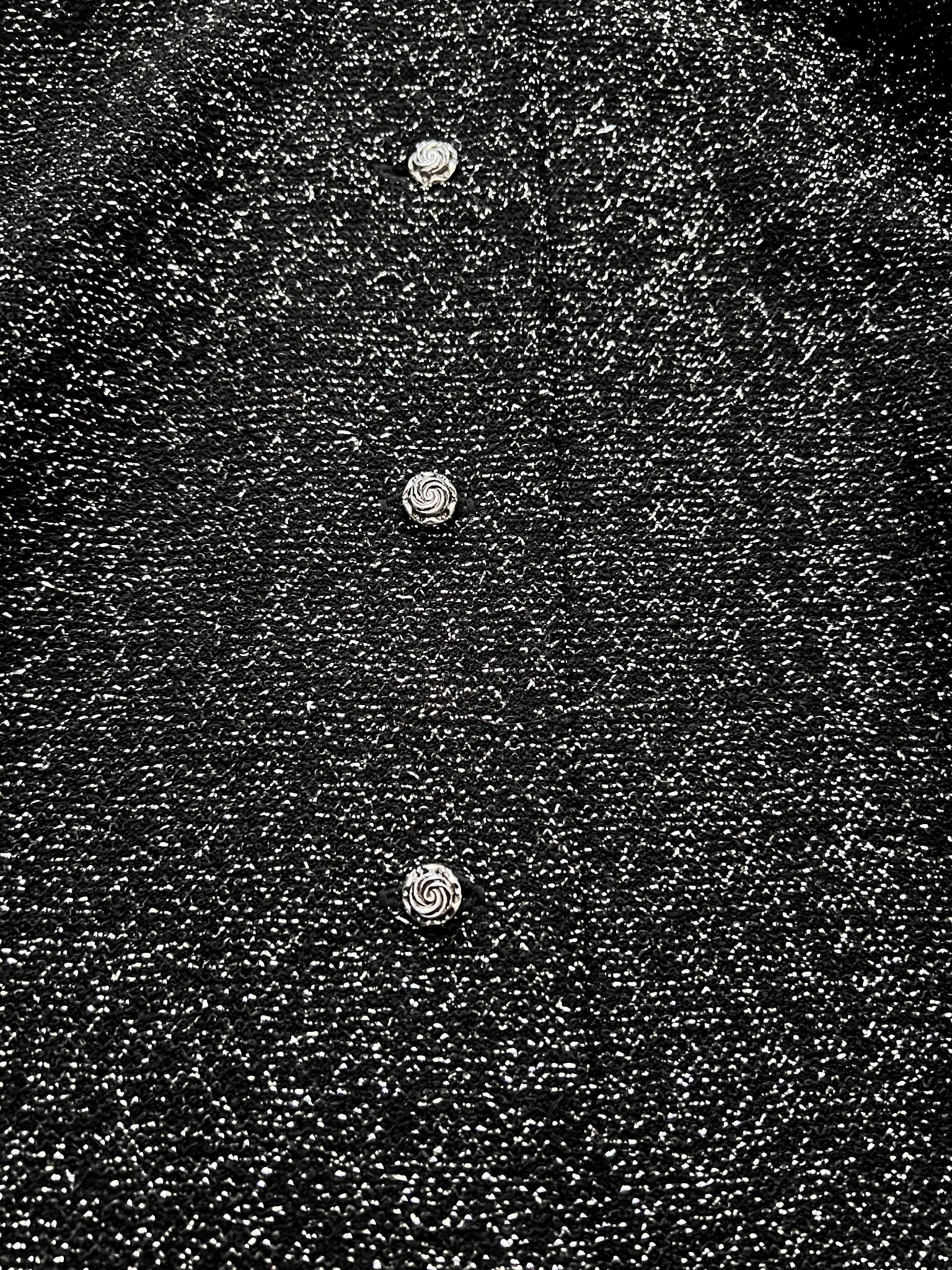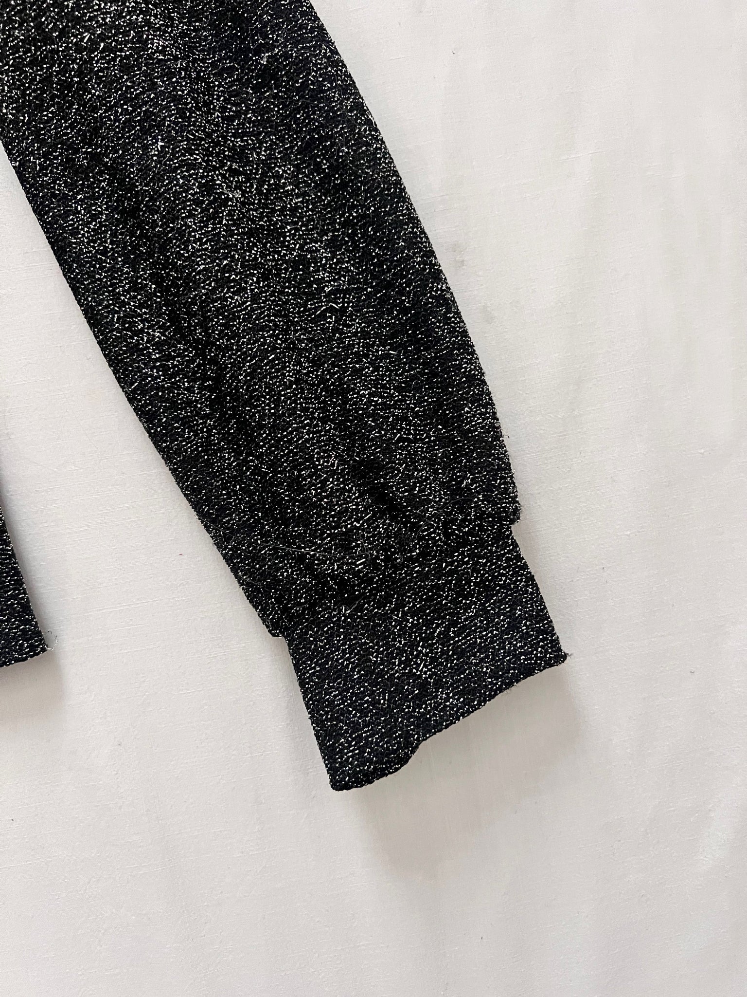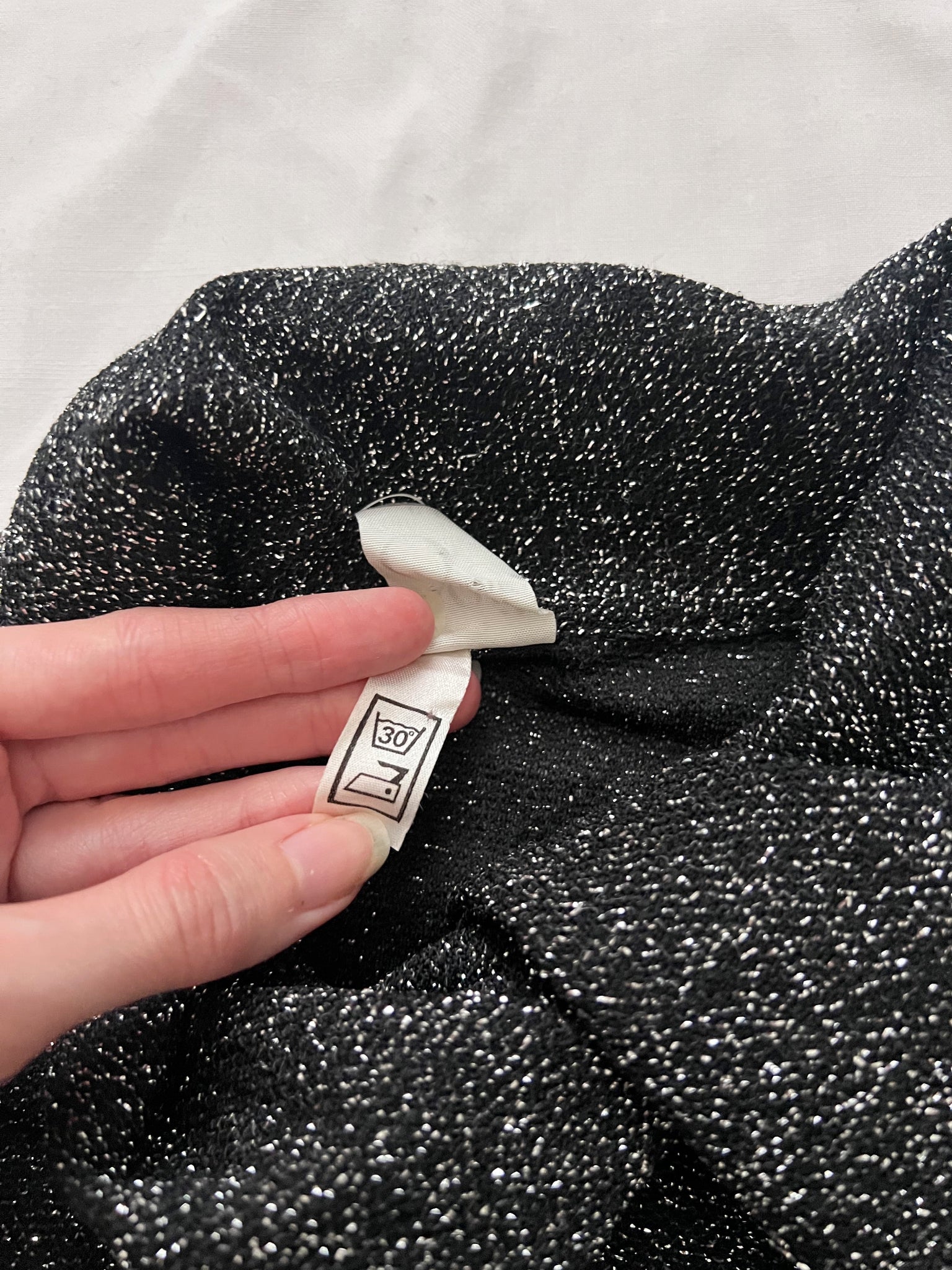 A long sleeved glittery black and silver blouse. The blouse has a high neckline with a tie detail than can be tied, and the buttons are small silver with a rosette design.