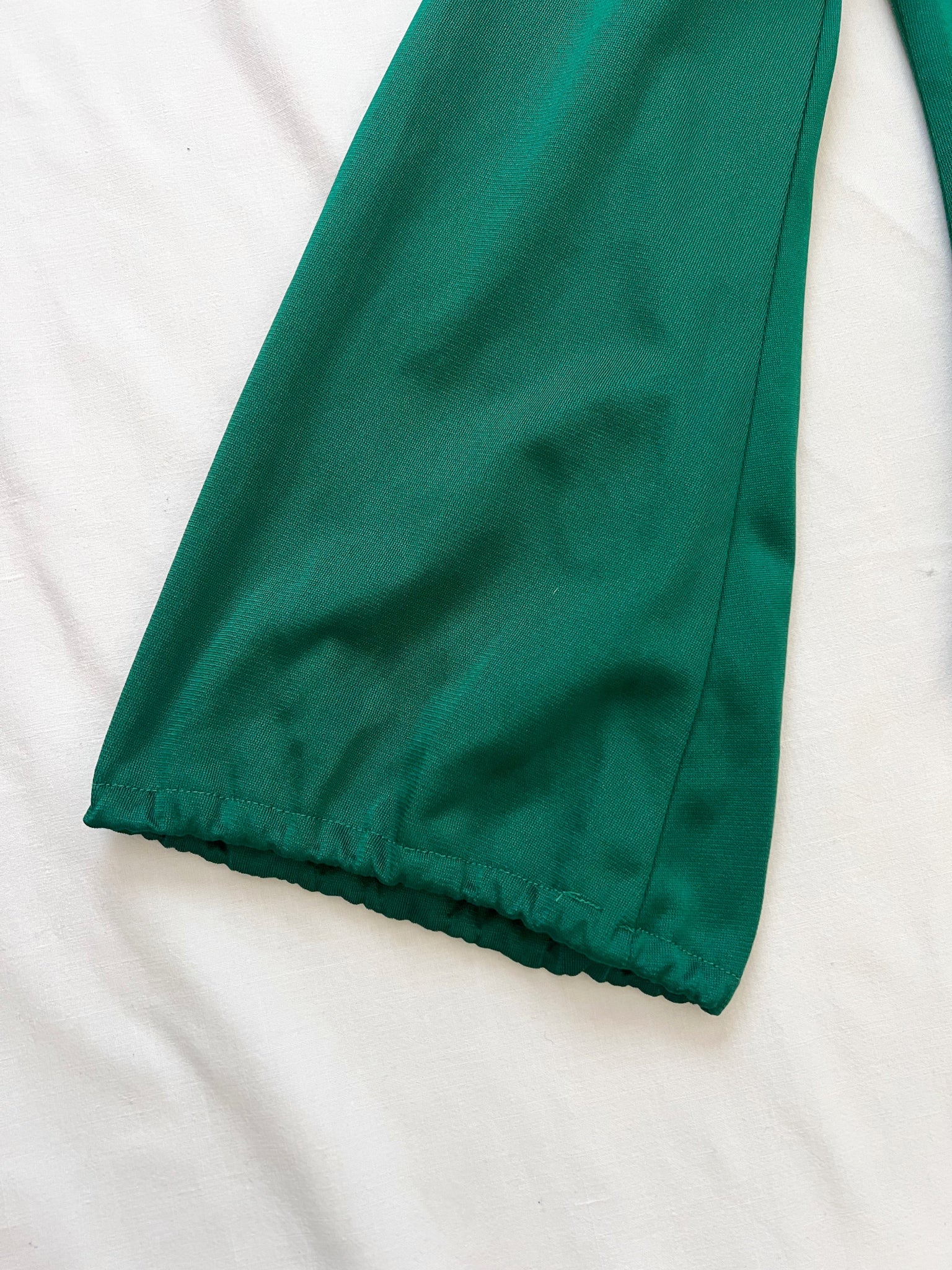 A rich green top with a fitted silhouette, a V-neckline with ruching at the center. The sleeves are long and flowy with a bell shape, flaring out toward the wrists.