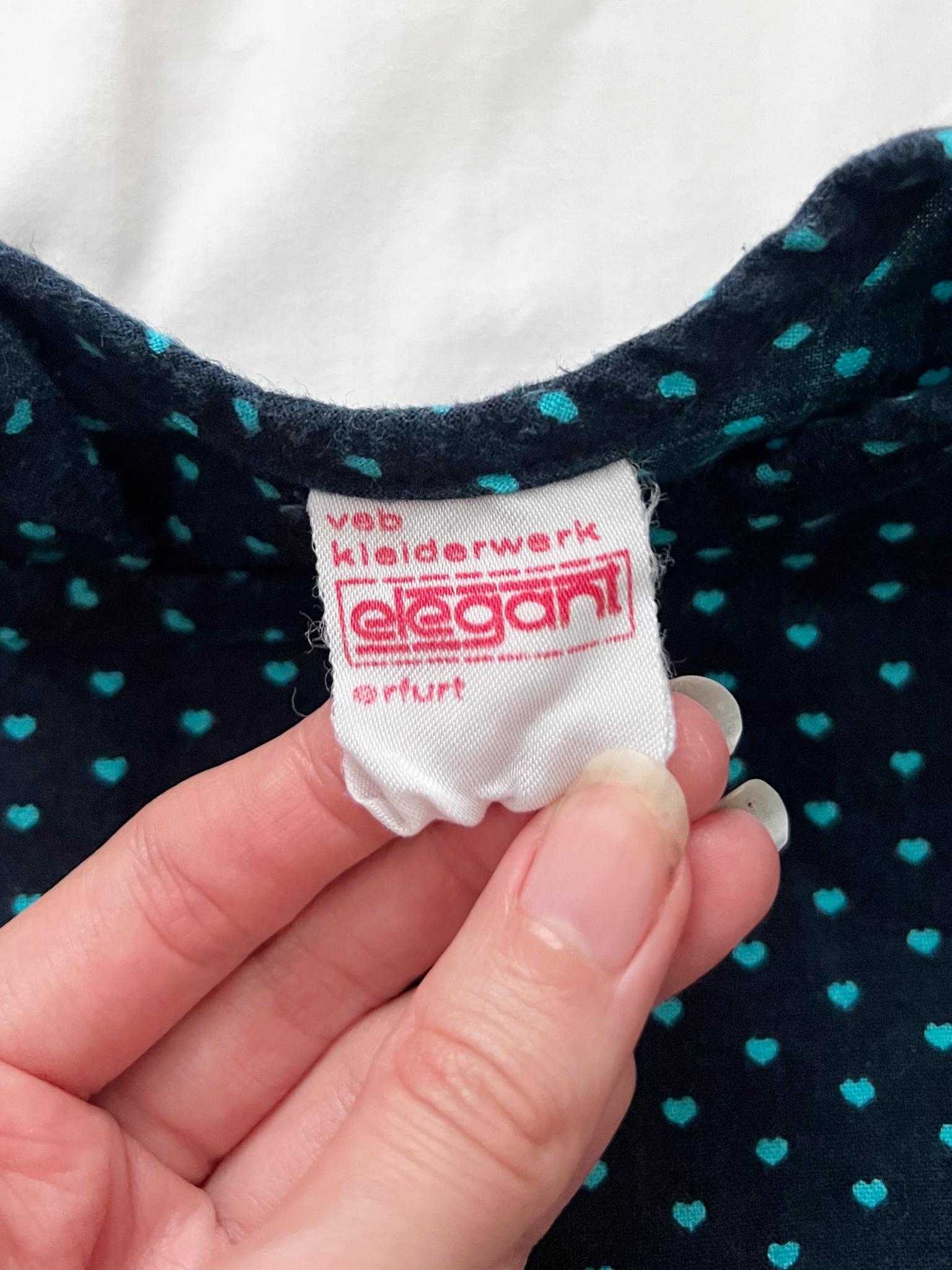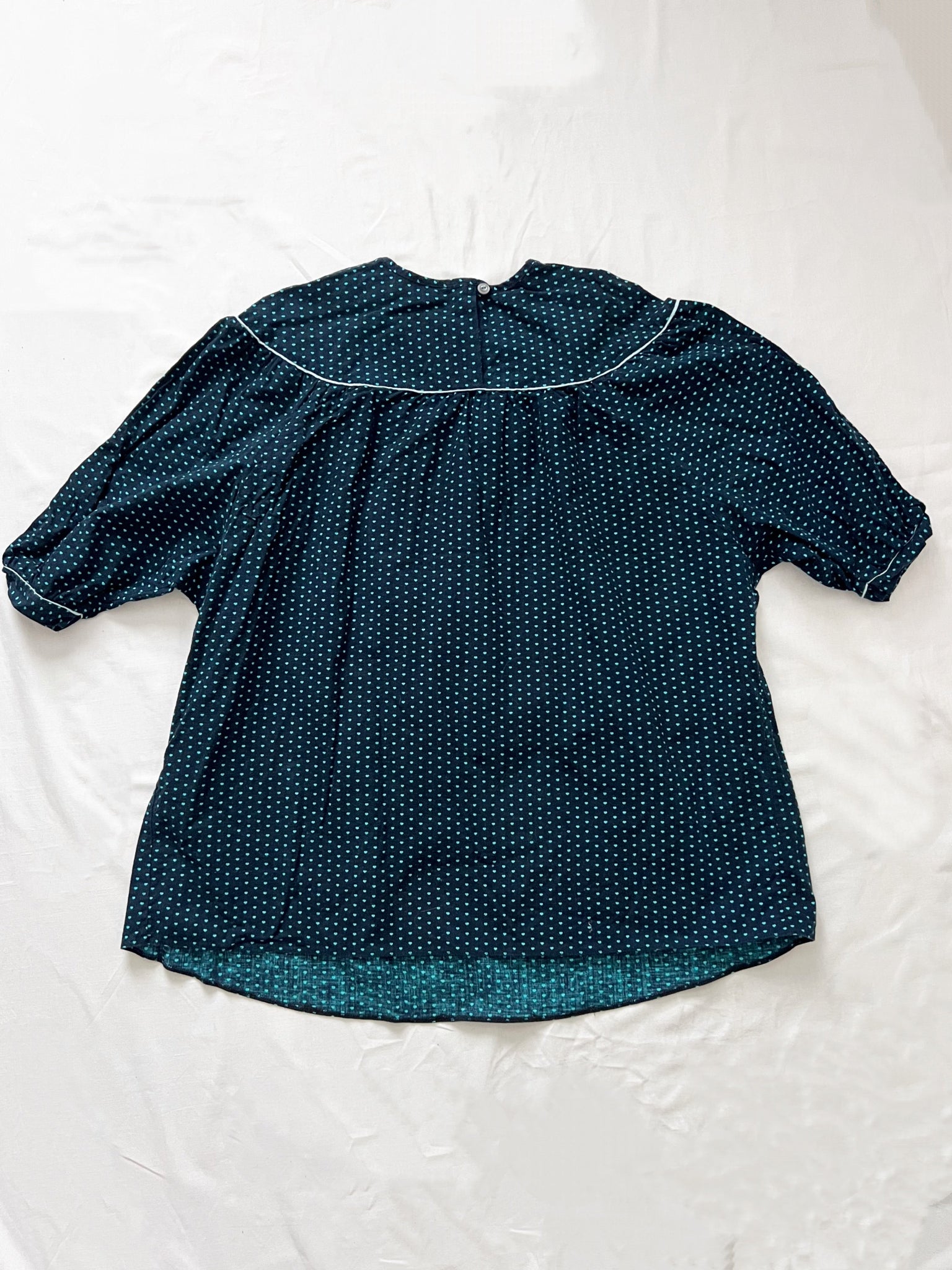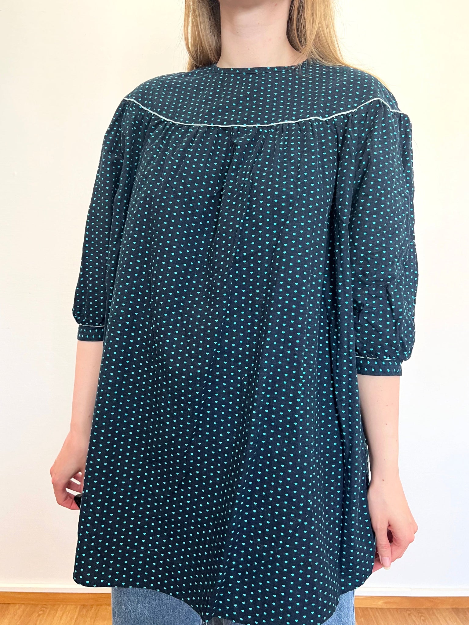 A loose fitting, possibly maternity, dark navy blouse with a pattern of small turquoise hearts. The neckline is high and rounded, bordered by a wide yoke that is slightly gathered below. The fabric is longer in the front and has a soft, almost fleece like texture on the outside.