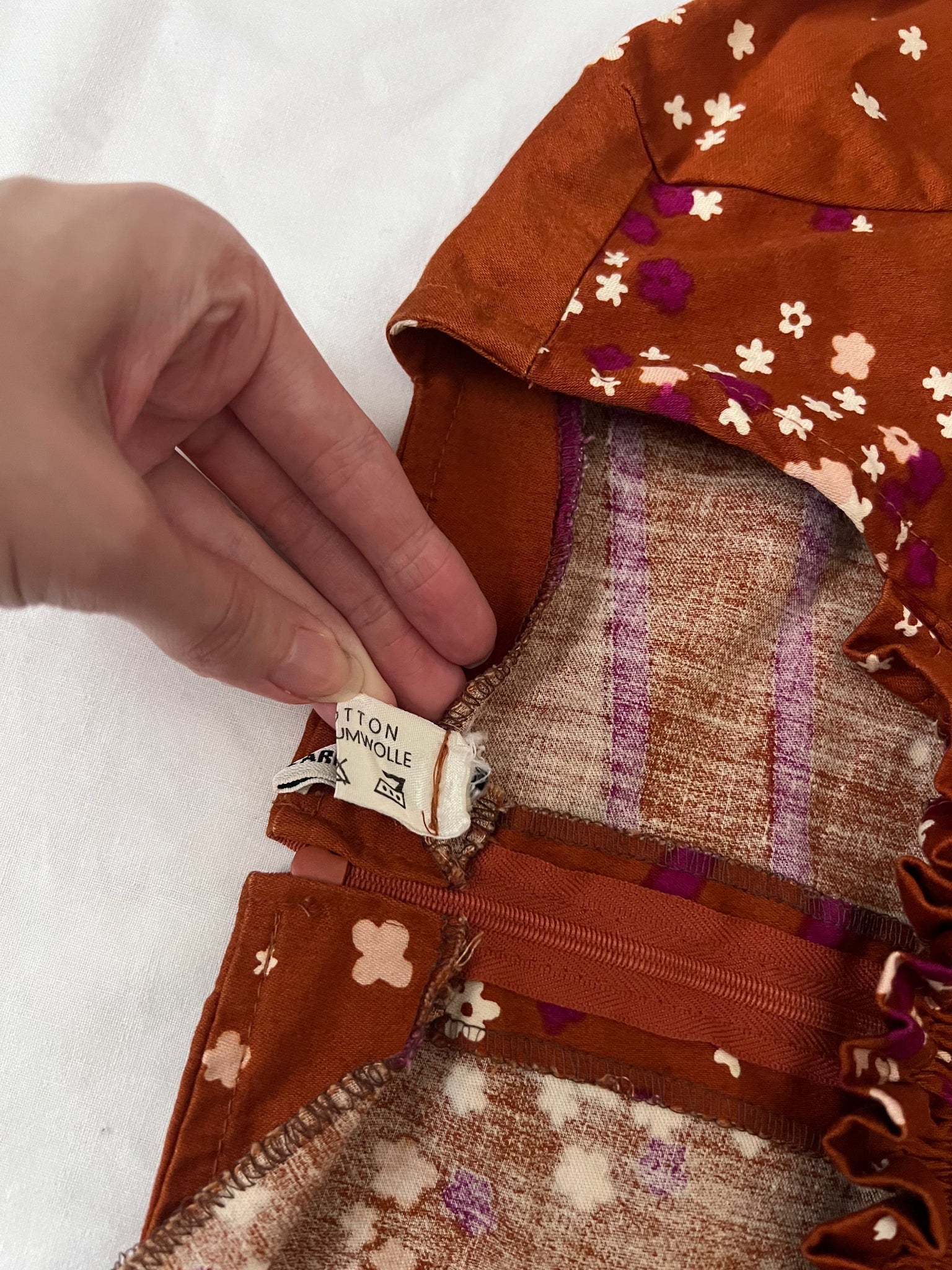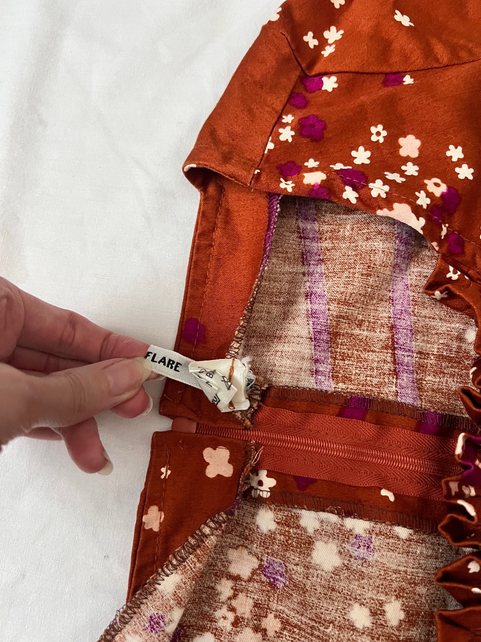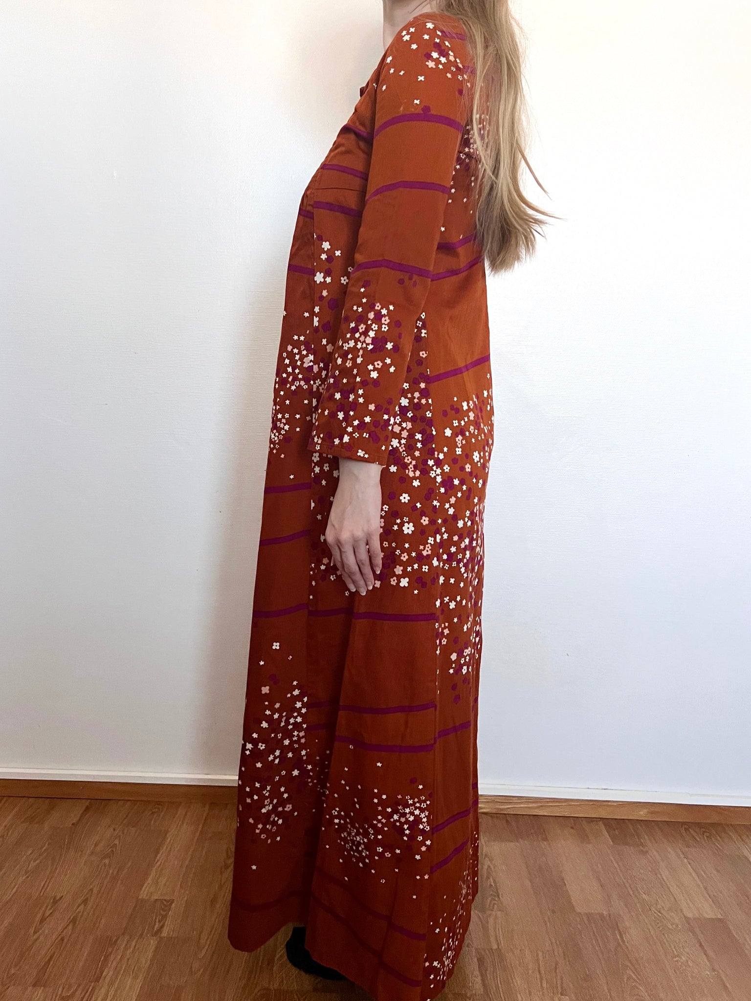 A maxi, flowing dress with a warm orange/brown base. The dress has long sleeves that slightly flare at the wrists. The bodice has a smocked section across the chest, and the neckline is square shaped. The dress has a pattern of small white, light orange, and purple flowers and purple lines. The dress has a back zipper.