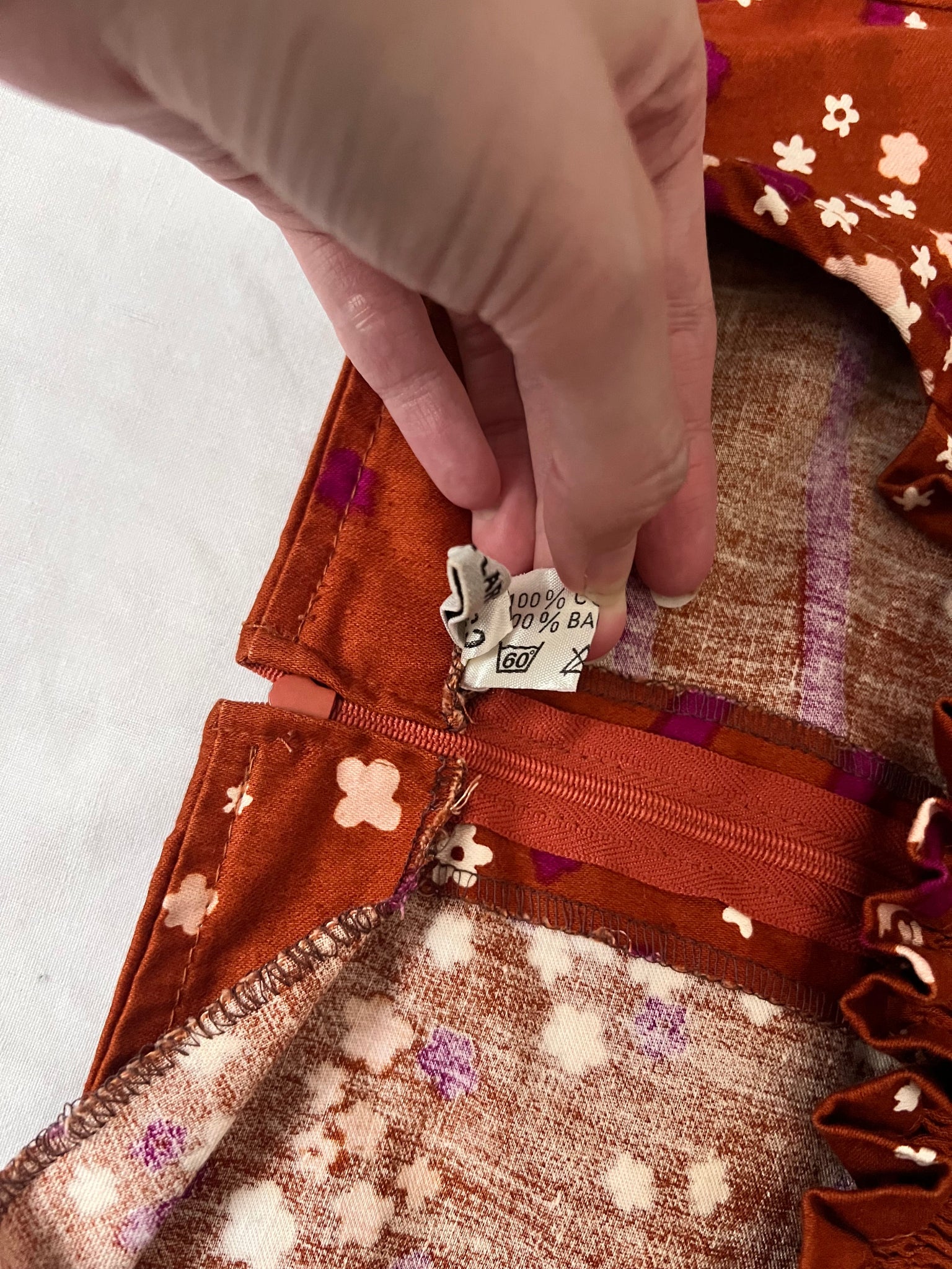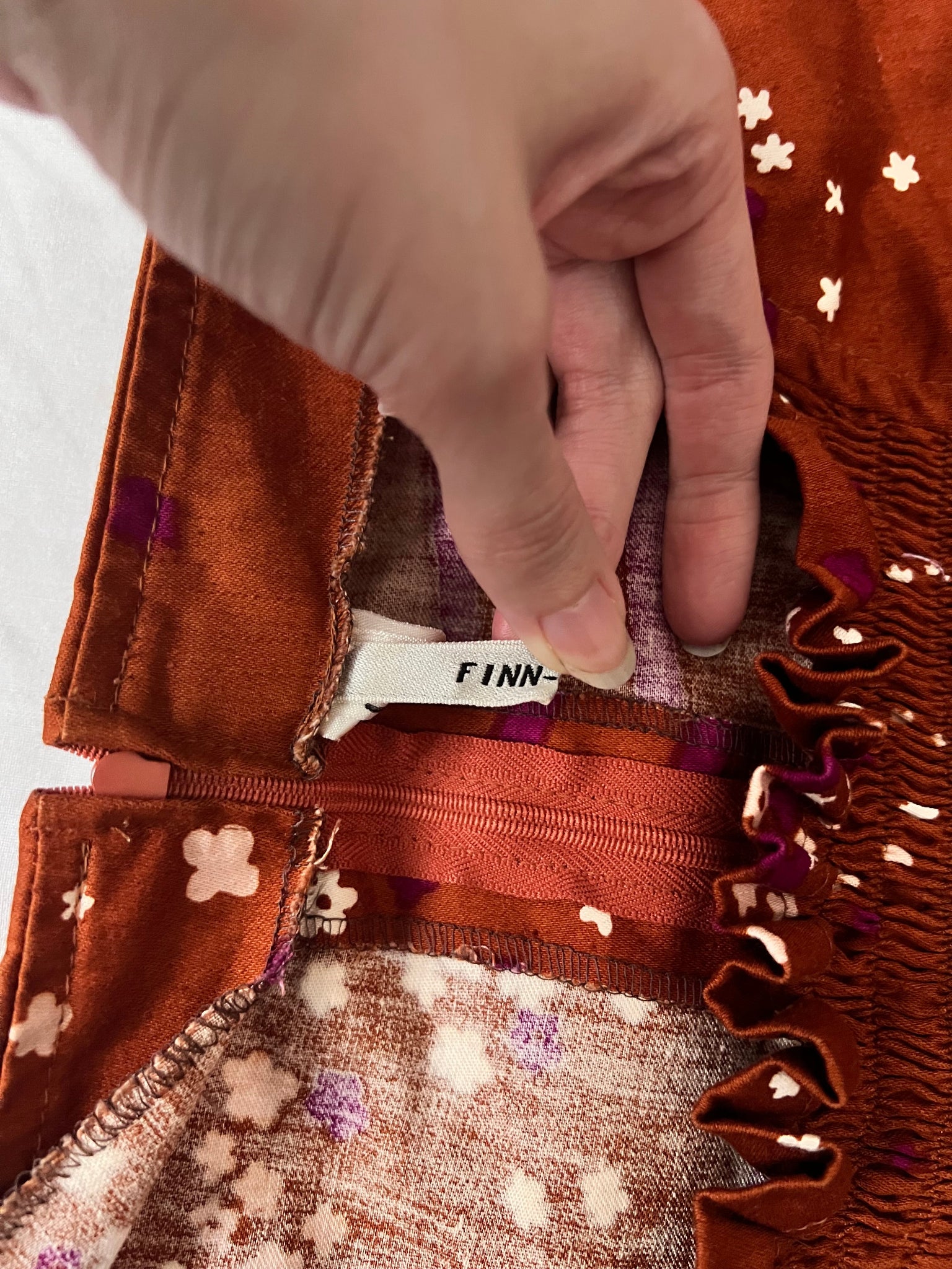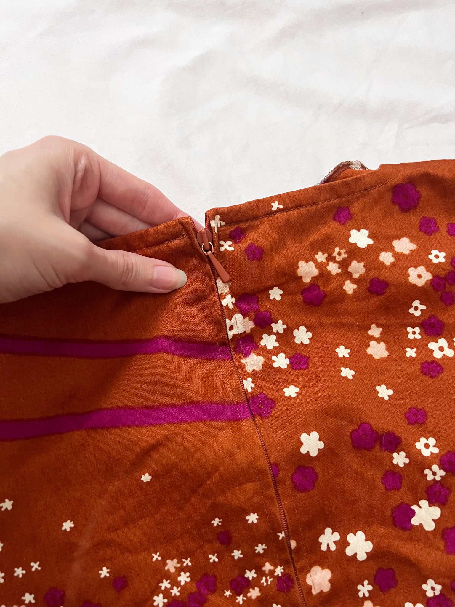 A maxi, flowing dress with a warm orange/brown base. The dress has long sleeves that slightly flare at the wrists. The bodice has a smocked section across the chest, and the neckline is square shaped. The dress has a pattern of small white, light orange, and purple flowers and purple lines. The dress has a back zipper.