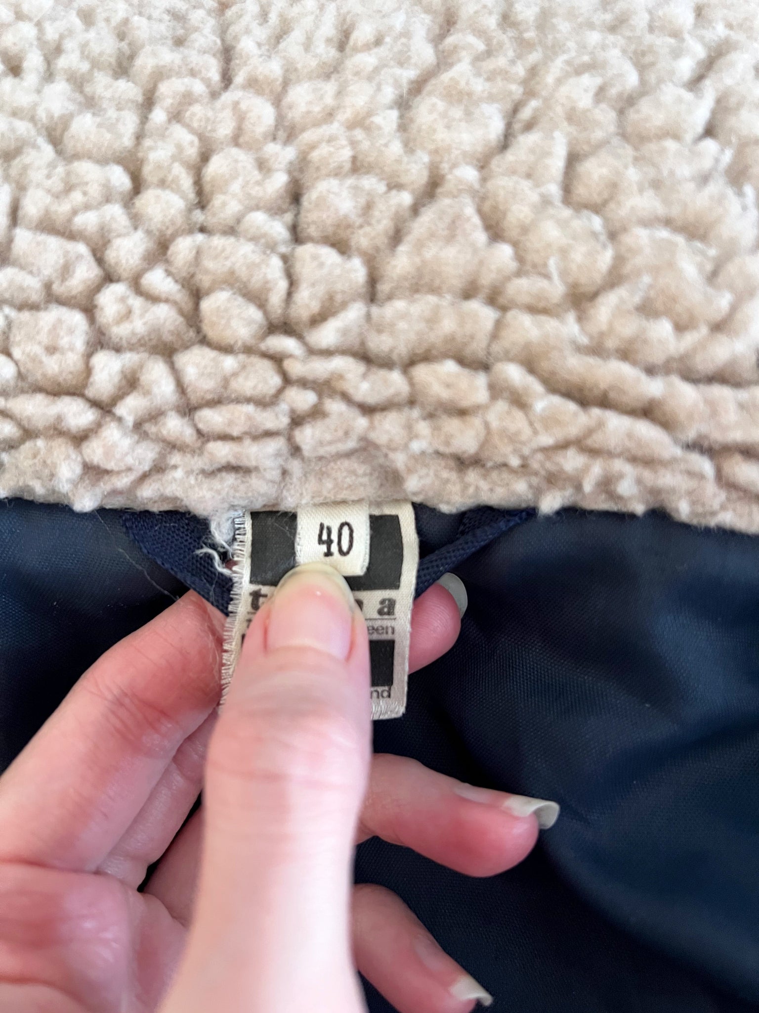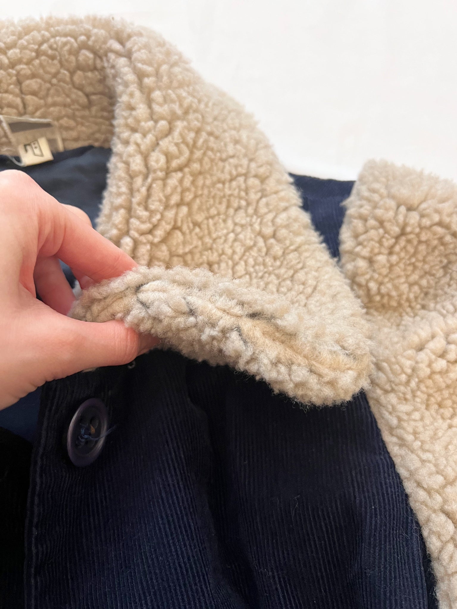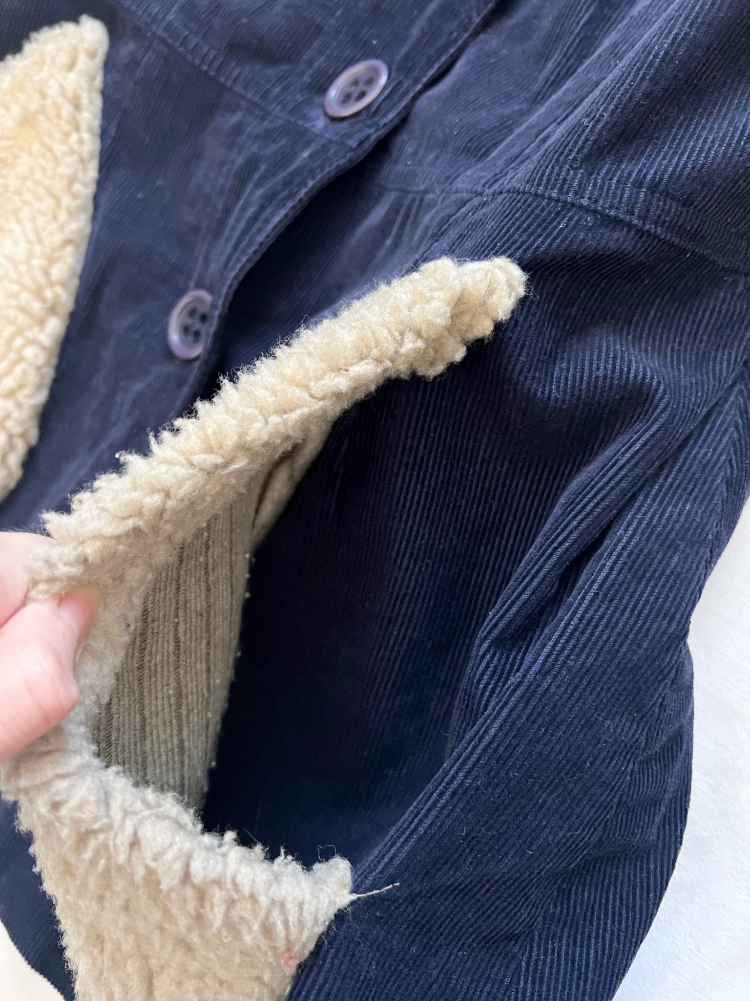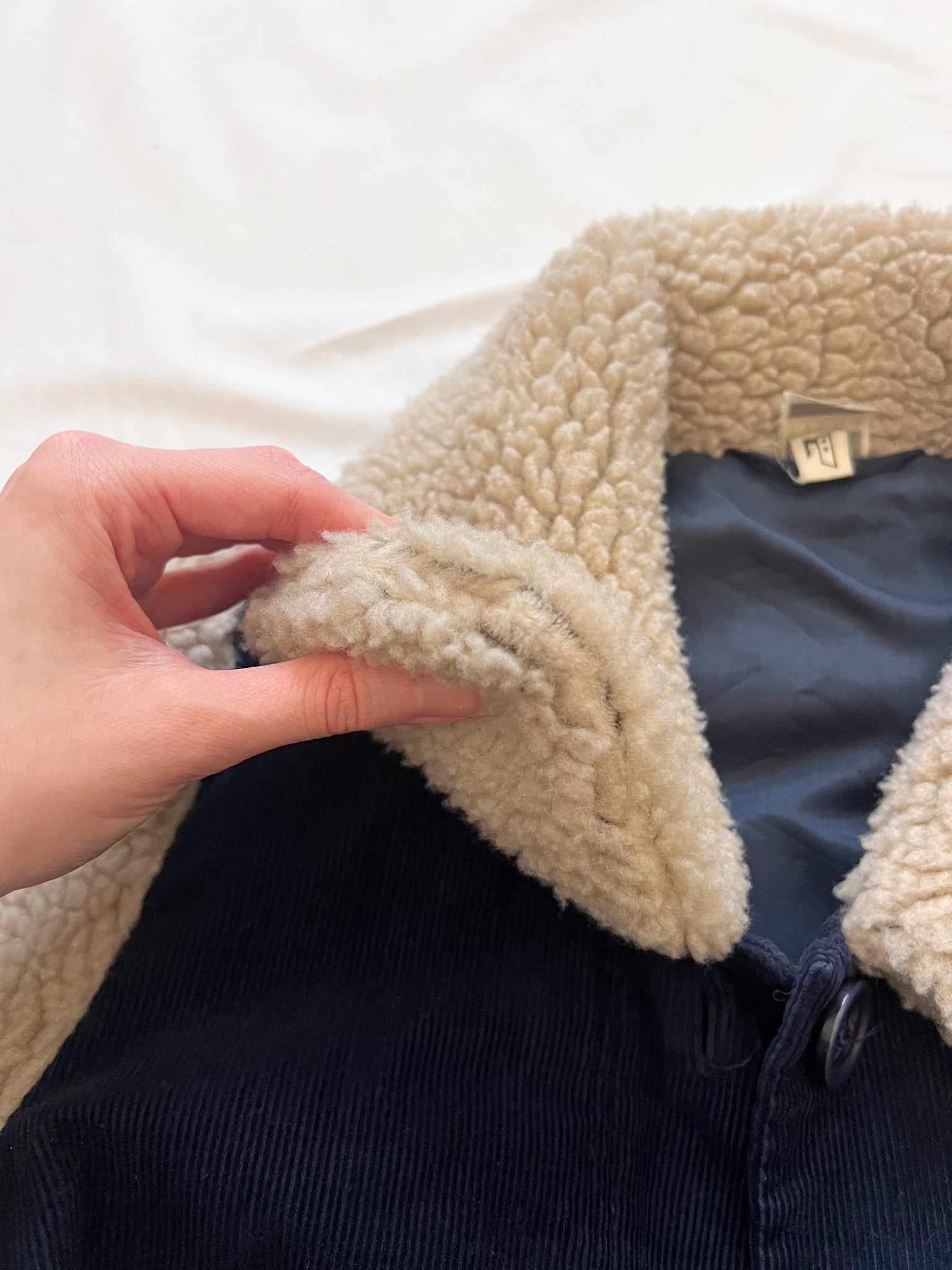 A dark navy corduroy jacket with beige sherpa fabric on the collar, sleeves, and big patch pockets. The jacket has matching blue buttons down the front.