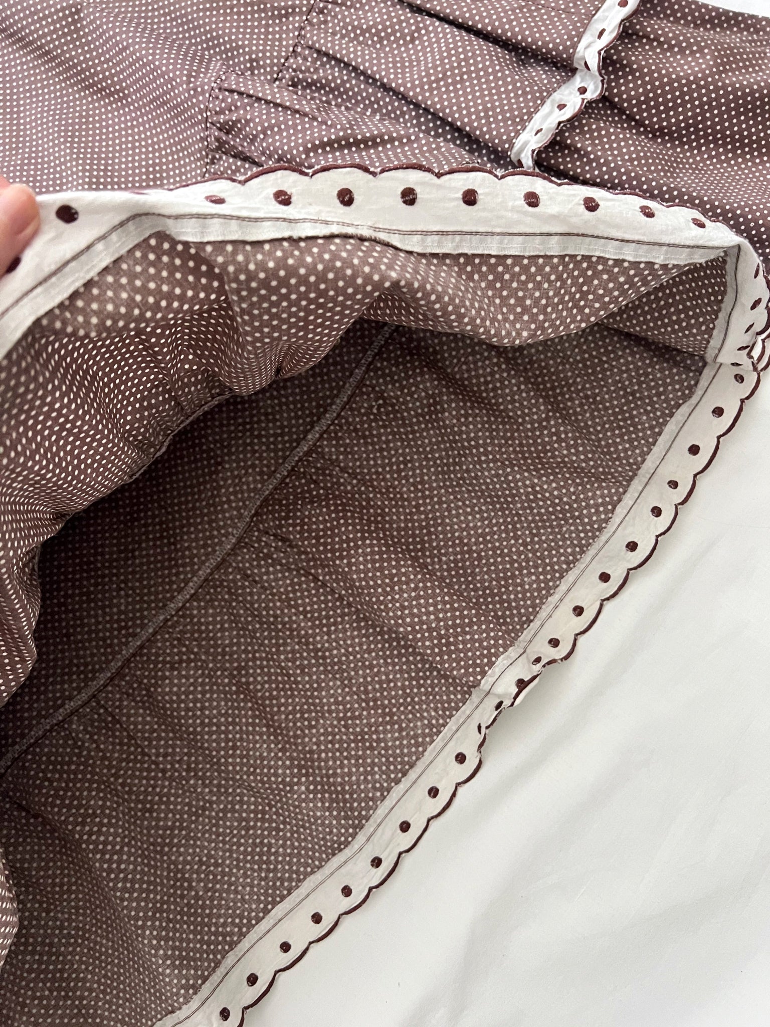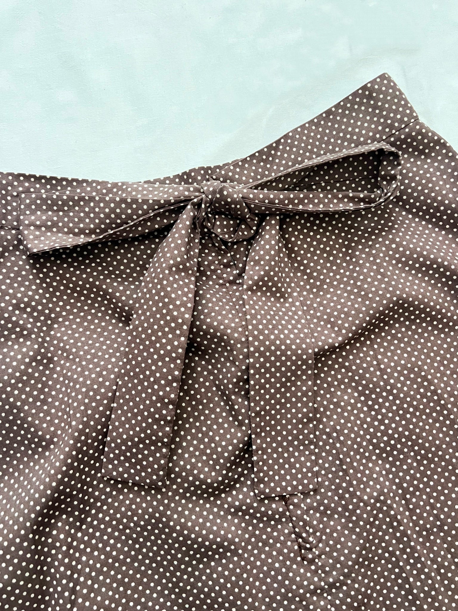 A brown flowy maxi skirt with a small white polka dot pattern. At the bottom there is ruffles edged with a white band with a brown polka dot pattern. At the back of the skirt there are two ties that tie into a bow, there is also a back zipper.