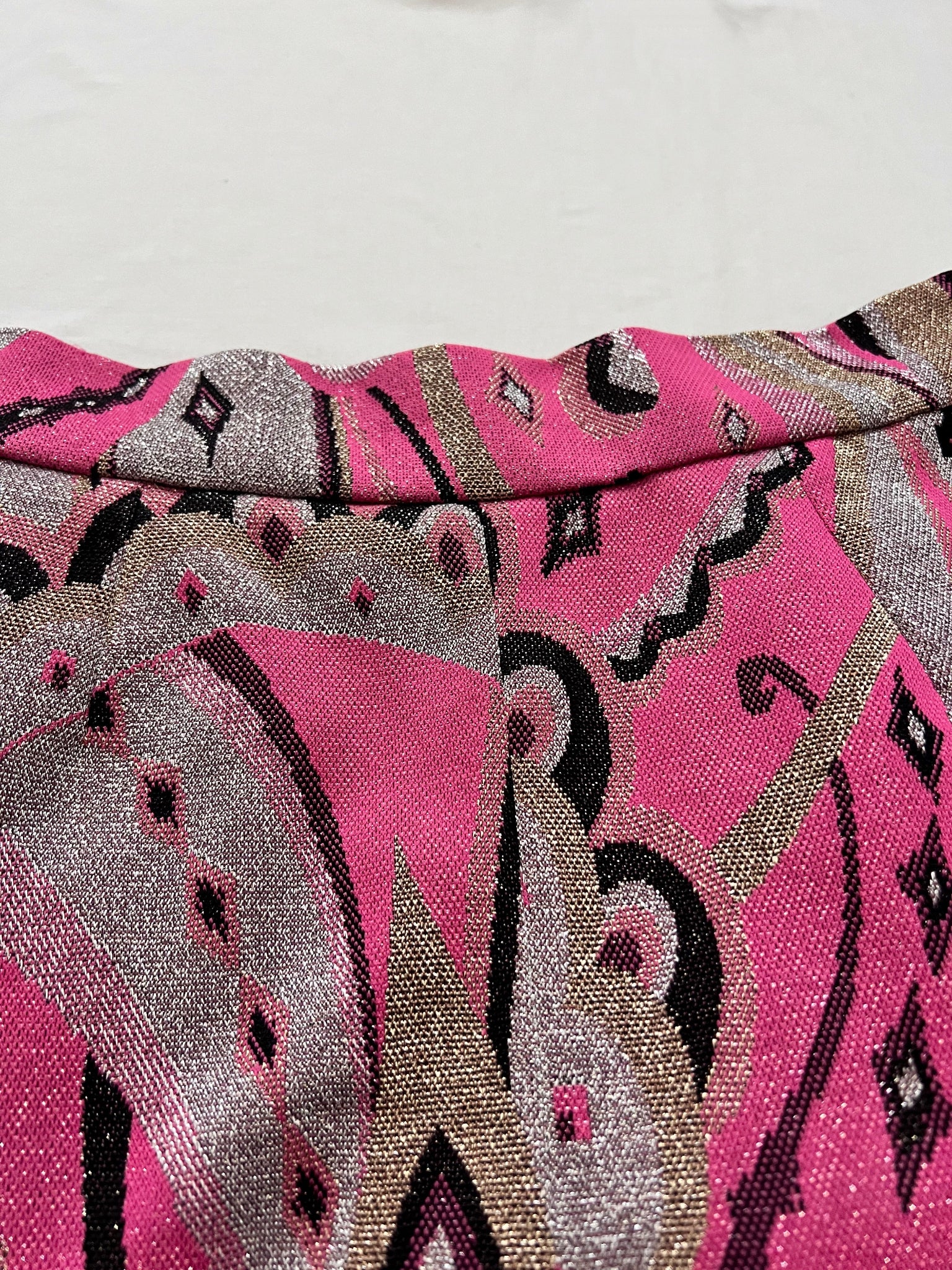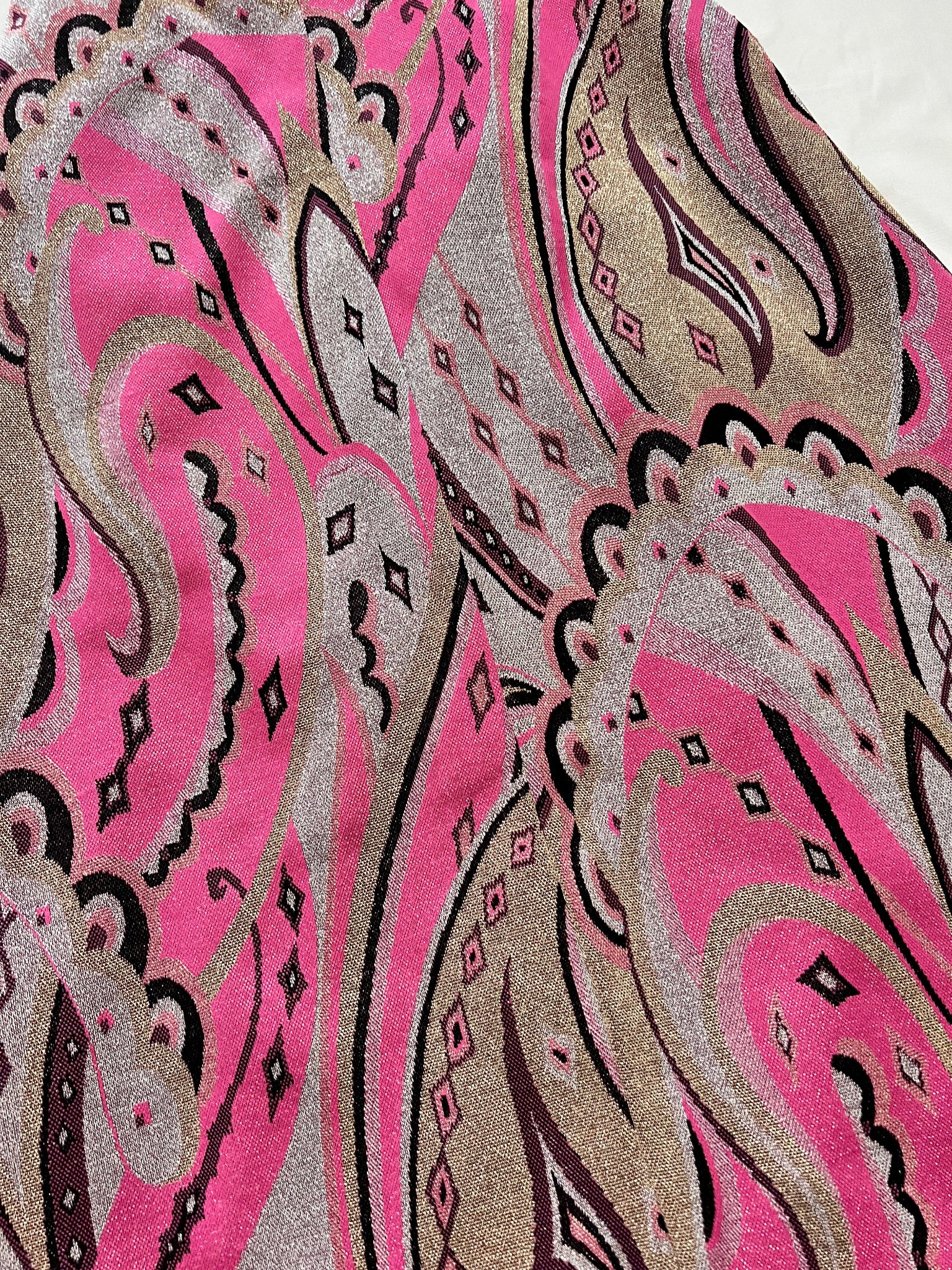A maxi high waisted glittery skirt. The skirt has a wide waistband, a paisley pattern mainly in pink, black and silver. The skirt has a zipper.