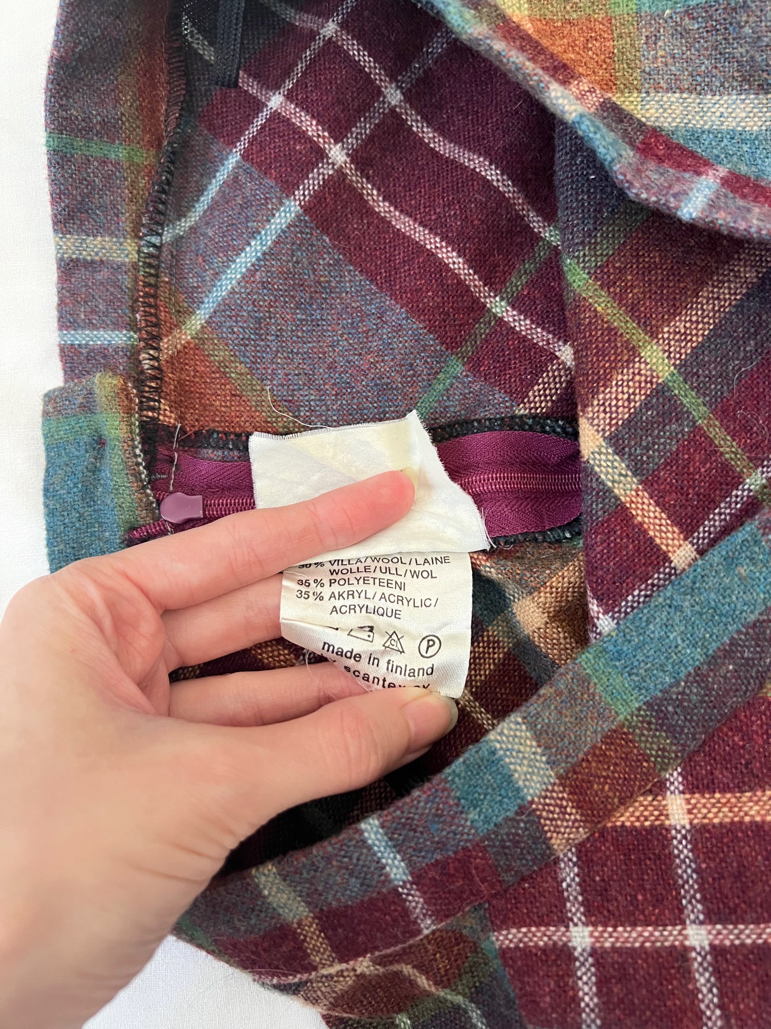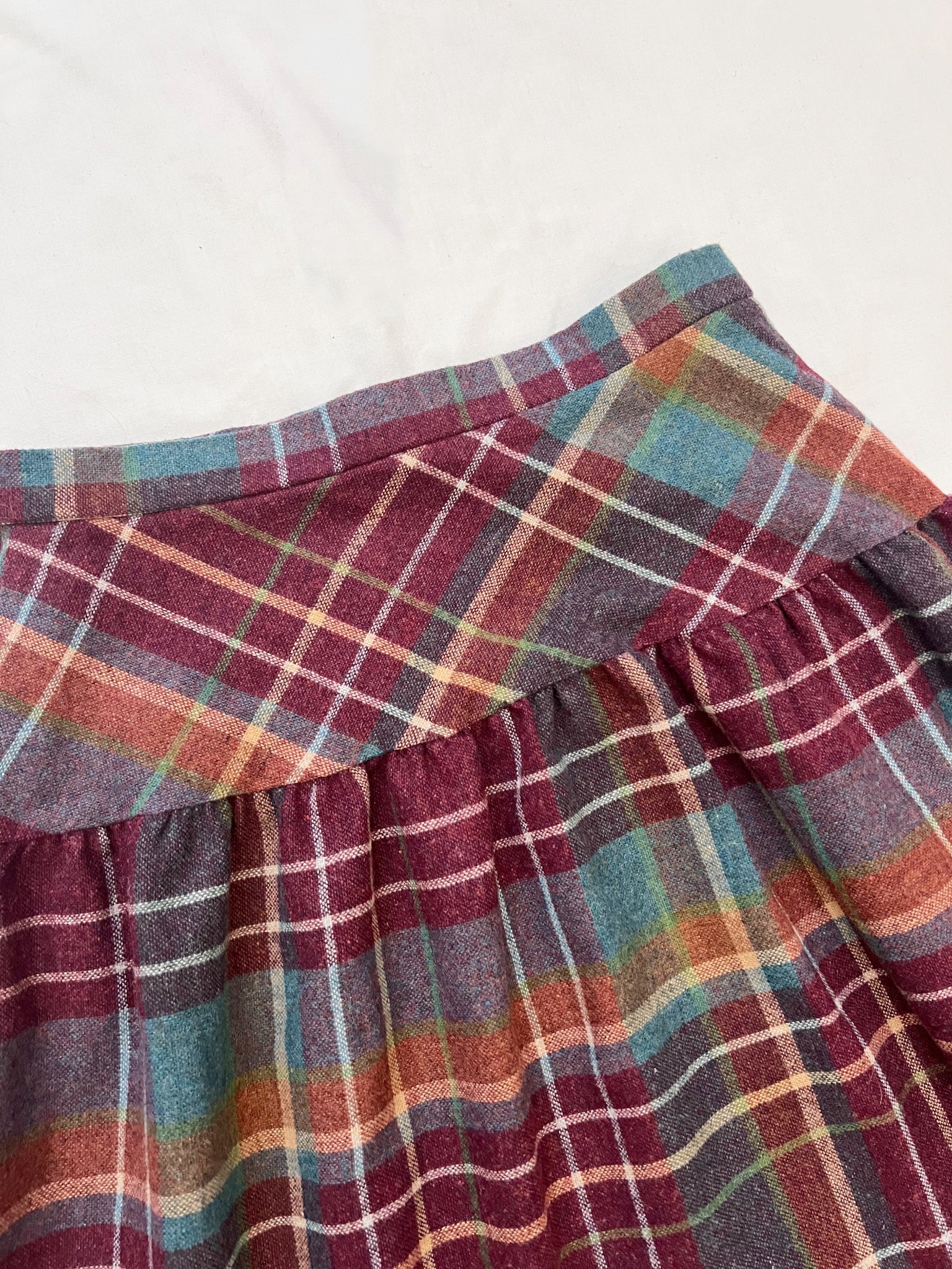 A high waisted midi length skirt in a plaid fabric. The plaid pattern is mainly burgundy tones, with lines of teal, mustard, and white. The skirt is gathered just below the waistband, and at the hem there is a ruffled edge. The skirt has a zipper.
