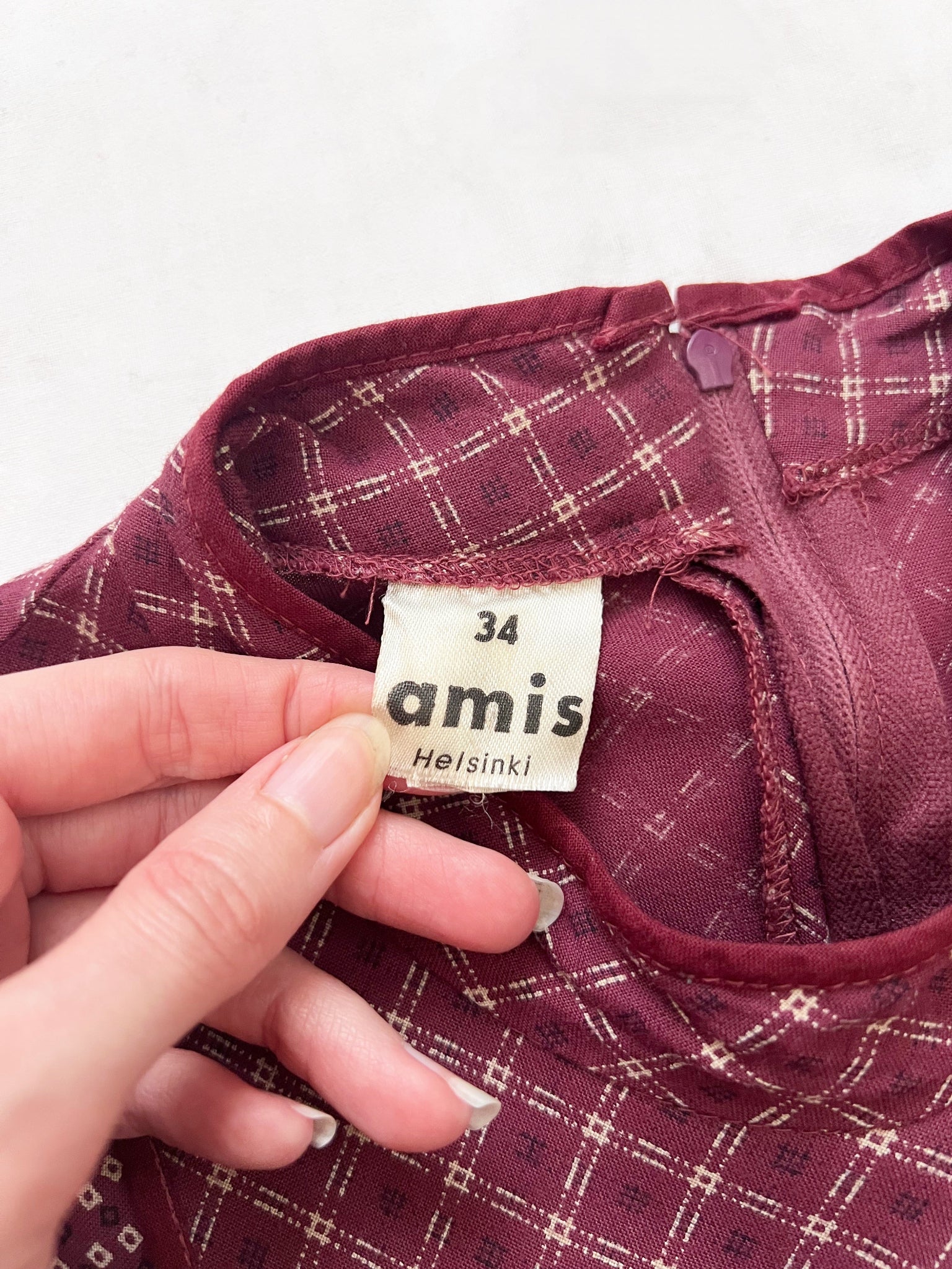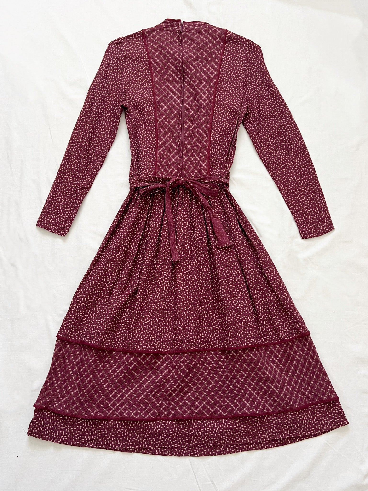 A prairie inspired burgundy long sleeve midi dress with a high neckline, a belt that ties into a bow at the back, and two side pockets. The sleeves are puffed at the shoulders.
